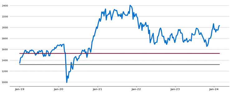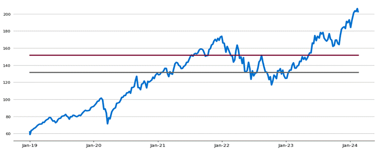 The following graph sets forth the daily historical performance of the XLK in the period from January 2, 2019 through February 16, 2024. We obtained this historical data from Bloomberg L.P. We have not independently verified the accuracy or completeness of the information obtained from Bloomberg L.P. The horizontal crimson line in the graph represents the XLK’s hypothetical Coupon Barrier of $151.93 (rounded to two decimal places), which is 75% of the XLK’s hypothetical Starting Value of $202.57, which was its Closing Market Price on February 16, 2024. The horizontal gray line in the graph represents the XLK’s hypothetical Threshold Value of $131.67 (rounded to two decimal places), which is 65% of the XLK’s hypothetical Starting Value. The actual Starting Value, Coupon Barrier and Threshold Value will be determined on the pricing date.