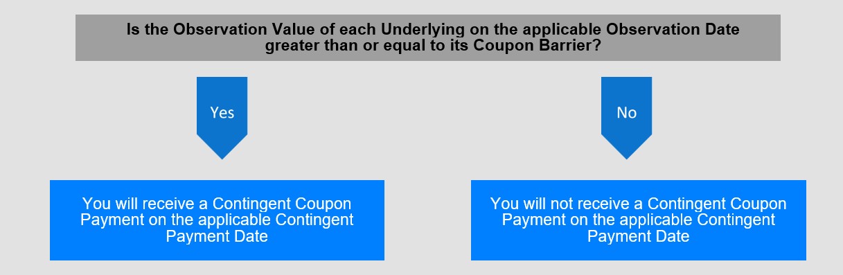 The Notes provide a monthly Contingent Coupon Payment of $9.792 per $1,000 in principal amount of Notes on the applicable Contingent Payment Date if, on the related monthly Observation Date, the Observation Value of each Underlying is greater than or equal to its Coupon Barrier.