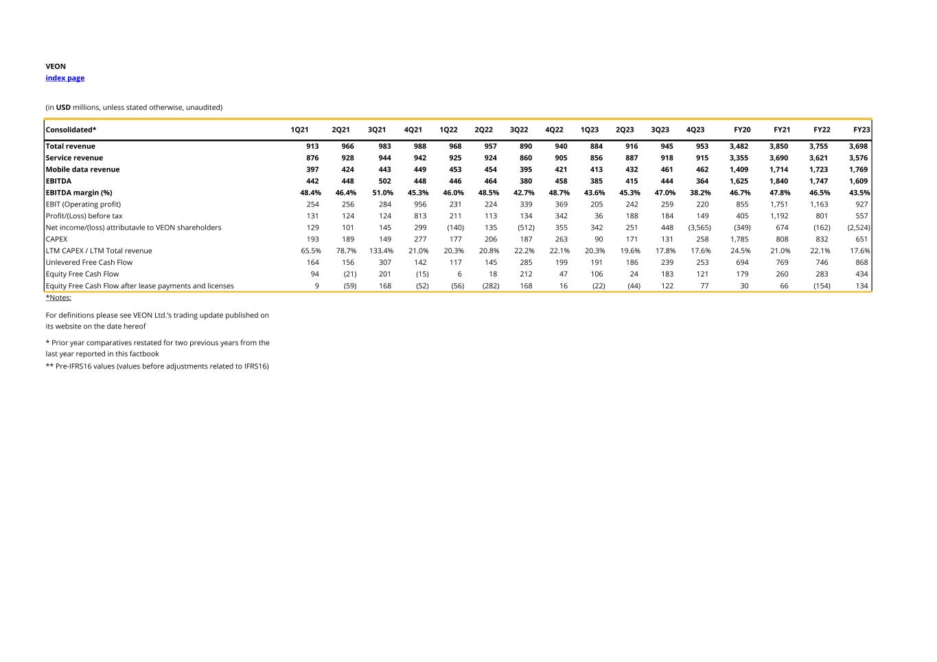 VEON index page (in USD millions, unless stated otherwise, unaudited) Consolidated* 1Q21 2Q21 3Q21 4Q21 1Q22 2Q22 3Q22 4Q22 1Q23 2Q23 3Q23 4Q23 FY20 FY21 FY22 FY23 Total revenue 913 966 983 988 968 957 890 940 884 916 945 953 3,482 3,850 3,755 3,698 Service revenue 876 928 944 942 925 924 860 905 856 887 918 915 3,355 3,690 3,621 3,576 Mobile data revenue 397 424 443 449 453 454 395 421 413 432 461 462 1,409 1,714 1,723 1,769 EBITDA 442 448 502 448 446 464 380 458 385 415 444 364 1,625 1,840 1,747 1,609 EBITDA margin (%) 48.4% 46.4% 51.0% 45.3% 46.0% 48.5% 42.7% 48.7% 43.6% 45.3% 47.0% 38.2% 46.7% 47.8% 46.5% 43.5% EBIT (Operating profit) 254 256 284 956 231 224 339 369 205 242 259 220 855 1,751 1,163 927 Profit/(Loss) before tax 131 124 124 813 211 113 134 342 36 188 184 149 405 1,192 801 557 Net income/(loss) attributavle to VEON shareholders 129 101 145 299 (140) 135 (512) 355 342 251 448 (3,565) (349) 674 (162) (2,524) CAPEX 193 189 149 277 177 206 187 263 90 171 131 258 1,785 808 832 651 LTM CAPEX / LTM Total revenue 65.5% 78.7% 133.4% 21.0% 20.3% 20.8% 22.2% 22.1% 20.3% 19.6% 17.8% 17.6% 24.5% 21.0% 22.1% 17.6% Unlevered Free Cash Flow 164 156 307 142 117 145 285 199 191 186 239 253 694 769 746 868 Equity Free Cash Flow 94 (21) 201 (15) 6 18 212 47 106 24 183 121 179 260 283 434 Equity Free Cash Flow after lease payments and licenses 9 (59) 168 (52) (56) (282) 168 16 (22) (44) 122 77 30 66 (154) 134 *Notes: For definitions please see VEON Ltd.’s trading update published on its website on the date hereof * Prior year comparatives restated for two previous years from the last year reported in this factbook ** Pre-IFRS16 values (values before adjustments related to IFRS16)