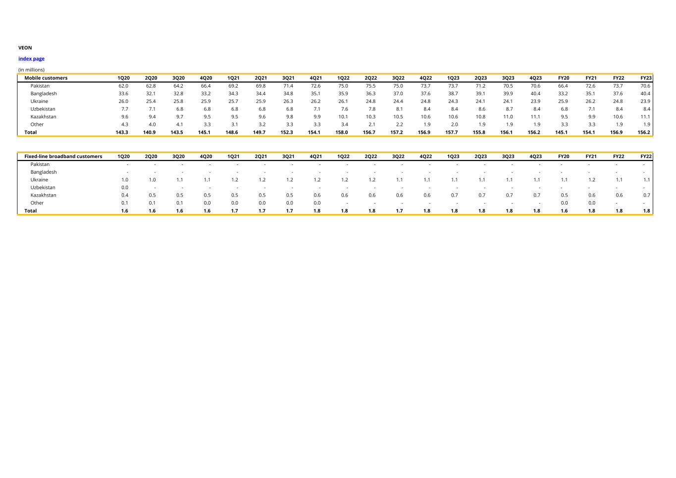 VEON index page (in millions) Mobile customers 1Q20 2Q20 3Q20 4Q20 1Q21 2Q21 3Q21 4Q21 1Q22 2Q22 3Q22 4Q22 1Q23 2Q23 3Q23 4Q23 FY20 FY21 FY22 FY23 Pakistan 62.0 62.8 64.2 66.4 69.2 69.8 71.4 72.6 75.0 75.5 75.0 73.7 73.7 71.2 70.5 70.6 66.4 72.6 73.7 70.6 Bangladesh 33.6 32.1 32.8 33.2 34.3 34.4 34.8 35.1 35.9 36.3 37.0 37.6 38.7 39.1 39.9 40.4 33.2 35.1 37.6 40.4 Ukraine 26.0 25.4 25.8 25.9 25.7 25.9 26.3 26.2 26.1 24.8 24.4 24.8 24.3 24.1 24.1 23.9 25.9 26.2 24.8 23.9 Uzbekistan 7.7 7.1 6.8 6.8 6.8 6.8 6.8 7.1 7.6 7.8 8.1 8.4 8.4 8.6 8.7 8.4 6.8 7.1 8.4 8.4 Kazakhstan 9.6 9.4 9.7 9.5 9.5 9.6 9.8 9.9 10.1 10.3 10.5 10.6 10.6 10.8 11.0 11.1 9.5 9.9 10.6 11.1 Other 4.3 4.0 4.1 3.3 3.1 3.2 3.3 3.3 3.4 2.1 2.2 1.9 2.0 1.9 1.9 1.9 3.3 3.3 1.9 1.9 Total 143.3 140.9 143.5 145.1 148.6 149.7 152.3 154.1 158.0 156.7 157.2 156.9 157.7 155.8 156.1 156.2 145.1 154.1 156.9 156.2 Fixed-line broadband customers 1Q20 2Q20 3Q20 4Q20 1Q21 2Q21 3Q21 4Q21 1Q22 2Q22 3Q22 4Q22 1Q23 2Q23 3Q23 4Q23 FY20 FY21 FY22 FY22 Pakistan - - - - - - - - - - - - - - - - - - - - Bangladesh - - - - - - - - - - - - - - - - - - - - Ukraine 1.0 1.0 1.1 1.1 1.2 1.2 1.2 1.2 1.2 1.2 1.1 1.1 1.1 1.1 1.1 1.1 1.1 1.2 1.1 1.1 Uzbekistan 0.0 - - - - - - - - - - - - - - - - - - - Kazakhstan 0.4 0.5 0.5 0.5 0.5 0.5 0.5 0.6 0.6 0.6 0.6 0.6 0.7 0.7 0.7 0.7 0.5 0.6 0.6 0.7 Other 0.1 0.1 0.1 0.0 0.0 0.0 0.0 0.0 - - - - - - - - 0.0 0.0 - - Total 1.6 1.6 1.6 1.6 1.7 1.7 1.7 1.8 1.8 1.8 1.7 1.8 1.8 1.8 1.8 1.8 1.6 1.8 1.8 1.8