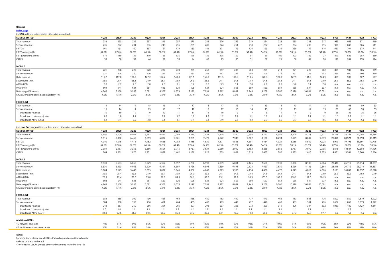 Ukraine index page (in USD millions, unless stated otherwise, unaudited) CONSOLIDATED 1Q20 2Q20 3Q20 4Q20 1Q21 2Q21 3Q21 4Q21 1Q22 2Q22 3Q22 4Q22 1Q23 2Q23 3Q23 4Q23 FY20 FY21 FY22 FY23 Total revenue 238 223 236 237 245 257 270 282 276 252 219 224 228 235 238 217 933 1,055 971 919 Service revenue 236 222 234 236 243 256 269 280 274 251 218 222 227 234 236 215 928 1,048 965 911 EBITDA 161 151 160 157 167 173 183 181 171 156 126 123 135 139 152 116 630 704 575 541 EBITDA margin (%) 67.8% 67.8% 67.8% 66.5% 68.1% 67.4% 67.6% 64.2% 61.9% 61.8% 57.4% 54.7% 59.0% 59.1% 63.6% 53.5% 67.5% 66.8% 59.2% 58.9% EBIT (Operating profit) 119 110 122 119 125 135 139 136 105 102 91 89 100 103 109 77 470 535 387 389 CAPEX 38 58 39 44 39 53 44 68 23 35 51 67 21 38 44 70 179 204 176 174 MOBILE Total revenue 221 208 220 220 227 239 251 262 257 236 204 209 214 221 222 202 869 980 906 859 Service revenue 221 208 220 220 227 239 251 262 257 236 204 209 214 221 222 202 869 980 906 859 Data revenue 119.7 117.0 124.7 127.2 137.2 143.0 151.1 159.0 151.5 136.0 118.6 120.3 122.3 127.9 131.6 124.9 489 590 527 507 Subscribers (mln) 26.0 25.4 25.8 25.9 25.7 25.9 26.3 26.2 26.1 24.8 24.4 24.8 24.3 24.1 24.1 23.9 25.9 26.2 24.8 23.9 ARPU (USD) 2.8 2.7 2.8 2.8 2.9 3.1 3.2 3.3 3.3 3.1 2.8 2.8 2.9 3.0 3.1 2.8 n.a. n.a. n.a. n.a. MOU (min) 603 641 621 651 633 620 595 621 624 568 559 563 554 565 547 537 n.a. n.a. n.a. n.a. Data usage (Mb/user) 4,948 5,160 5,953 6,081 6,308 6,379 7,129 7,291 7,912 8,097 9,245 9,208 9,760 10,170 10,884 10,091 n.a. n.a. n.a. n.a. Churn 3 months active base (quarterly) (%) 4.2% 5.4% 2.6% 3.6% 3.9% 3.1% 3.3% 4.2% 3.6% 7.9% 5.3% 2.9% 4.7% 3.6% 3.2% 3.6% n.a. n.a. n.a. n.a. FIXED-LINE Total revenue 15 14 14 15 16 17 17 18 17 15 14 13 13 13 14 13 59 68 59 53 Service revenue 15 14 14 15 16 17 17 18 17 15 14 13 13 13 14 13 59 68 59 53 Broadband revenue 10 10 9 9 10 11 11 11 10 9 7 8 9 9 9 9 38 43 35 36 Broadband customers (mln) 1.0 1.0 1.1 1.1 1.2 1.2 1.2 1.2 1.2 1.2 1.1 1.1 1.1 1.1 1.1 1.1 1.1 1.2 1.1 1.1 Broadband ARPU (USD) 3.2 3.1 2.9 2.8 3.1 3.1 3.1 3.1 2.9 2.6 2.2 2.3 2.6 2.7 2.7 2.6 n.a n.a n.a n.a (in Local Currency millions, unless stated otherwise, unaudited) CONSOLIDATED 1Q20 2Q20 3Q20 4Q20 1Q21 2Q21 3Q21 4Q21 1Q22 2Q22 3Q22 4Q22 1Q23 2Q23 3Q23 4Q23 FY20 FY21 FY22 FY23 Total revenue 5,950 6,009 6,502 6,697 6,842 7,094 7,275 7,537 7,874 7,370 7,656 8,192 8,346 8,609 8,711 7,921 25,158 28,748 31,092 33,588 Service revenue 5,915 5,982 6,465 6,659 6,807 7,061 7,231 7,473 7,822 7,340 7,602 8,130 8,294 8,549 8,637 7,839 25,020 28,571 30,893 33,319 EBITDA 4,040 4,075 4,411 4,452 4,658 4,783 4,915 4,839 4,871 4,555 4,391 4,484 4,921 5,085 5,542 4,228 16,979 19,196 18,301 19,775 EBITDA margin (%) 67.9% 67.8% 67.8% 66.5% 68.1% 67.4% 67.6% 64.2% 61.9% 61.8% 57.4% 54.7% 59.0% 59.1% 63.6% 53.4% 67.5% 66.8% 58.9% 58.9% EBIT (Operating profit) 2,989 2,967 3,355 3,366 3,501 3,715 3,737 3,631 2,980 2,992 3,153 3,258 3,656 3,767 3,979 2,795 12,678 14,584 12,384 14,196 CAPEX 964 1,561 1,076 1,251 1,077 1,462 1,190 1,822 659 1,032 1,815 2,453 780 1,395 1,616 2,573 4,851 5,551 5,960 6,364 MOBILE Total revenue 5,530 5,593 6,065 6,229 6,357 6,597 6,766 6,993 7,339 6,891 7,125 7,660 7,830 8,066 8,136 7,364 23,418 26,712 29,014 31,397 Service revenue 5,530 5,593 6,065 6,229 6,357 6,597 6,766 6,993 7,339 6,891 7,125 7,660 7,830 8,066 8,136 7,364 23,418 26,712 29,014 31,397 Data revenue 3,004 3,149 3,443 3,595 3,837 3,946 4,066 4,243 4,323 3,980 4,134 4,400 4,472 4,679 4,812 4,566 13,191 16,092 16,837 18,528 Subscribers (mln) 26.0 25.4 25.8 25.9 25.7 25.9 26.3 26.2 26.1 24.8 24.4 24.8 24.3 24.1 24.1 23.9 25.9 26.2 24.8 23.9 ARPU (UAH) 70.3 72.4 78.5 79.8 81.6 84.3 86.1 88.0 93.1 89.9 96.3 103.3 105.5 110.2 111.6 101.9 n.a. n.a. n.a. n.a. MOU (min) 603 641 621 651 633 620 595 621 624 568 559 563 554 565 547 537 n.a. n.a. n.a. n.a. Data usage (Mb/user) 4,948 5,160 5,953 6,081 6,308 6,379 7,129 7,291 7,912 8,097 9,245 9,208 9,760 10,170 10,884 10,091 n.a. n.a. n.a. n.a. Churn 3 months active base (quarterly) (%) 4.2% 5.4% 2.6% 3.6% 3.9% 3.1% 3.3% 4.2% 3.6% 7.9% 5.3% 2.9% 4.7% 3.6% 3.2% 3.6% n.a. n.a. n.a. n.a. FIXED-LINE Total revenue 384 388 399 430 451 464 465 480 483 449 477 470 463 483 501 476 1,602 1,859 1,879 1,922 Service revenue 384 388 399 430 451 464 465 480 483 449 477 470 463 483 501 476 1,602 1,859 1,879 1,922 Broadband revenue 248 257 259 266 291 295 297 298 297 266 273 290 319 326 334 332 1,030 1,180 1,127 1,311 Broadband customers (mln) 1.0 1.0 1.1 1.1 1.2 1.2 1.2 1.2 1.2 1.2 1.1 1.1 1.1 1.1 1.1 1.1 1.1 1.2 1.1 1.1 Broadband ARPU (UAH) 81.0 82.6 81.3 80.5 85.3 85.0 84.3 83.2 82.1 75.0 79.8 85.5 93.6 97.3 99.7 97.7 n.a n.a n.a n.a Additional KPI's 4G network coverage 77% 81% 84% 86% 87% 89% 89% 90% 90% 93% 93% 94% 94% 94% 95% 95% 86% 90% 94% 95% 4G mobile customer penetration 30% 31% 34% 36% 38% 40% 44% 46% 49% 47% 50% 53% 55% 54% 57% 60% 36% 46% 53% 60% Notes: For definitions please see VEON Ltd.’s trading update published on its website on the date hereof ** Pre-IFRS16 values (values before adjustments related to IFRS16)