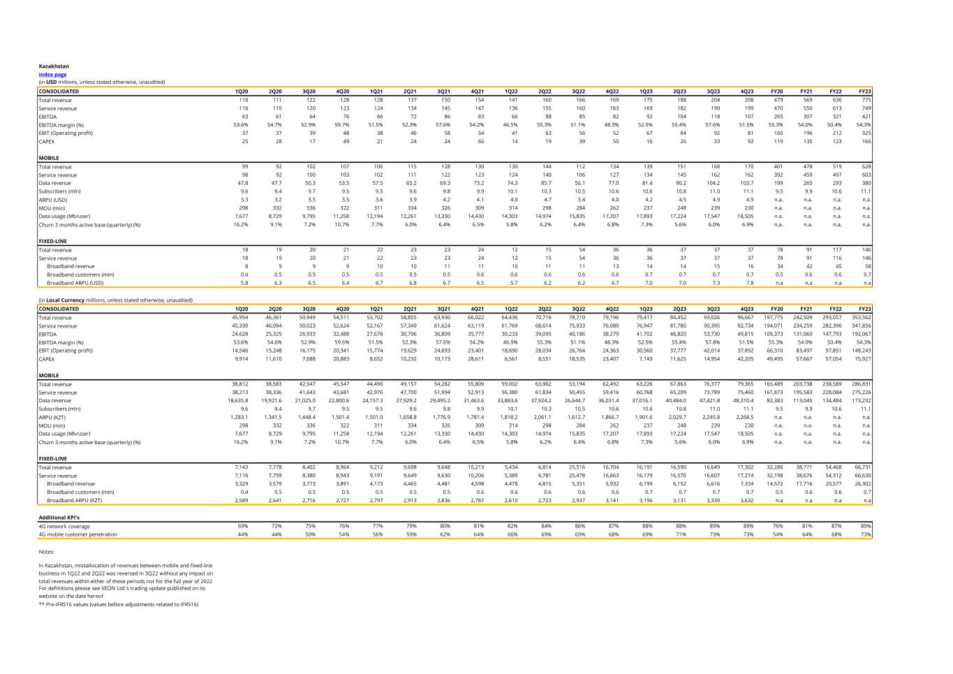 Kazakhstan index page (in USD millions, unless stated otherwise, unaudited) CONSOLIDATED 1Q20 2Q20 3Q20 4Q20 1Q21 2Q21 3Q21 4Q21 1Q22 2Q22 3Q22 4Q22 1Q23 2Q23 3Q23 4Q23 FY20 FY21 FY22 FY23 Total revenue 118 111 122 128 128 137 150 154 141 160 166 169 175 188 204 208 479 569 636 775 Service revenue 116 110 120 123 124 134 145 147 136 155 160 163 169 182 199 199 470 550 613 749 EBITDA 63 61 64 76 66 72 86 83 66 88 85 82 92 104 118 107 265 307 321 421 EBITDA margin (%) 53.6% 54.7% 52.9% 59.7% 51.5% 52.3% 57.6% 54.2% 46.5% 55.3% 51.1% 48.3% 52.5% 55.4% 57.6% 51.5% 55.3% 54.0% 50.4% 54.3% EBIT (Operating profit) 37 37 39 48 38 46 58 54 41 63 56 52 67 84 92 81 160 196 212 325 CAPEX 25 28 17 49 21 24 24 66 14 19 39 50 16 26 33 92 119 135 123 166 MOBILE Total revenue 99 92 102 107 106 115 128 130 130 144 112 134 139 151 168 170 401 478 519 628 Service revenue 98 92 100 103 102 111 122 123 124 140 106 127 134 145 162 162 392 459 497 603 Data revenue 47.8 47.7 50.3 53.5 57.5 65.2 69.3 73.2 74.3 85.7 56.1 77.0 81.4 90.2 104.2 103.7 199 265 293 380 Subscribers (mln) 9.6 9.4 9.7 9.5 9.5 9.6 9.8 9.9 10.1 10.3 10.5 10.6 10.6 10.8 11.0 11.1 9.5 9.9 10.6 11.1 ARPU (USD) 3.3 3.2 3.5 3.5 3.6 3.9 4.2 4.1 4.0 4.7 3.4 4.0 4.2 4.5 4.9 4.9 n.a. n.a. n.a. n.a. MOU (min) 298 332 336 322 311 334 326 309 314 298 284 262 237 248 239 230 n.a. n.a. n.a. n.a. Data usage (Mb/user) 7,677 8,729 9,795 11,258 12,194 12,261 13,330 14,430 14,303 14,974 15,835 17,207 17,893 17,224 17,547 18,505 n.a. n.a. n.a. n.a. Churn 3 months active base (quarterly) (%) 16.2% 9.1% 7.2% 10.7% 7.7% 6.0% 6.4% 6.5% 5.8% 6.2% 6.4% 6.8% 7.3% 5.6% 6.0% 6.9% n.a. n.a. n.a. n.a. FIXED-LINE Total revenue 18 19 20 21 22 23 23 24 12 15 54 36 36 37 37 37 78 91 117 146 Service revenue 18 19 20 21 22 23 23 24 12 15 54 36 36 37 37 37 78 91 116 146 Broadband revenue 8 9 9 9 10 10 11 11 10 11 11 13 14 14 15 16 34 42 45 58 Broadband customers (mln) 0.4 0.5 0.5 0.5 0.5 0.5 0.5 0.6 0.6 0.6 0.6 0.6 0.7 0.7 0.7 0.7 0.5 0.6 0.6 0.7 Broadband ARPU (USD) 5.8 6.3 6.5 6.4 6.7 6.8 6.7 6.5 5.7 6.2 6.2 6.7 7.0 7.0 7.3 7.8 n.a n.a n.a n.a (in Local Currency millions, unless stated otherwise, unaudited) CONSOLIDATED 1Q20 2Q20 3Q20 4Q20 1Q21 2Q21 3Q21 4Q21 1Q22 2Q22 3Q22 4Q22 1Q23 2Q23 3Q23 4Q23 FY20 FY21 FY22 FY23 Total revenue 45,954 46,361 50,949 54,511 53,702 58,855 63,930 66,022 64,436 70,716 78,710 79,196 79,417 84,452 93,026 96,667 197,775 242,509 293,057 353,562 Service revenue 45,330 46,094 50,023 52,624 52,167 57,349 61,624 63,119 61,769 68,614 75,933 76,080 76,947 81,780 90,395 92,734 194,071 234,259 282,396 341,856 EBITDA 24,628 25,325 26,933 32,488 27,678 30,796 36,809 35,777 30,233 39,095 40,186 38,279 41,702 46,820 53,730 49,815 109,373 131,060 147,793 192,067 EBITDA margin (%) 53.6% 54.6% 52.9% 59.6% 51.5% 52.3% 57.6% 54.2% 46.9% 55.3% 51.1% 48.3% 52.5% 55.4% 57.8% 51.5% 55.3% 54.0% 50.4% 54.3% EBIT (Operating profit) 14,546 15,248 16,175 20,341 15,774 19,629 24,693 23,401 18,690 28,034 26,764 24,363 30,560 37,777 42,014 37,892 66,310 83,497 97,851 148,243 CAPEX 9,914 11,610 7,088 20,883 8,652 10,232 10,173 28,611 6,561 8,551 18,535 23,407 7,143 11,625 14,954 42,205 49,495 57,667 57,054 75,927 MOBILE Total revenue 38,812 38,583 42,547 45,547 44,490 49,157 54,282 55,809 59,002 63,902 53,194 62,492 63,226 67,863 76,377 79,365 165,489 203,738 238,589 286,831 Service revenue 38,213 38,336 41,643 43,681 42,976 47,700 51,994 52,913 56,380 61,834 50,455 59,416 60,768 65,209 73,789 75,460 161,873 195,583 228,084 275,226 Data revenue 18,635.8 19,921.6 21,025.0 22,800.6 24,157.3 27,929.2 29,495.2 31,463.6 33,883.6 37,924.2 26,644.7 36,031.4 37,016.1 40,484.0 47,421.8 48,310.4 82,383 113,045 134,484 173,232 Subscribers (mln) 9.6 9.4 9.7 9.5 9.5 9.6 9.8 9.9 10.1 10.3 10.5 10.6 10.6 10.8 11.0 11.1 9.5 9.9 10.6 11.1 ARPU (KZT) 1,283.1 1,341.5 1,448.4 1,501.4 1,501.0 1,658.8 1,776.9 1,781.4 1,818.2 2,061.1 1,612.7 1,866.7 1,901.6 2,029.7 2,245.8 2,268.5 n.a. n.a. n.a. n.a. MOU (min) 298 332 336 322 311 334 326 309 314 298 284 262 237 248 239 230 n.a. n.a. n.a. n.a. Data usage (Mb/user) 7,677 8,729 9,795 11,258 12,194 12,261 13,330 14,430 14,303 14,974 15,835 17,207 17,893 17,224 17,547 18,505 n.a. n.a. n.a. n.a. Churn 3 months active base (quarterly) (%) 16.2% 9.1% 7.2% 10.7% 7.7% 6.0% 6.4% 6.5% 5.8% 6.2% 6.4% 6.8% 7.3% 5.6% 6.0% 6.9% n.a. n.a. n.a. n.a. FIXED-LINE Total revenue 7,143 7,778 8,402 8,964 9,212 9,698 9,648 10,213 5,434 6,814 25,516 16,704 16,191 16,590 16,649 17,302 32,286 38,771 54,468 66,731 Service revenue 7,116 7,759 8,380 8,943 9,191 9,649 9,630 10,206 5,389 6,781 25,478 16,663 16,179 16,570 16,607 17,274 32,198 38,676 54,312 66,630 Broadband revenue 3,329 3,579 3,773 3,891 4,173 4,465 4,481 4,598 4,478 4,815 5,351 5,932 6,199 6,152 6,616 7,334 14,572 17,716 20,577 26,302 Broadband customers (mln) 0.4 0.5 0.5 0.5 0.5 0.5 0.5 0.6 0.6 0.6 0.6 0.6 0.7 0.7 0.7 0.7 0.5 0.6 0.6 0.7 Broadband ARPU (KZT) 2,589 2,641 2,716 2,727 2,797 2,913 2,836 2,787 2,610 2,723 2,937 3,141 3,196 3,131 3,339 3,632 n.a n.a n.a n.a Additional KPI's 4G network coverage 69% 72% 75% 76% 77% 79% 80% 81% 82% 84% 86% 87% 88% 88% 89% 89% 76% 81% 87% 89% 4G mobile customer penetration 44% 44% 50% 54% 56% 59% 62% 64% 66% 69% 69% 68% 69% 71% 73% 73% 54% 64% 68% 73% Notes: In Kazakhstan, missallocation of revenues between mobile and fixed-line business in 1Q22 and 2Q22 was reversed in 3Q22 without any impact on total revenues within either of these periods nor for the full year of 2022 For definitions please see VEON Ltd.’s trading update published on its website on the date hereof ** Pre-IFRS16 values (values before adjustments related to IFRS16)