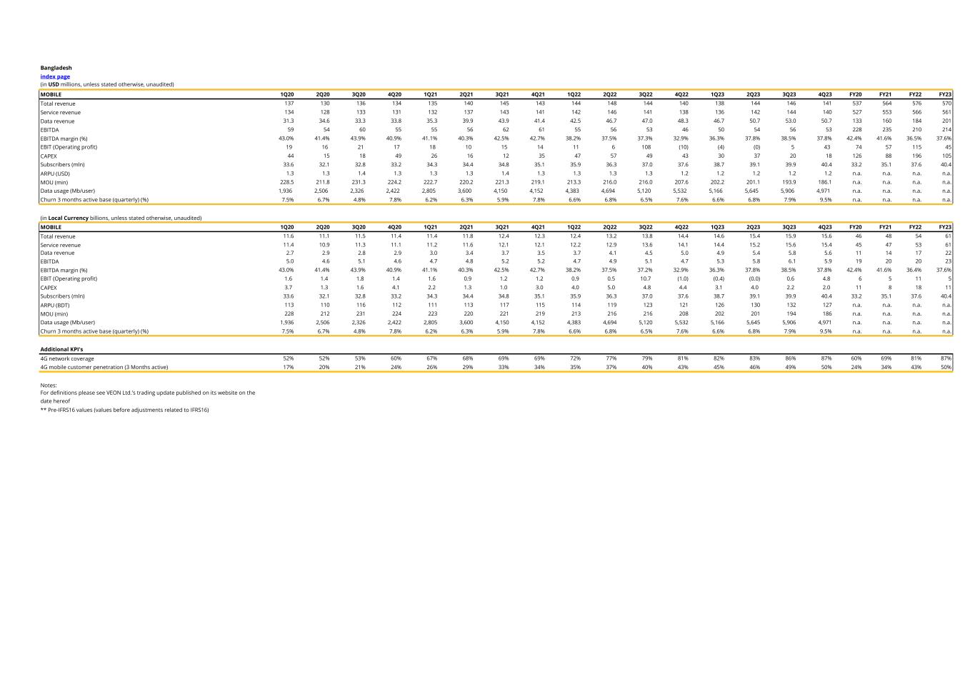 Bangladesh index page (in USD millions, unless stated otherwise, unaudited) MOBILE 1Q20 2Q20 3Q20 4Q20 1Q21 2Q21 3Q21 4Q21 1Q22 2Q22 3Q22 4Q22 1Q23 2Q23 3Q23 4Q23 FY20 FY21 FY22 FY23 Total revenue 137 130 136 134 135 140 145 143 144 148 144 140 138 144 146 141 537 564 576 570 Service revenue 134 128 133 131 132 137 143 141 142 146 141 138 136 142 144 140 527 553 566 561 Data revenue 31.3 34.6 33.3 33.8 35.3 39.9 43.9 41.4 42.5 46.7 47.0 48.3 46.7 50.7 53.0 50.7 133 160 184 201 EBITDA 59 54 60 55 55 56 62 61 55 56 53 46 50 54 56 53 228 235 210 214 EBITDA margin (%) 43.0% 41.4% 43.9% 40.9% 41.1% 40.3% 42.5% 42.7% 38.2% 37.5% 37.3% 32.9% 36.3% 37.8% 38.5% 37.8% 42.4% 41.6% 36.5% 37.6% EBIT (Operating profit) 19 16 21 17 18 10 15 14 11 6 108 (10) (4) (0) 5 43 74 57 115 45 CAPEX 44 15 18 49 26 16 12 35 47 57 49 43 30 37 20 18 126 88 196 105 Subscribers (mln) 33.6 32.1 32.8 33.2 34.3 34.4 34.8 35.1 35.9 36.3 37.0 37.6 38.7 39.1 39.9 40.4 33.2 35.1 37.6 40.4 ARPU (USD) 1.3 1.3 1.4 1.3 1.3 1.3 1.4 1.3 1.3 1.3 1.3 1.2 1.2 1.2 1.2 1.2 n.a. n.a. n.a. n.a. MOU (min) 228.5 211.8 231.3 224.2 222.7 220.2 221.3 219.1 213.3 216.0 216.0 207.6 202.2 201.1 193.9 186.1 n.a. n.a. n.a. n.a. Data usage (Mb/user) 1,936 2,506 2,326 2,422 2,805 3,600 4,150 4,152 4,383 4,694 5,120 5,532 5,166 5,645 5,906 4,971 n.a. n.a. n.a. n.a. Churn 3 months active base (quarterly) (%) 7.5% 6.7% 4.8% 7.8% 6.2% 6.3% 5.9% 7.8% 6.6% 6.8% 6.5% 7.6% 6.6% 6.8% 7.9% 9.5% n.a. n.a. n.a. n.a. (in Local Currency billions, unless stated otherwise, unaudited) MOBILE 1Q20 2Q20 3Q20 4Q20 1Q21 2Q21 3Q21 4Q21 1Q22 2Q22 3Q22 4Q22 1Q23 2Q23 3Q23 4Q23 FY20 FY21 FY22 FY23 Total revenue 11.6 11.1 11.5 11.4 11.4 11.8 12.4 12.3 12.4 13.2 13.8 14.4 14.6 15.4 15.9 15.6 46 48 54 61 Service revenue 11.4 10.9 11.3 11.1 11.2 11.6 12.1 12.1 12.2 12.9 13.6 14.1 14.4 15.2 15.6 15.4 45 47 53 61 Data revenue 2.7 2.9 2.8 2.9 3.0 3.4 3.7 3.5 3.7 4.1 4.5 5.0 4.9 5.4 5.8 5.6 11 14 17 22 EBITDA 5.0 4.6 5.1 4.6 4.7 4.8 5.2 5.2 4.7 4.9 5.1 4.7 5.3 5.8 6.1 5.9 19 20 20 23 EBITDA margin (%) 43.0% 41.4% 43.9% 40.9% 41.1% 40.3% 42.5% 42.7% 38.2% 37.5% 37.2% 32.9% 36.3% 37.8% 38.5% 37.8% 42.4% 41.6% 36.4% 37.6% EBIT (Operating profit) 1.6 1.4 1.8 1.4 1.6 0.9 1.2 1.2 0.9 0.5 10.7 (1.0) (0.4) (0.0) 0.6 4.8 6 5 11 5 CAPEX 3.7 1.3 1.6 4.1 2.2 1.3 1.0 3.0 4.0 5.0 4.8 4.4 3.1 4.0 2.2 2.0 11 8 18 11 Subscribers (mln) 33.6 32.1 32.8 33.2 34.3 34.4 34.8 35.1 35.9 36.3 37.0 37.6 38.7 39.1 39.9 40.4 33.2 35.1 37.6 40.4 ARPU (BDT) 113 110 116 112 111 113 117 115 114 119 123 121 126 130 132 127 n.a. n.a. n.a. n.a. MOU (min) 228 212 231 224 223 220 221 219 213 216 216 208 202 201 194 186 n.a. n.a. n.a. n.a. Data usage (Mb/user) 1,936 2,506 2,326 2,422 2,805 3,600 4,150 4,152 4,383 4,694 5,120 5,532 5,166 5,645 5,906 4,971 n.a. n.a. n.a. n.a. Churn 3 months active base (quarterly) (%) 7.5% 6.7% 4.8% 7.8% 6.2% 6.3% 5.9% 7.8% 6.6% 6.8% 6.5% 7.6% 6.6% 6.8% 7.9% 9.5% n.a. n.a. n.a. n.a. Additional KPI's 4G network coverage 52% 52% 53% 60% 67% 68% 69% 69% 72% 77% 79% 81% 82% 83% 86% 87% 60% 69% 81% 87% 4G mobile customer penetration (3 Months active) 17% 20% 21% 24% 26% 29% 33% 34% 35% 37% 40% 43% 45% 46% 49% 50% 24% 34% 43% 50% Notes: For definitions please see VEON Ltd.’s trading update published on its website on the date hereof ** Pre-IFRS16 values (values before adjustments related to IFRS16)