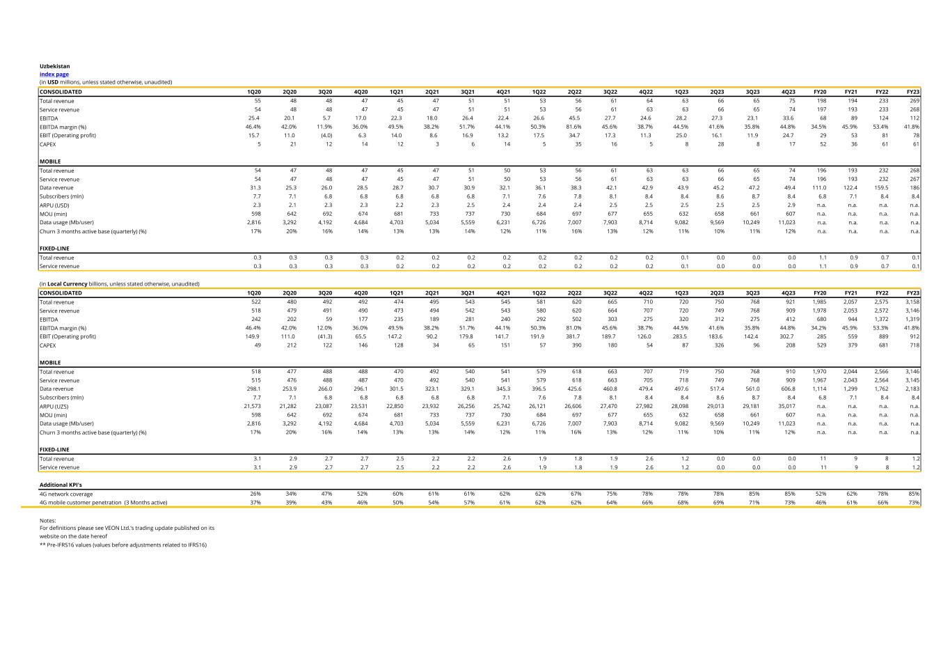 Uzbekistan index page (in USD millions, unless stated otherwise, unaudited) CONSOLIDATED 1Q20 2Q20 3Q20 4Q20 1Q21 2Q21 3Q21 4Q21 1Q22 2Q22 3Q22 4Q22 1Q23 2Q23 3Q23 4Q23 FY20 FY21 FY22 FY23 Total revenue 55 48 48 47 45 47 51 51 53 56 61 64 63 66 65 75 198 194 233 269 Service revenue 54 48 48 47 45 47 51 51 53 56 61 63 63 66 65 74 197 193 233 268 EBITDA 25.4 20.1 5.7 17.0 22.3 18.0 26.4 22.4 26.6 45.5 27.7 24.6 28.2 27.3 23.1 33.6 68 89 124 112 EBITDA margin (%) 46.4% 42.0% 11.9% 36.0% 49.5% 38.2% 51.7% 44.1% 50.3% 81.6% 45.6% 38.7% 44.5% 41.6% 35.8% 44.8% 34.5% 45.9% 53.4% 41.8% EBIT (Operating profit) 15.7 11.0 (4.0) 6.3 14.0 8.6 16.9 13.2 17.5 34.7 17.3 11.3 25.0 16.1 11.9 24.7 29 53 81 78 CAPEX 5 21 12 14 12 3 6 14 5 35 16 5 8 28 8 17 52 36 61 61 MOBILE Total revenue 54 47 48 47 45 47 51 50 53 56 61 63 63 66 65 74 196 193 232 268 Service revenue 54 47 48 47 45 47 51 50 53 56 61 63 63 66 65 74 196 193 232 267 Data revenue 31.3 25.3 26.0 28.5 28.7 30.7 30.9 32.1 36.1 38.3 42.1 42.9 43.9 45.2 47.2 49.4 111.0 122.4 159.5 186 Subscribers (mln) 7.7 7.1 6.8 6.8 6.8 6.8 6.8 7.1 7.6 7.8 8.1 8.4 8.4 8.6 8.7 8.4 6.8 7.1 8.4 8.4 ARPU (USD) 2.3 2.1 2.3 2.3 2.2 2.3 2.5 2.4 2.4 2.4 2.5 2.5 2.5 2.5 2.5 2.9 n.a. n.a. n.a. n.a. MOU (min) 598 642 692 674 681 733 737 730 684 697 677 655 632 658 661 607 n.a. n.a. n.a. n.a. Data usage (Mb/user) 2,816 3,292 4,192 4,684 4,703 5,034 5,559 6,231 6,726 7,007 7,903 8,714 9,082 9,569 10,249 11,023 n.a. n.a. n.a. n.a. Churn 3 months active base (quarterly) (%) 17% 20% 16% 14% 13% 13% 14% 12% 11% 16% 13% 12% 11% 10% 11% 12% n.a. n.a. n.a. n.a. FIXED-LINE Total revenue 0.3 0.3 0.3 0.3 0.2 0.2 0.2 0.2 0.2 0.2 0.2 0.2 0.1 0.0 0.0 0.0 1.1 0.9 0.7 0.1 Service revenue 0.3 0.3 0.3 0.3 0.2 0.2 0.2 0.2 0.2 0.2 0.2 0.2 0.1 0.0 0.0 0.0 1.1 0.9 0.7 0.1 (in Local Currency billions, unless stated otherwise, unaudited) CONSOLIDATED 1Q20 2Q20 3Q20 4Q20 1Q21 2Q21 3Q21 4Q21 1Q22 2Q22 3Q22 4Q22 1Q23 2Q23 3Q23 4Q23 FY20 FY21 FY22 FY23 Total revenue 522 480 492 492 474 495 543 545 581 620 665 710 720 750 768 921 1,985 2,057 2,575 3,158 Service revenue 518 479 491 490 473 494 542 543 580 620 664 707 720 749 768 909 1,978 2,053 2,572 3,146 EBITDA 242 202 59 177 235 189 281 240 292 502 303 275 320 312 275 412 680 944 1,372 1,319 EBITDA margin (%) 46.4% 42.0% 12.0% 36.0% 49.5% 38.2% 51.7% 44.1% 50.3% 81.0% 45.6% 38.7% 44.5% 41.6% 35.8% 44.8% 34.2% 45.9% 53.3% 41.8% EBIT (Operating profit) 149.9 111.0 (41.3) 65.5 147.2 90.2 179.8 141.7 191.9 381.7 189.7 126.0 283.5 183.6 142.4 302.7 285 559 889 912 CAPEX 49 212 122 146 128 34 65 151 57 390 180 54 87 326 96 208 529 379 681 718 MOBILE Total revenue 518 477 488 488 470 492 540 541 579 618 663 707 719 750 768 910 1,970 2,044 2,566 3,146 Service revenue 515 476 488 487 470 492 540 541 579 618 663 705 718 749 768 909 1,967 2,043 2,564 3,145 Data revenue 298.1 253.9 266.0 296.1 301.5 323.1 329.1 345.3 396.5 425.6 460.8 479.4 497.6 517.4 561.0 606.8 1,114 1,299 1,762 2,183 Subscribers (mln) 7.7 7.1 6.8 6.8 6.8 6.8 6.8 7.1 7.6 7.8 8.1 8.4 8.4 8.6 8.7 8.4 6.8 7.1 8.4 8.4 ARPU (UZS) 21,573 21,282 23,087 23,531 22,850 23,932 26,256 25,742 26,121 26,606 27,470 27,982 28,098 29,013 29,181 35,017 n.a. n.a. n.a. n.a. MOU (min) 598 642 692 674 681 733 737 730 684 697 677 655 632 658 661 607 n.a. n.a. n.a. n.a. Data usage (Mb/user) 2,816 3,292 4,192 4,684 4,703 5,034 5,559 6,231 6,726 7,007 7,903 8,714 9,082 9,569 10,249 11,023 n.a. n.a. n.a. n.a. Churn 3 months active base (quarterly) (%) 17% 20% 16% 14% 13% 13% 14% 12% 11% 16% 13% 12% 11% 10% 11% 12% n.a. n.a. n.a. n.a. FIXED-LINE Total revenue 3.1 2.9 2.7 2.7 2.5 2.2 2.2 2.6 1.9 1.8 1.9 2.6 1.2 0.0 0.0 0.0 11 9 8 1.2 Service revenue 3.1 2.9 2.7 2.7 2.5 2.2 2.2 2.6 1.9 1.8 1.9 2.6 1.2 0.0 0.0 0.0 11 9 8 1.2 Additional KPI's 4G network coverage 26% 34% 47% 52% 60% 61% 61% 62% 62% 67% 75% 78% 78% 78% 85% 85% 52% 62% 78% 85% 4G mobile customer penetration (3 Months active) 37% 39% 43% 46% 50% 54% 57% 61% 62% 62% 64% 66% 68% 69% 71% 73% 46% 61% 66% 73% Notes: For definitions please see VEON Ltd.’s trading update published on its website on the date hereof ** Pre-IFRS16 values (values before adjustments related to IFRS16)