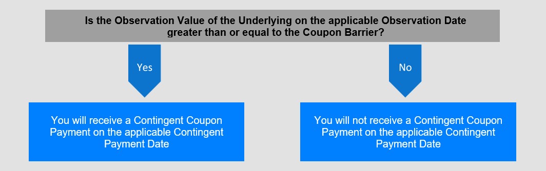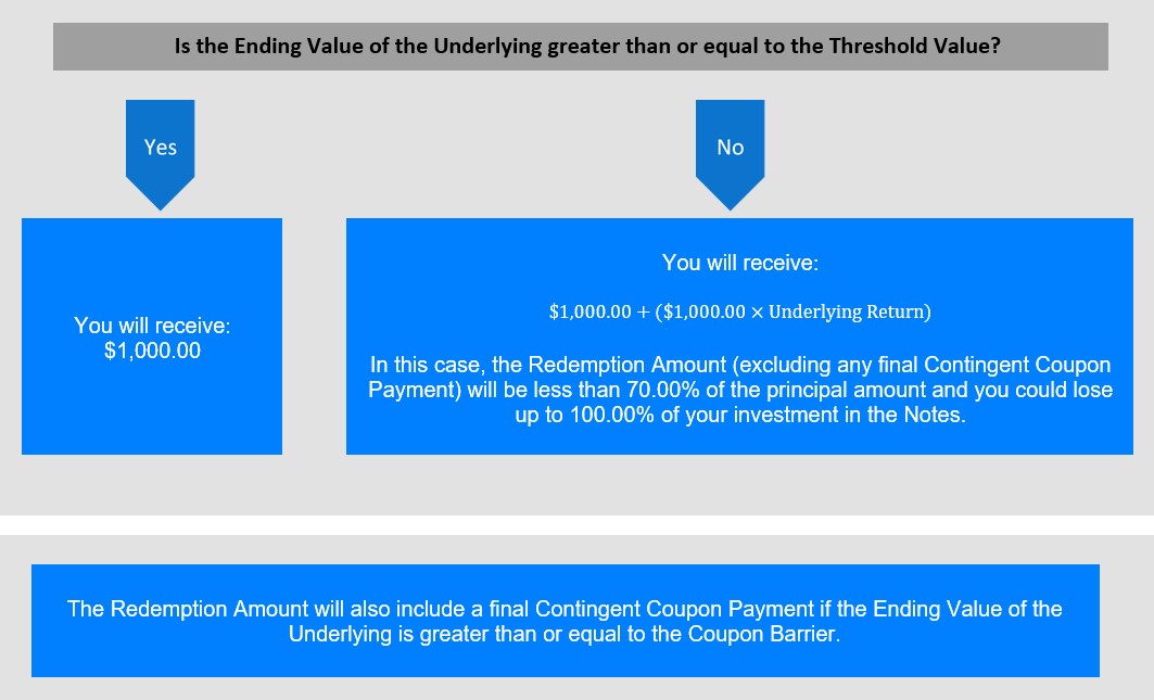 In this case, the Redemption Amount (excluding any final Contingent Coupon Payment) will be less than 70.00% of the principal amount and you could lose up to 100.00% of your investment in the Notes. The Redemption Amount will also include a final Contingent Coupon Payment if the Ending Value of the Underlying is greater than or equal to the Coupon Barrier. |