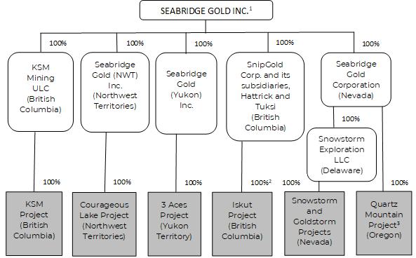 The Issuer presently has twelve wholly-owned subsidiaries: KSM Mining ULC, Seabridge Gold (KSM) Inc., SnipGold Corp., Hattrick Resources Corp. (“Hattrick”) and Tuksi Mining & Development Company Ltd. (“Tuksi”), each companies incorporated under the laws of British Columbia, Canada; Seabridge Gold (NWT) Inc., a company incorporated under the laws of the Northwest Territories of Canada; Seabridge Gold (Yukon) Inc., a company incorporated under the laws of Yukon; Seabridge Gold Corporation, Pacific Intermountain Gold, Corporation, 5555 Gold Inc. and 5555 Silver Inc., each Nevada Corporations; and Snowstorm Exploration LLC, a Delaware limited liability corporation. The following diagram illustrates the inter-corporate relationship between the Issuer, its active subsidiaries and its projects as of December 31, 2023.