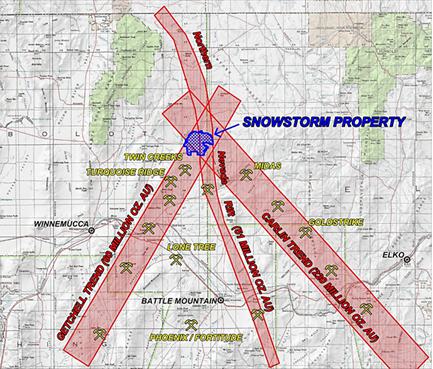 The 2021 exploration program at Snowstorm commenced in August, 2021 and followed-up on the gold bearing structures identified in 2020. The program was designed to off-set these previous intersections toward a structure with a topographic expression which is projected into the Paleozoic section using magnetotelluric (MT) geophysical readings. The surface expression of this structure has produced a significant arsenic in soil anomaly. The program was completed by April, 2022.