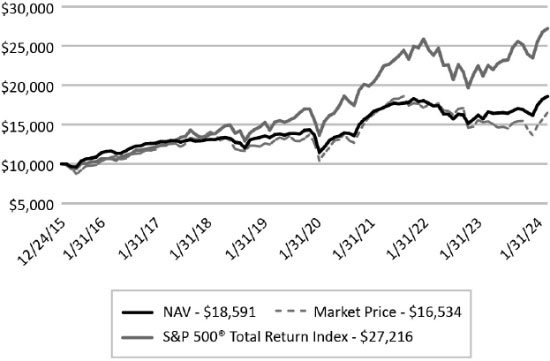 The graph below illustrates the growth of a hypothetical $10,000 investment assuming the purchase of common shares at NAV or the closing market price (NYSE: RIV) of $19.40 on December 24, 2015, and tracking its progress through January 31, 2024.