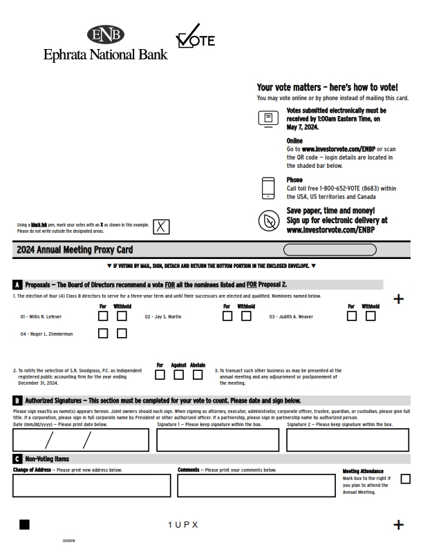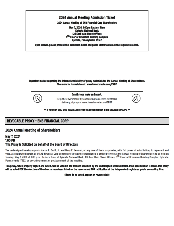 2024 Annual Meeting Admission Ticket 2024 Annual Meeting of ENB Financial Corp Shareholders May 7, 2024, 1:00pm Eastern Time Ephrata National Bank 124 East Main Street Offices 5th Floor of Brossman Building Complex Ephrata, Pennsylvania 17522 Upon arrival, please present this admission ticket and photo identification at the registration desk. Important notice regarding the Internet availability of proxy materials for the Annual Meeting of Shareholders. The material is available at: www.investorvote.com/ENBP Small steps make an impact. Help the environment by consenting to receive electronic delivery, sign up at www.investorvote.com/ENBP q IF VOTING BY MAIL, SIGN, DETACH AND RETURN THE BOTTOM PORTION IN THE ENCLOSED ENVELOPE. q REVOCABLE PROXY - ENB FINANCIAL CORP 2024 Annual Meeting of Shareholders May 7, 2024 1:00 PM This Proxy is Solicited on Behalf of the Board of Directors The undersigned hereby appoints Aaron L. Groff, Jr. and Mary E. Leaman, or any one of them, as proxies, with full power of substitution, to represent and vote, as designated herein all of ENB Financial Corp common stock that the undersigned is entitled to vote at the Annual Meeting of Shareholders to be held on Tuesday, May 7, 2024 at 1:00 p.m., Eastern Time, at Ephrata National Bank, 124 East Main Street Offices, 5th Floor of Brossman Building Complex, Ephrata, Pennsylvania 17522, or any adjournment or postponement of the meeting. This proxy, when properly signed and dated, will be voted in the manner specified by the undersigned shareholder(s). If no specification is made, this proxy will be voted FOR the election of the director nominees listed on the reverse and FOR ratification of the independent registered public accounting firm. (Items to be voted appear on reverse side)