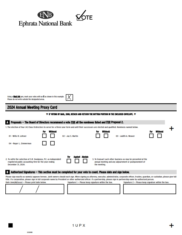 The Annual Meeting of Shareholders will be held on Tuesday, May 7, 2024, at 1:00 p.m., Eastern Time, at Ephrata National Bank, 124 East Main Street, 5th Floor of Brossman Building Complex, Ephrata, Pennsylvania 17522. All inquiries regarding the annual meeting should be mailed to Adrienne L. Miller, Esq., Corporate Secretary, 31 East Main Street, P.O. Box 457, Ephrata, Pennsylvania 17522 or by telephone at (717) 733-4181.