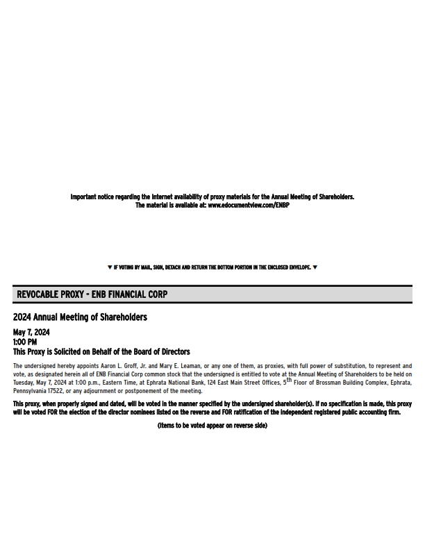 Important notice regarding the Internet availability of proxy materials for the Annual Meeting of Shareholders. The material is available at: www.edocumentview.com/ENBP q IF VOTING BY MAIL, SIGN, DETACH AND RETURN THE BOTTOM PORTION IN THE ENCLOSED ENVELOPE. q REVOCABLE PROXY - ENB FINANCIAL CORP 2024 Annual Meeting of Shareholders May 7, 2024 1:00 PM This Proxy is Solicited on Behalf of the Board of Directors The undersigned hereby appoints Aaron L. Groff, Jr. and Mary E. Leaman, or any one of them, as proxies, with full power of substitution, to represent and vote, as designated herein all of ENB Financial Corp common stock that the undersigned is entitled to vote at the Annual Meeting of Shareholders to be held on Tuesday, May 7, 2024 at 1:00 p.m., Eastern Time, at Ephrata National Bank, 124 East Main Street Offices, 5th Floor of Brossman Building Complex, Ephrata, Pennsylvania 17522, or any adjournment or postponement of the meeting. This proxy, when properly signed and dated, will be voted in the manner specified by the undersigned shareholder(s). If no specification is made, this proxy will be voted FOR the election of the director nominees listed on the reverse and FOR ratification of the independent registered public accounting firm. (Items to be voted appear on reverse side)