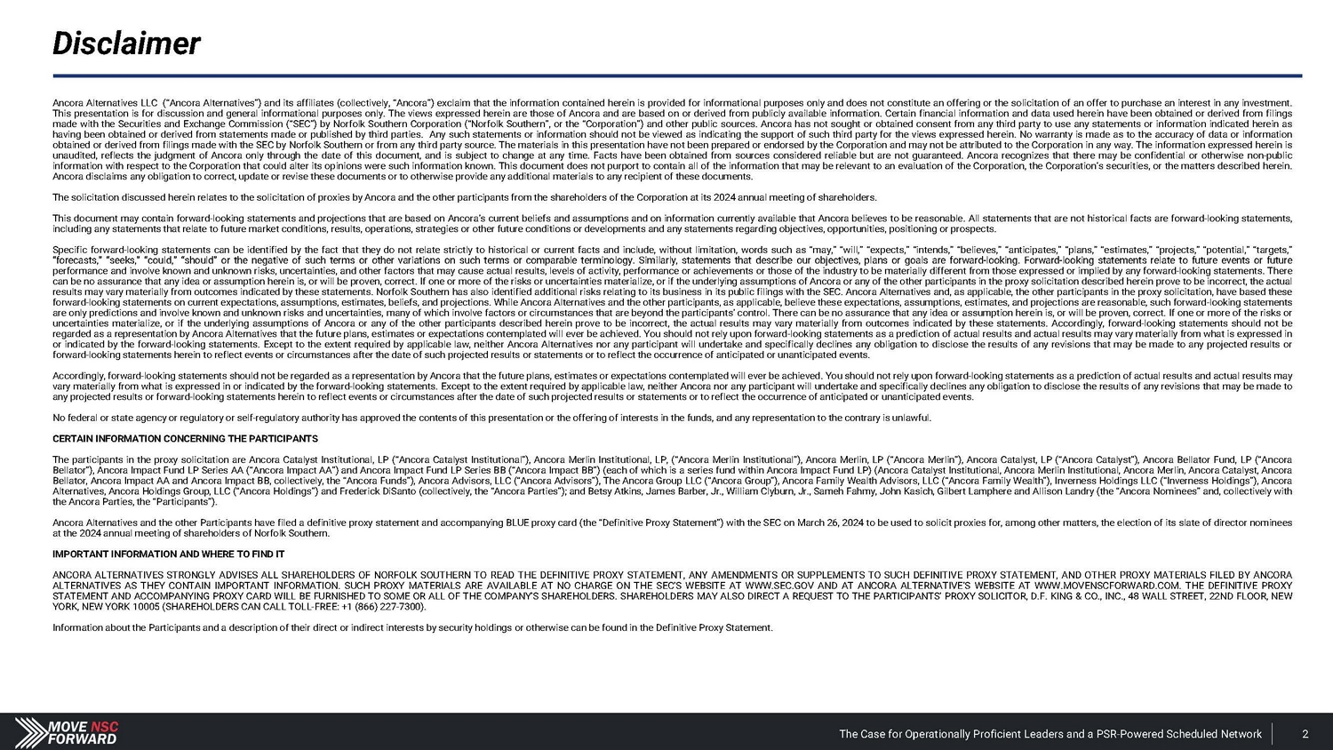 Disclaimer The Case for Operationally Proficient Leaders and a PSR - Powered Scheduled Network 2 Ancora Alternatives LLC (“Ancora Alternatives”) and its affiliates (collectively, “Ancora”) exclaim that the information contained herein is provided for informational purposes only and does not constitute an offering or the solicitation of an offer to purchase an interest in any investment . This presentation is for discussion and general informational purposes only . The views expressed herein are those of Ancora and are based on or derived from publicly available information . Certain financial information and data used herein have been obtained or derived from filings made with the Securities and Exchange Commission (“SEC”) by Norfolk Southern Corporation (“Norfolk Southern”, or the “Corporation”) and other public sources . Ancora has not sought or obtained consent from any third party to use any statements or information indicated herein as having been obtained or derived from statements made or published by third parties . Any such statements or information should not be viewed as indicating the support of such third party for the views expressed herein . No warranty is made as to the accuracy of data or information obtained or derived from filings made with the SEC by Norfolk Southern or from any third party source . The materials in this presentation have not been prepared or endorsed by the Corporation and may not be attributed to the Corporation in any way . The information expressed herein is unaudited, reflects the judgment of Ancora only through the date of this document, and is subject to change at any time . Facts have been obtained from sources considered reliable but are not guaranteed . Ancora recognizes that there may be confidential or otherwise non - public information with respect to the Corporation that could alter its opinions were such information known . This document does not purport to contain all of the information that may be relevant to an evaluation of the Corporation, the Corporation’s securities, or the matters described herein . Ancora disclaims any obligation to correct, update or revise these documents or to otherwise provide any additional materials to any recipient of these documents . The solicitation discussed herein relates to the solicitation of proxies by Ancora and the other participants from the shareholders of the Corporation at its 2024 annual meeting of shareholders. This document may contain forward - looking statements and projections that are based on Ancora’s current beliefs and assumptions and on information currently available that Ancora believes to be reasonable . All statements that are not historical facts are forward - looking statements, including any statements that relate to future market conditions, results, operations, strategies or other future conditions or developments and any statements regarding objectives, opportunities, positioning or prospects . Specific forward - looking statements can be identified by the fact that they do not relate strictly to historical or current facts and include, without limitation, words such as “may,” “will,” “expects,” “intends,” “believes,” “anticipates,” “plans,” “estimates,” “projects,” “potential,” “targets,” “forecasts,” “seeks,” “could,” “should” or the negative of such terms or other variations on such terms or comparable terminology . Similarly, statements that describe our objectives, plans or goals are forward - looking . Forward - looking statements relate to future events or future performance and involve known and unknown risks, uncertainties, and other factors that may cause actual results, levels of activity, performance or achievements or those of the industry to be materially different from those expressed or implied by any forward - looking statements . There can be no assurance that any idea or assumption herein is, or will be proven, correct . If one or more of the risks or uncertainties materialize, or if the underlying assumptions of Ancora or any of the other participants in the proxy solicitation described herein prove to be incorrect, the actual results may vary materially from outcomes indicated by these statements . Norfolk Southern has also identified additional risks relating to its business in its public filings with the SEC . Ancora Alternatives and, as applicable, the other participants in the proxy solicitation, have based these forward - looking statements on current expectations, assumptions, estimates, beliefs, and projections . While Ancora Alternatives and the other participants, as applicable, believe these expectations, assumptions, estimates, and projections are reasonable, such forward - looking statements are only predictions and involve known and unknown risks and uncertainties, many of which involve factors or circumstances that are beyond the participants’ control . There can be no assurance that any idea or assumption herein is, or will be proven, correct . If one or more of the risks or uncertainties materialize, or if the underlying assumptions of Ancora or any of the other participants described herein prove to be incorrect, the actual results may vary materially from outcomes indicated by these statements . Accordingly, forward - looking statements should not be regarded as a representation by Ancora Alternatives that the future plans, estimates or expectations contemplated will ever be achieved . You should not rely upon forward - looking statements as a prediction of actual results and actual results may vary materially from what is expressed in or indicated by the forward - looking statements . Except to the extent required by applicable law, neither Ancora Alternatives nor any participant will undertake and specifically declines any obligation to disclose the results of any revisions that may be made to any projected results or forward - looking statement