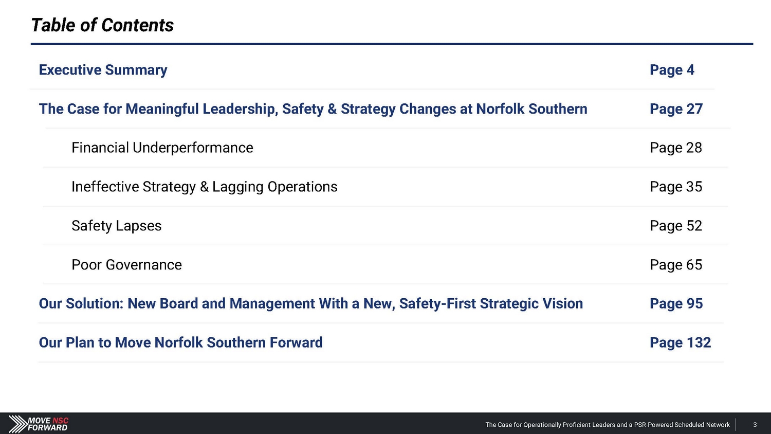Table of Contents The Case for Meaningful Leadership, Safety & Strategy Changes at Norfolk Southern Page 27 Our Solution: New Board and Management With a New, Safety - First Strategic Vision Page 95 Our Plan to Move Norfolk Southern Forward Page 132 Executive Summary Page 4 Financial Underperformance Page 28 Poor Governance Page 65 Safety Lapses Page 52 Ineffective Strategy & Lagging Operations Page 35 The Case for Operationally Proficient Leaders and a PSR - Powered Scheduled Network 3