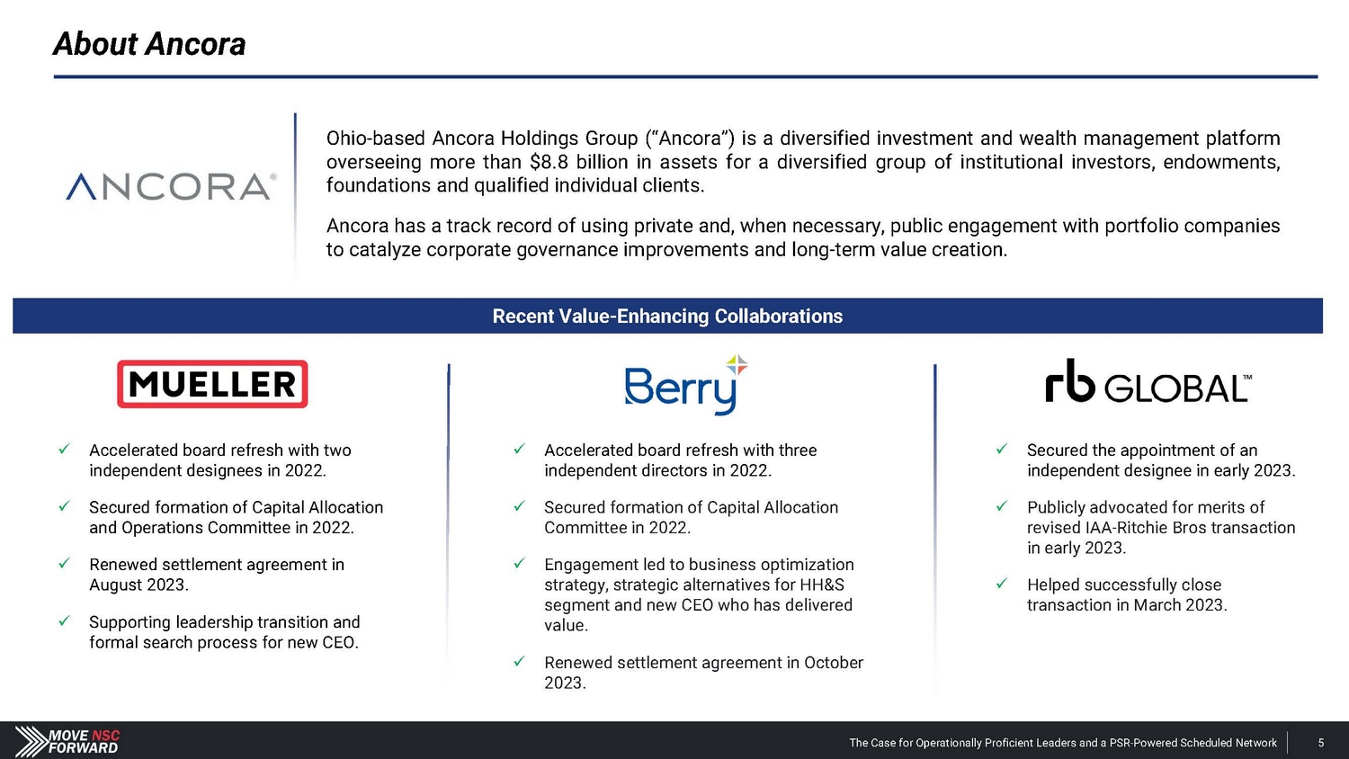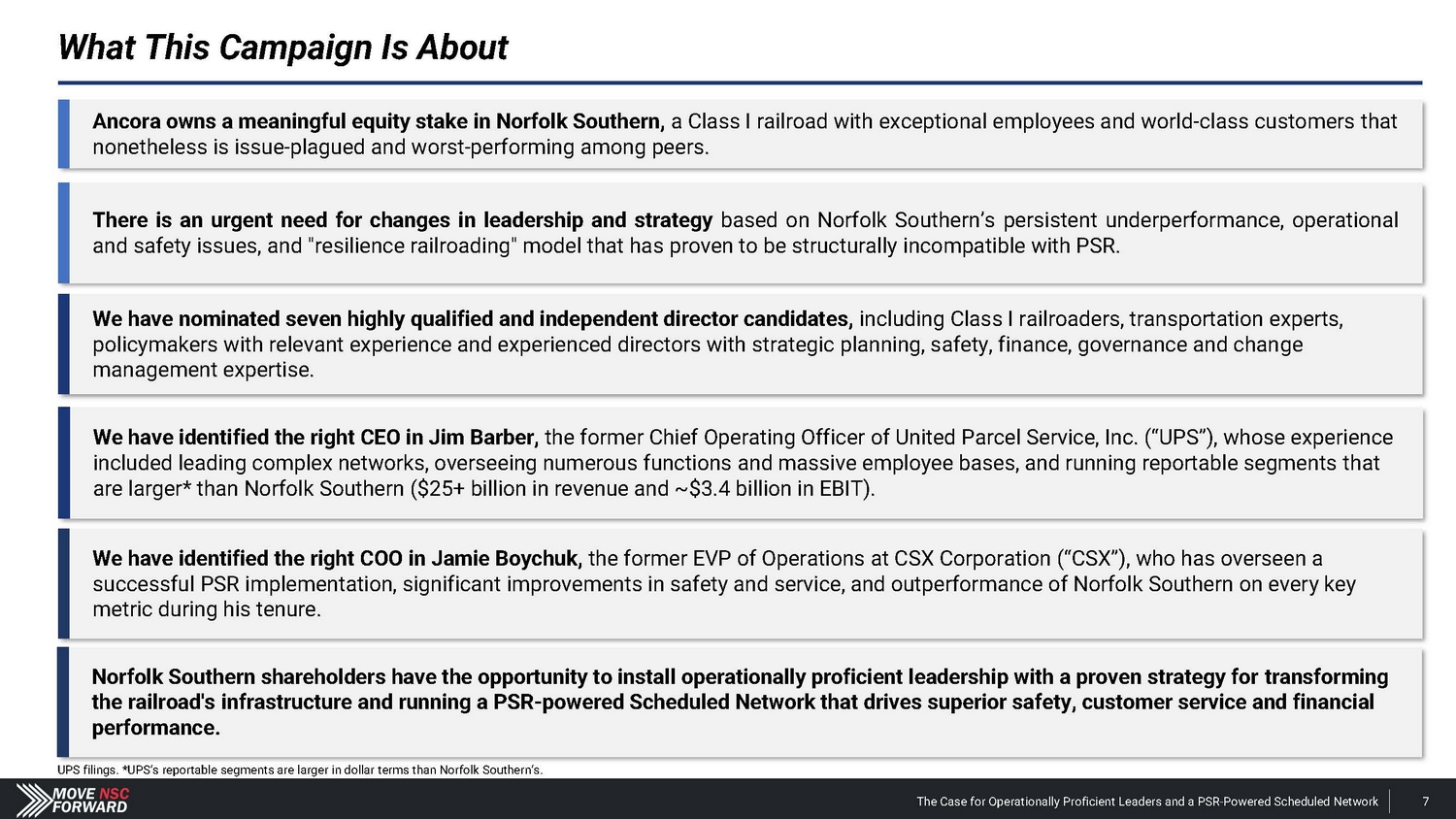 UPS filings. *UPS’s reportable segments are larger in dollar terms than Norfolk Southern’s. Ancora owns a meaningful equity stake in Norfolk Southern, a Class I railroad with exceptional employees and world - class customers that nonetheless is issue - plagued and worst - performing among peers. There is an urgent need for changes in leadership and strategy based on Norfolk Southern’s persistent underperformance, operational and safety issues, and "resilience railroading" model that has proven to be structurally incompatible with PSR. We have nominated seven highly qualified and independent director candidates, including Class I railroaders, transportation experts, policymakers with relevant experience and experienced directors with strategic planning, safety, finance, governance and change management expertise. We have identified the right CEO in Jim Barber, the former Chief Operating Officer of United Parcel Service, Inc. (“UPS”), whose experience included leading complex networks, overseeing numerous functions and massive employee bases, and running reportable segments that are larger* than Norfolk Southern ($25+ billion in revenue and ~$3.4 billion in EBIT). We have identified the right COO in Jamie Boychuk, the former EVP of Operations at CSX Corporation (“CSX”), who has overseen a successful PSR implementation, significant improvements in safety and service, and outperformance of Norfolk Southern on every key metric during his tenure. Norfolk Southern shareholders have the opportunity to install operationally proficient leadership with a proven strategy for transforming the railroad's infrastructure and running a PSR - powered Scheduled Network that drives superior safety, customer service and financial performance. What This Campaign Is About The Case for Operationally Proficient Leaders and a PSR - Powered Scheduled Network 7