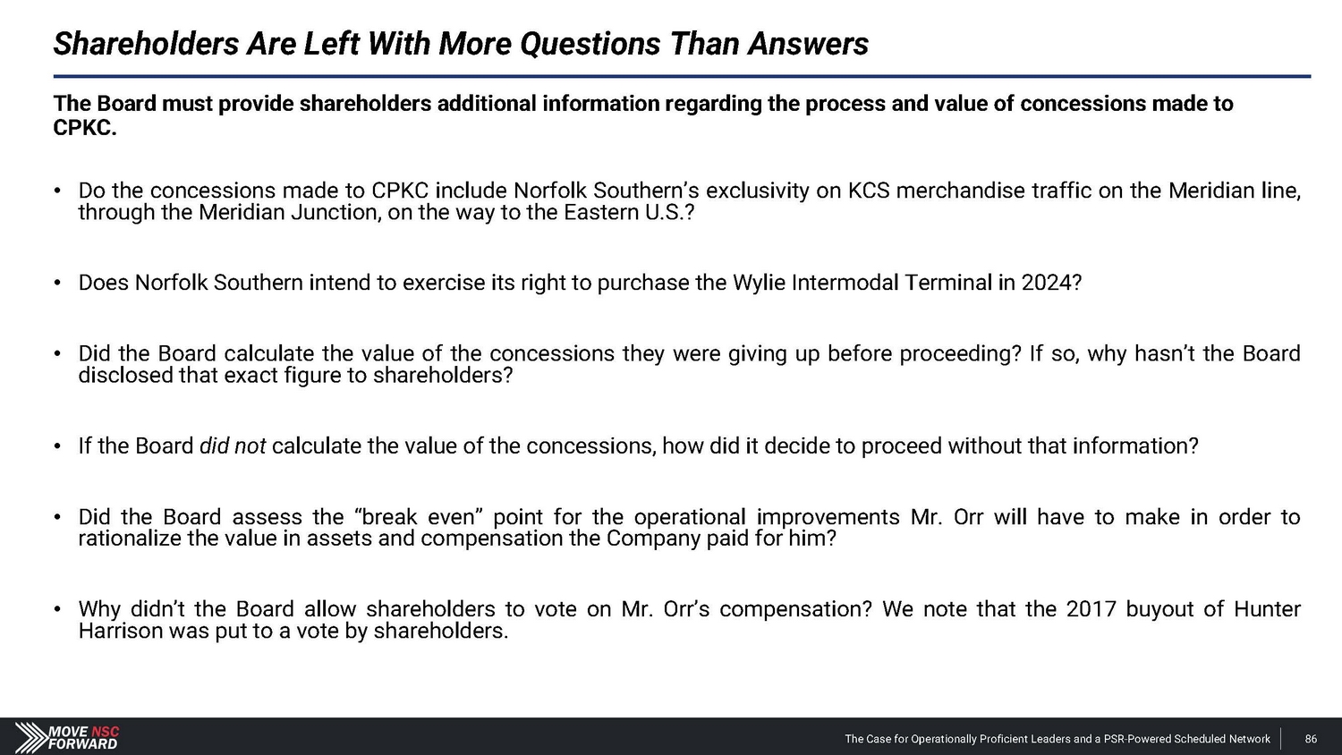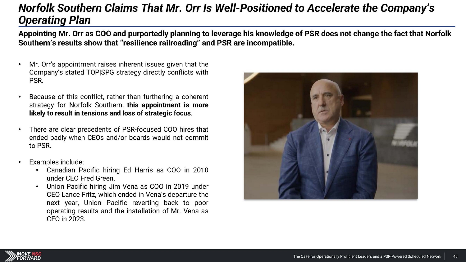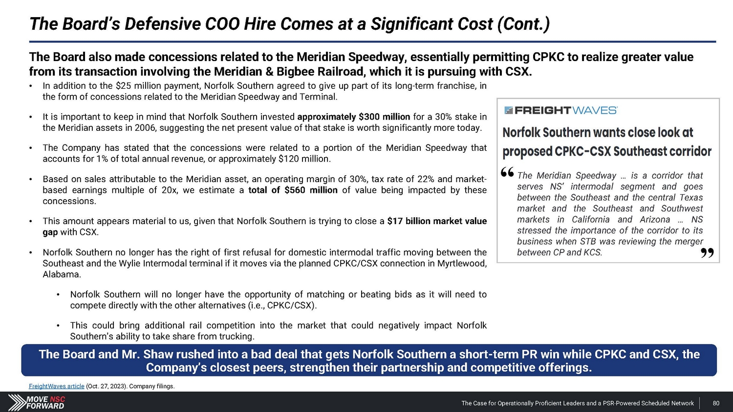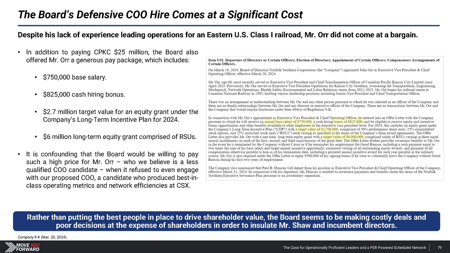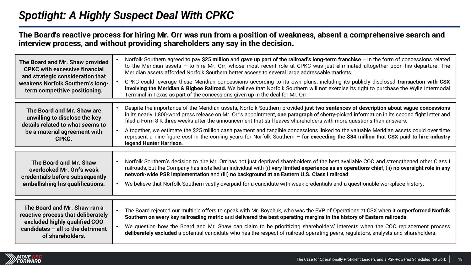 Spotlight: A Highly Suspect Deal With CPKC The Case for Operationally Proficient Leaders and a PSR - Powered Scheduled Network 18 The Board's reactive process for hiring Mr. Orr was run from a position of weakness, absent a comprehensive search and interview process, and without providing shareholders any say in the decision. The Board and Mr. Shaw provided CPKC with excessive financial and strategic consideration that weakens Norfolk Southern’s long - term competitive positioning. • Norfolk Southern agreed to pay $ 25 million and gave up part of the railroad’s long - term franchise – in the form of concessions related to the Meridian assets – to hire Mr . Orr, whose most recent role at CPKC was just eliminated altogether upon his departure . The Meridian assets afforded Norfolk Southern better access to several large addressable markets . • CPKC could leverage these Meridian concessions according to its own plans, including its publicly disclosed transaction with CSX involving the Meridian & Bigbee Railroad . We believe that Norfolk Southern will not exercise its right to purchase the Wylie Intermodal Terminal in Texas as part of the concessions given up in the deal for Mr . Orr . The Board and Mr. Shaw are unwilling to disclose the key details related to what seems to be a material agreement with CPKC. • Despite the importance of the Meridian assets, Norfolk Southern provided just two sentences of description about vague concessions in its nearly 1 , 800 - word press release on Mr . Orr’s appointment, one paragraph of cherry - picked information in its second fight letter and filed a Form 8 - K three weeks after the announcement that still leaves shareholders with more questions than answers . • Altogether, we estimate the $ 25 million cash payment and tangible concessions linked to the valuable Meridian assets could over time represent a nine - figure cost in the coming years for Norfolk Southern – far exceeding the $ 84 million that CSX paid to hire industry legend Hunter Harrison . The Board and Mr. Shaw overlooked Mr. Orr’s weak credentials before subsequently embellishing his qualifications. • Norfolk Southern’s decision to hire Mr . Orr has not just deprived shareholders of the best available COO and strengthened other Class I railroads, but the Company has installed an individual with (i) very limited experience as an operations chief , (ii) no oversight role in any network - wide PSR implementation and (iii) no background at an Eastern U . S . Class I railroad . • We believe that Norfolk Southern vastly overpaid for a candidate with weak credentials and a questionable workplace history . The Board and Mr. Shaw ran a reactive process that deliberately excluded highly qualified COO candidates – all to the detriment of shareholders. • The Board rejected our multiple offers to speak with Mr. Boychuk, who was the EVP of Operations at CSX when it outperformed Norfolk Southern on every key railroading metric and delivered the best operating margins in the history of Eastern railroads . • We question how the Board and Mr. Shaw can claim to be prioritizing shareholders’ interests when the COO replacement process deliberately excluded a potential candidate who has the respect of railroad operating peers, regulators, analysts and shareholders.