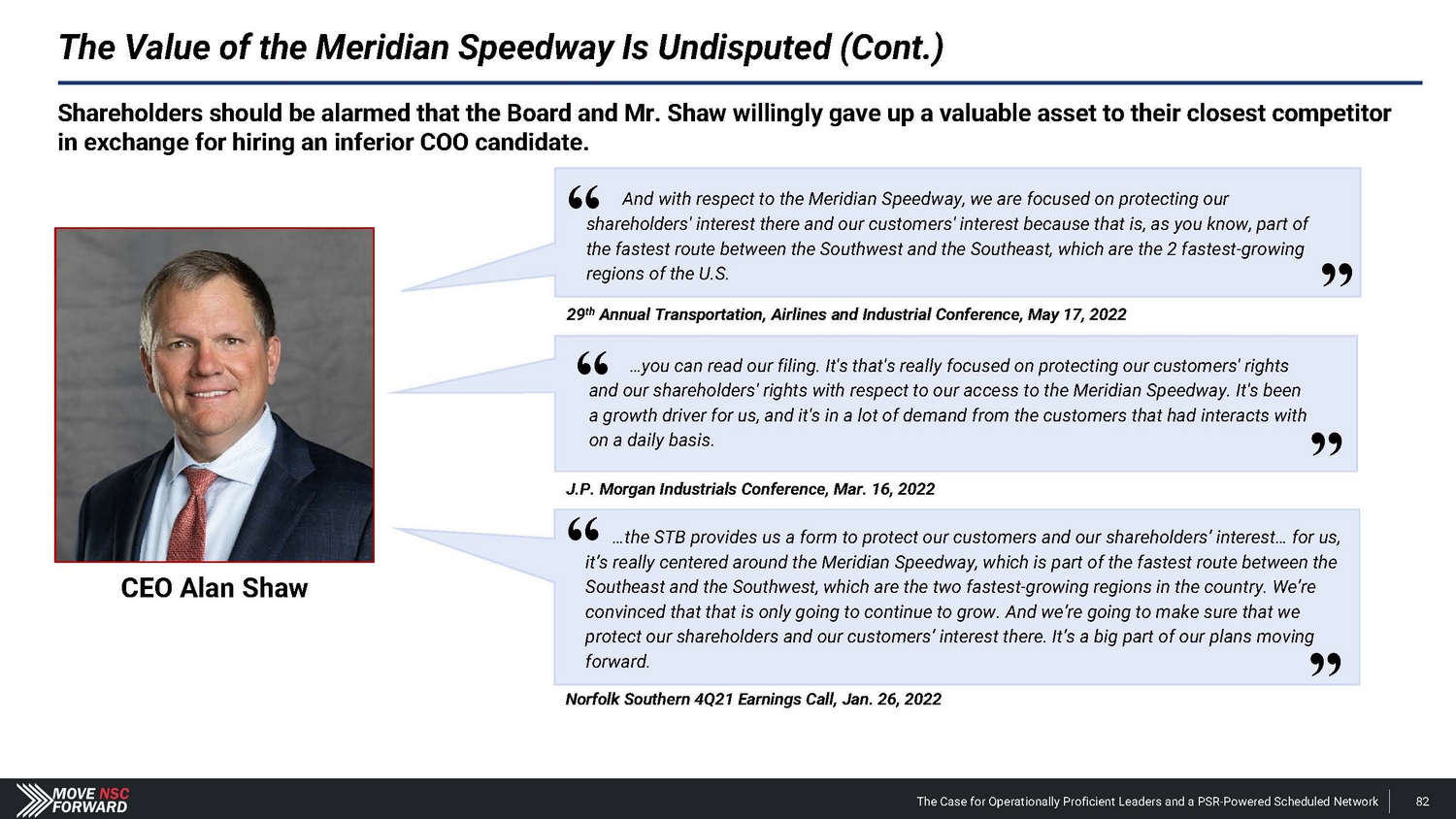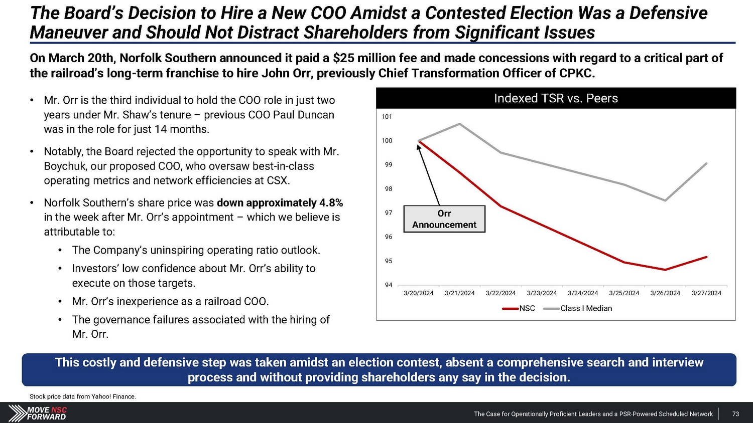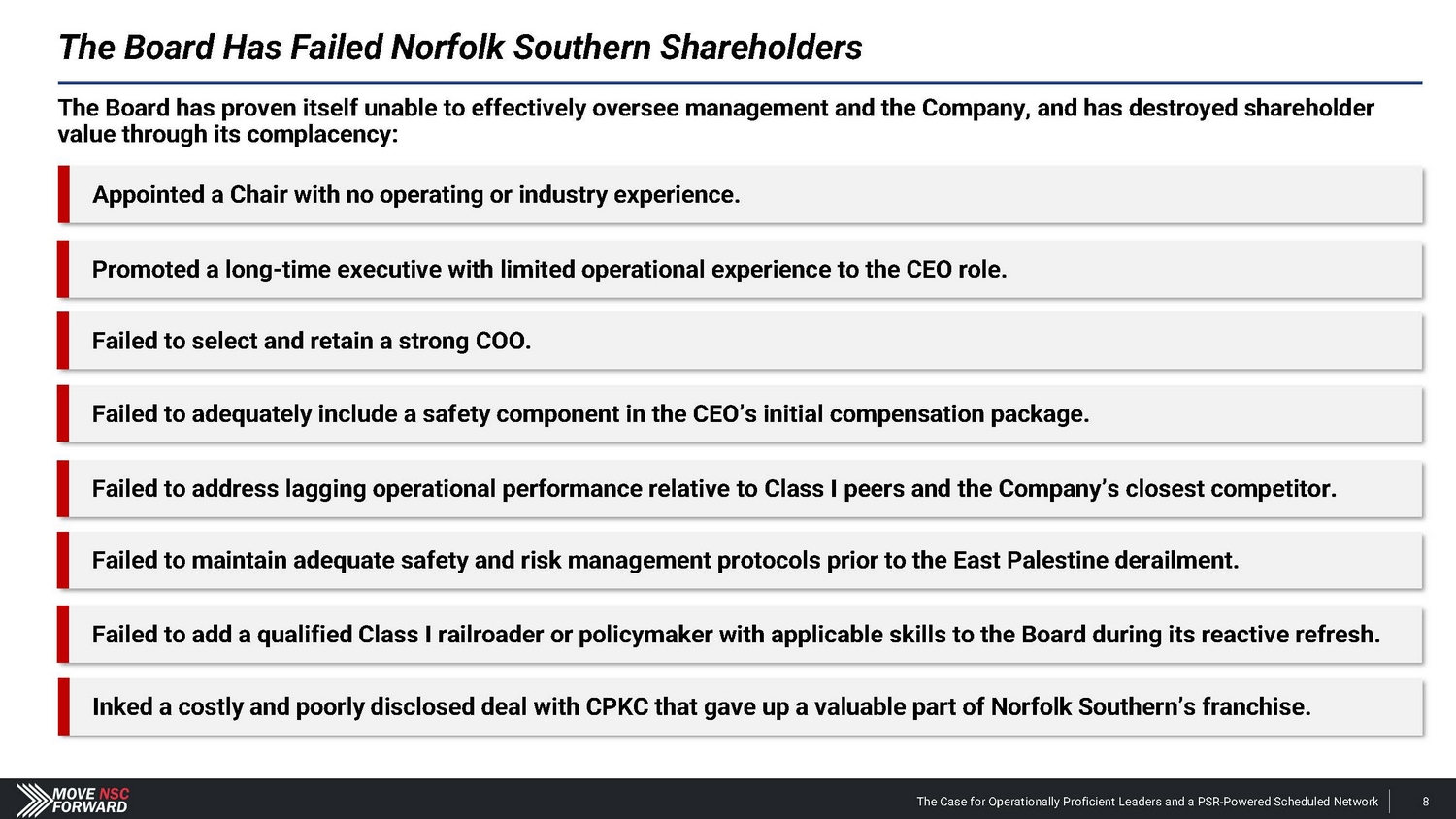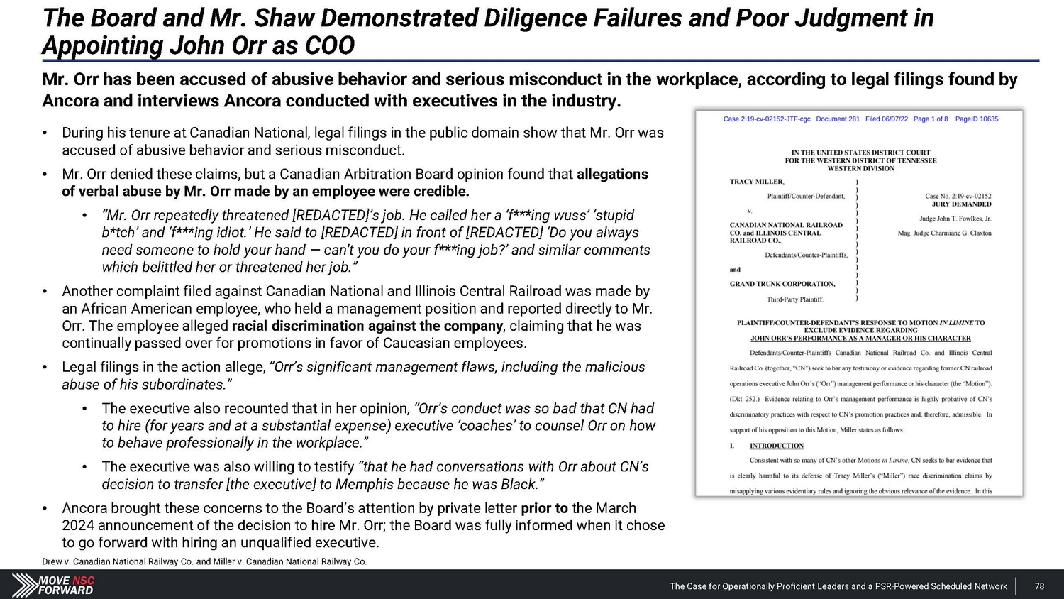 Spotlight: A Highly Suspect Deal With CPKC The Case for Operationally Proficient Leaders and a PSR - Powered Scheduled Network 18 The Board's reactive process for hiring Mr. Orr was run from a position of weakness, absent a comprehensive search and interview process, and without providing shareholders any say in the decision. The Board and Mr. Shaw provided CPKC with excessive financial and strategic consideration that weakens Norfolk Southern’s long - term competitive positioning. • Norfolk Southern agreed to pay $ 25 million and gave up part of the railroad’s long - term franchise – in the form of concessions related to the Meridian assets – to hire Mr . Orr, whose most recent role at CPKC was just eliminated altogether upon his departure . The Meridian assets afforded Norfolk Southern better access to several large addressable markets . • CPKC could leverage these Meridian concessions according to its own plans, including its publicly disclosed transaction with CSX involving the Meridian & Bigbee Railroad . We believe that Norfolk Southern will not exercise its right to purchase the Wylie Intermodal Terminal in Texas as part of the concessions given up in the deal for Mr . Orr . The Board and Mr. Shaw are unwilling to disclose the key details related to what seems to be a material agreement with CPKC. • Despite the importance of the Meridian assets, Norfolk Southern provided just two sentences of description about vague concessions in its nearly 1 , 800 - word press release on Mr . Orr’s appointment, one paragraph of cherry - picked information in its second fight letter and filed a Form 8 - K three weeks after the announcement that still leaves shareholders with more questions than answers . • Altogether, we estimate the $ 25 million cash payment and tangible concessions linked to the valuable Meridian assets could over time represent a nine - figure cost in the coming years for Norfolk Southern – far exceeding the $ 84 million that CSX paid to hire industry legend Hunter Harrison . The Board and Mr. Shaw overlooked Mr. Orr’s weak credentials before subsequently embellishing his qualifications. • Norfolk Southern’s decision to hire Mr . Orr has not just deprived shareholders of the best available COO and strengthened other Class I railroads, but the Company has installed an individual with (i) very limited experience as an operations chief , (ii) no oversight role in any network - wide PSR implementation and (iii) no background at an Eastern U . S . Class I railroad . • We believe that Norfolk Southern vastly overpaid for a candidate with weak credentials and a questionable workplace history . The Board and Mr. Shaw ran a reactive process that deliberately excluded highly qualified COO candidates – all to the detriment of shareholders. • The Board rejected our multiple offers to speak with Mr. Boychuk, who was the EVP of Operations at CSX when it outperformed Norfolk Southern on every key railroading metric and delivered the best operating margins in the history of Eastern railroads . • We question how the Board and Mr. Shaw can claim to be prioritizing shareholders’ interests when the COO replacement process deliberately excluded a potential candidate who has the respect of railroad operating peers, regulators, analysts and shareholders.