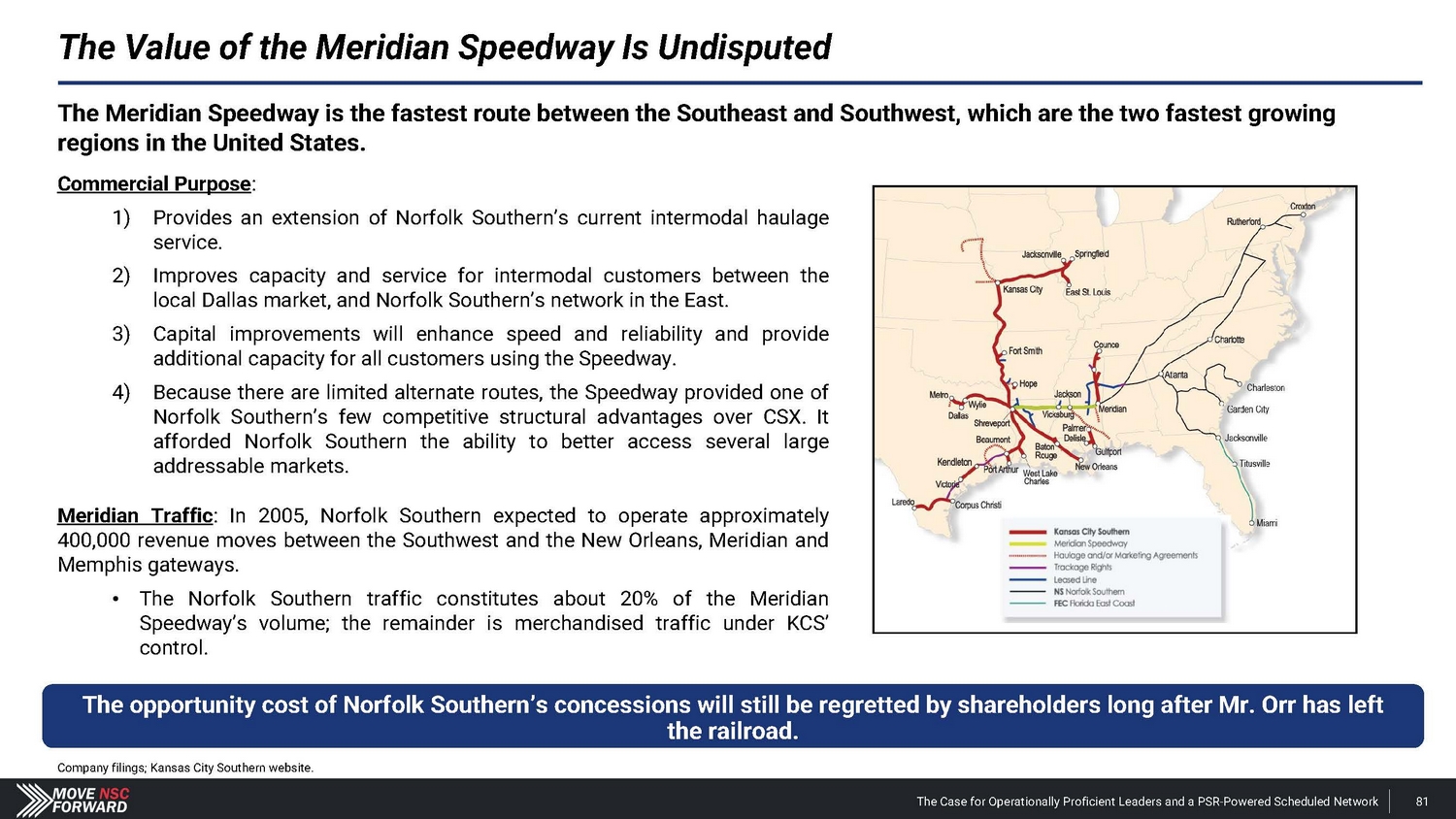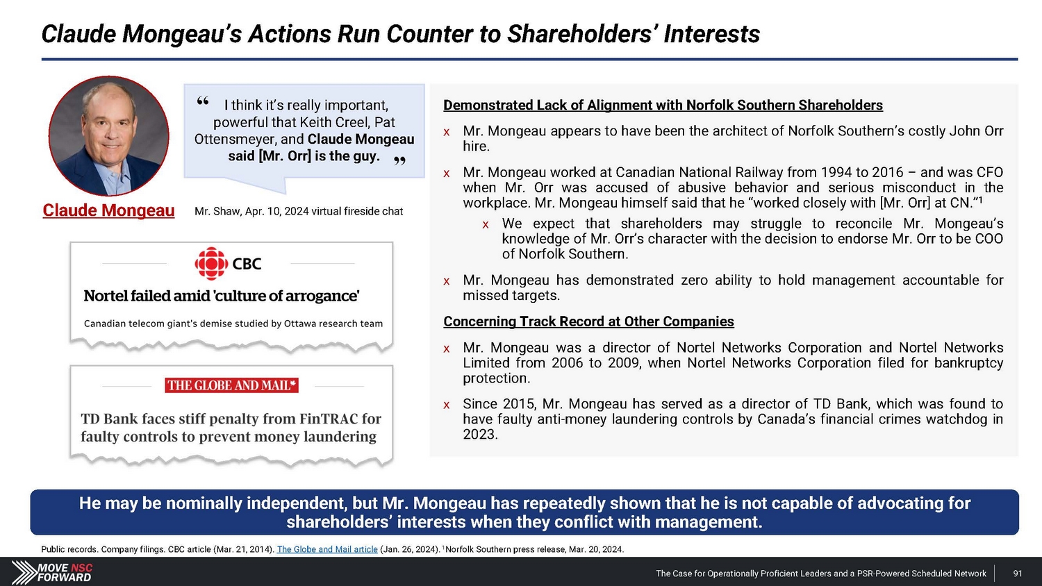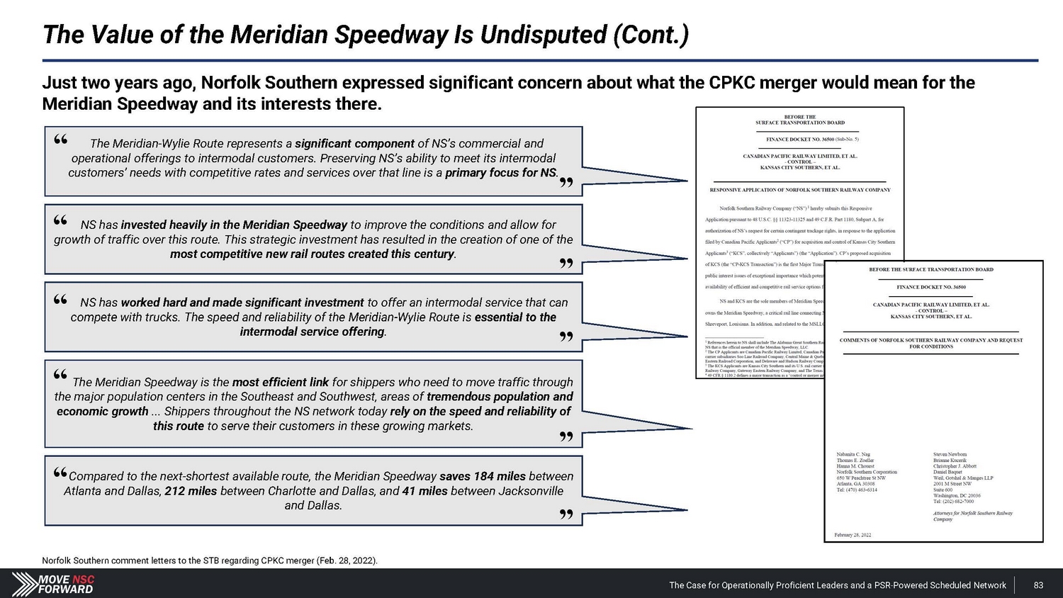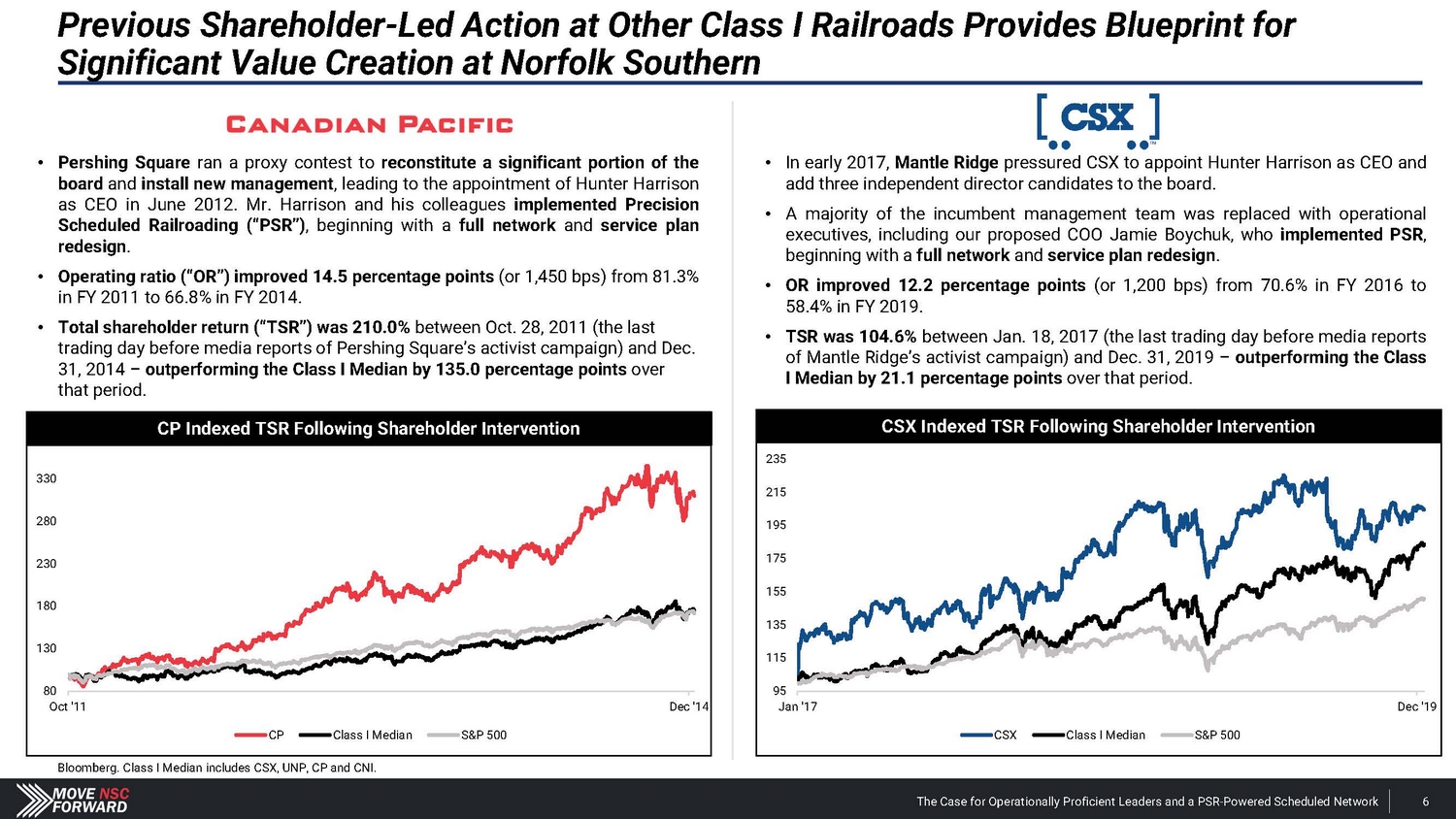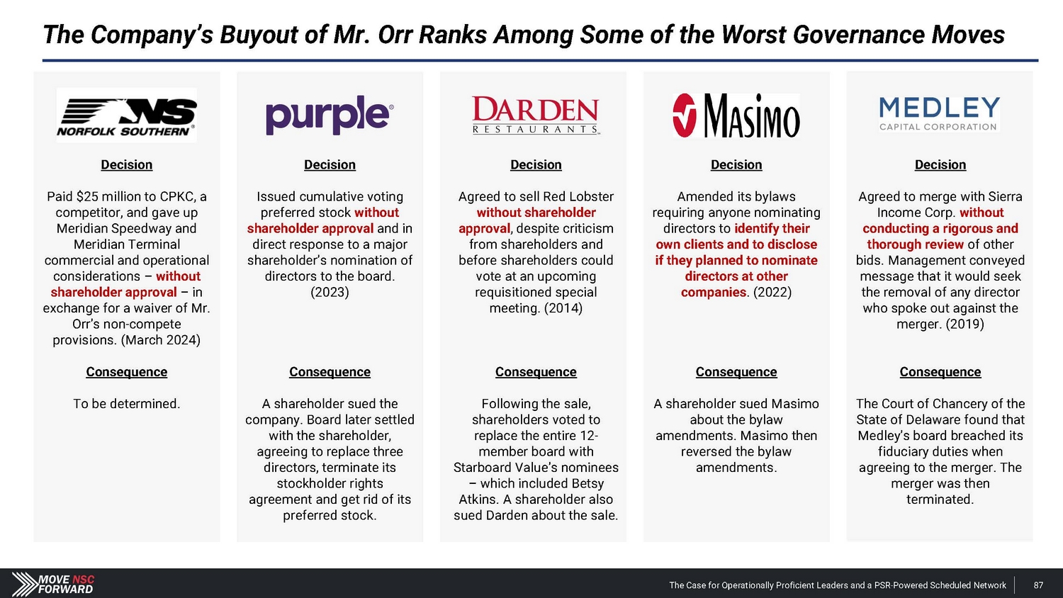 Spotlight: A Highly Suspect Deal With CPKC The Case for Operationally Proficient Leaders and a PSR - Powered Scheduled Network 18 The Board's reactive process for hiring Mr. Orr was run from a position of weakness, absent a comprehensive search and interview process, and without providing shareholders any say in the decision. The Board and Mr. Shaw provided CPKC with excessive financial and strategic consideration that weakens Norfolk Southern’s long - term competitive positioning. • Norfolk Southern agreed to pay $ 25 million and gave up part of the railroad’s long - term franchise – in the form of concessions related to the Meridian assets – to hire Mr . Orr, whose most recent role at CPKC was just eliminated altogether upon his departure . The Meridian assets afforded Norfolk Southern better access to several large addressable markets . • CPKC could leverage these Meridian concessions according to its own plans, including its publicly disclosed transaction with CSX involving the Meridian & Bigbee Railroad . We believe that Norfolk Southern will not exercise its right to purchase the Wylie Intermodal Terminal in Texas as part of the concessions given up in the deal for Mr . Orr . The Board and Mr. Shaw are unwilling to disclose the key details related to what seems to be a material agreement with CPKC. • Despite the importance of the Meridian assets, Norfolk Southern provided just two sentences of description about vague concessions in its nearly 1 , 800 - word press release on Mr . Orr’s appointment, one paragraph of cherry - picked information in its second fight letter and filed a Form 8 - K three weeks after the announcement that still leaves shareholders with more questions than answers . • Altogether, we estimate the $ 25 million cash payment and tangible concessions linked to the valuable Meridian assets could over time represent a nine - figure cost in the coming years for Norfolk Southern – far exceeding the $ 84 million that CSX paid to hire industry legend Hunter Harrison . The Board and Mr. Shaw overlooked Mr. Orr’s weak credentials before subsequently embellishing his qualifications. • Norfolk Southern’s decision to hire Mr . Orr has not just deprived shareholders of the best available COO and strengthened other Class I railroads, but the Company has installed an individual with (i) very limited experience as an operations chief , (ii) no oversight role in any network - wide PSR implementation and (iii) no background at an Eastern U . S . Class I railroad . • We believe that Norfolk Southern vastly overpaid for a candidate with weak credentials and a questionable workplace history . The Board and Mr. Shaw ran a reactive process that deliberately excluded highly qualified COO candidates – all to the detriment of shareholders. • The Board rejected our multiple offers to speak with Mr. Boychuk, who was the EVP of Operations at CSX when it outperformed Norfolk Southern on every key railroading metric and delivered the best operating margins in the history of Eastern railroads . • We question how the Board and Mr. Shaw can claim to be prioritizing shareholders’ interests when the COO replacement process deliberately excluded a potential candidate who has the respect of railroad operating peers, regulators, analysts and shareholders.