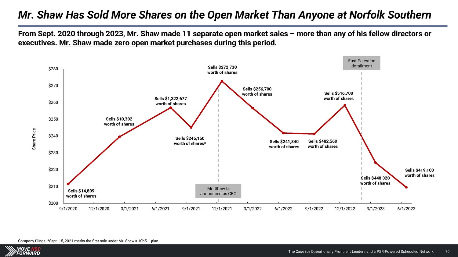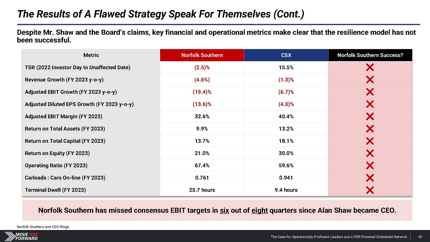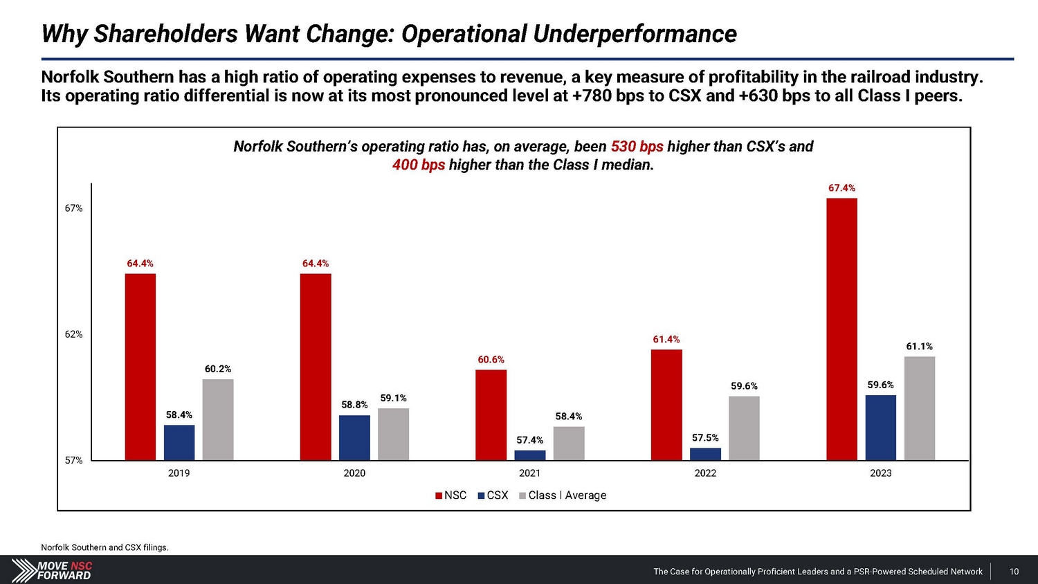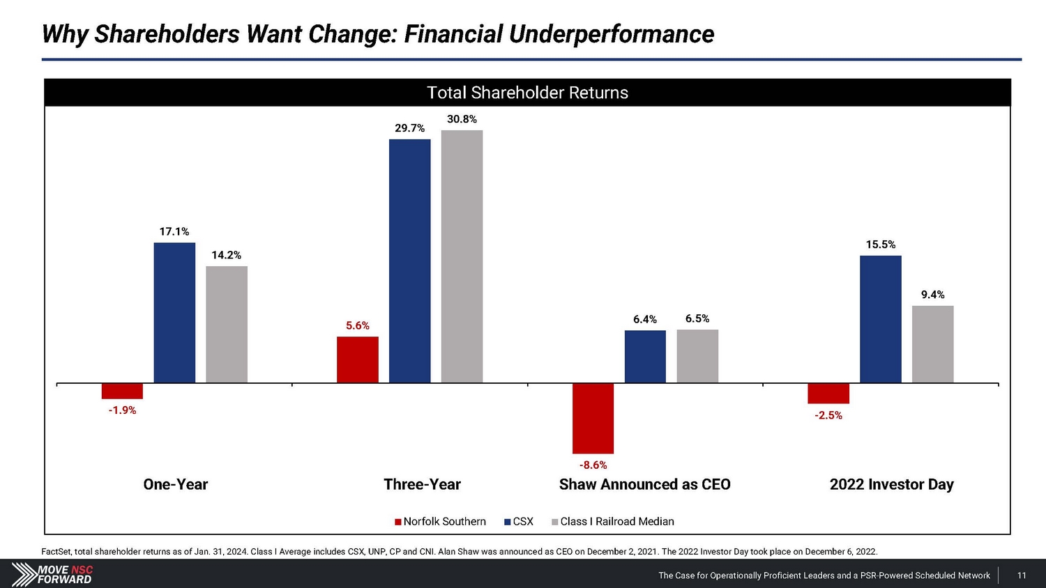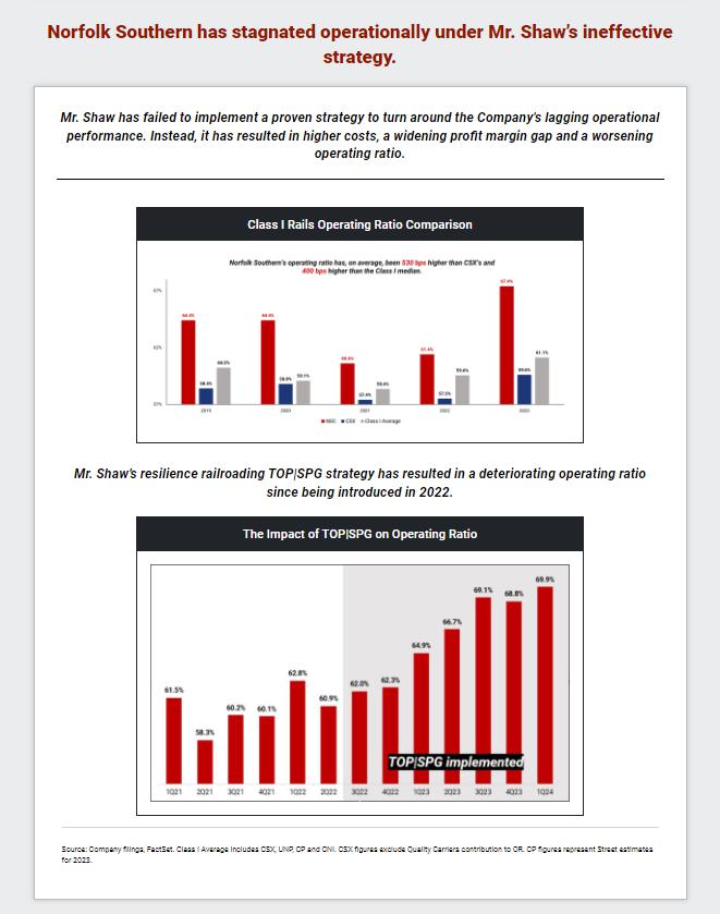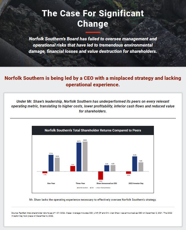 Where Norfolk Southern Stands Today: The Worst - Performing Class I Railroad public disclosure of investor group activity in The Wall Street Journal. The Case for Operationally Proficient Leaders and a PSR - Powered Scheduled Network 9 Company Snapshot • Norfolk Southern (“NSC”) is a Class I freight railroad that operates across the eastern U . S . , making its operations more complex than that of other Class I rails . • In December 2021 , Norfolk Southern announced that Alan Shaw, a 30 - year insider who failed to deliver growth in his prior role as Chief Marketing Officer, would assume the CEO role in May 2022 following the retirement of James Squires . • In February 2023 , a Norfolk Southern train carrying hazardous chemicals derailed in East Palestine, Ohio – resulting in lingering community damage, reputational harm and value destruction . FY 2023 vs. FY 2022 Performance • Railway Operating Revenues : (4.6%) • Change in Income from Railway Operations (Derailment Adjusted) : (19.4%) • Railway Operating Expenses : +$1.4 billion , including a $1.1 billion charge associated with the East Palestine derailment. • Operating Ratio : +600 bps • Norfolk Southern vs. CSX (same geographic footprint, track miles and freight mix): • 800 bps worse operating ratio • $1.6 billion less operating income • $17 billion market value gap (25% less market value) Source: Company filings. Current Leadership Total Shareholder Returns vs. Peers CEO Alan Shaw Newly Appointed COO John Orr • 30 - year NSC insider with experience in cost analysis, marketing, chemical and coal staff positions. • Minimal operational or financial experience. • No network management or logistics experience. • Delivered anemic revenue CAGR of 1% over the six years he served as CMO of Norfolk Southern. • Oversaw a flawed resilience railroading strategy as CEO. • Extremely unlikely he will be able to create value that repays NSC shareholders for the massive consideration paid to CPKC. • Lacks the right experience to lead operations at an Eastern U.S. railroad. • Most recent role as CPKC Chief Transformation Officer was dissolved at CPKC. • Is not a PSR implementation expert – has never redesigned a rail network (notwithstanding the incumbents’ claims to the contrary). (11.9%) NSC vs. Class I Railroad Median (18.0%) Norfolk Southern vs. CSX - 20% - 15% - 10% - 5% 0% Source: Bloomberg. Performance runs from 2022 Investor Day on Dec. 6, 2022 through Jan. 31, 2024, the first
