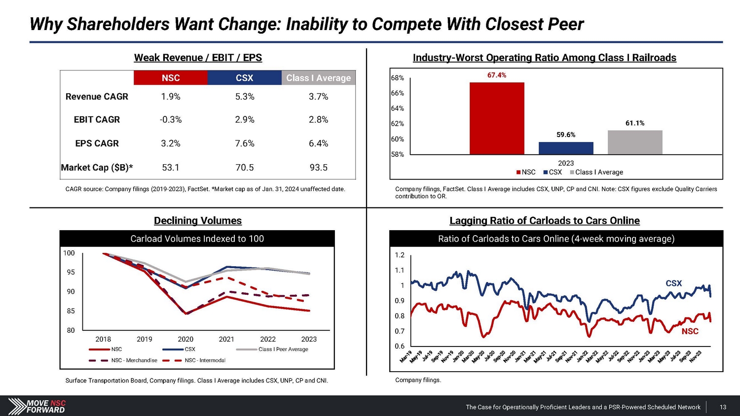 Why Shareholders Want Change: Poor Service and Avoidable Safety Issues Company filings; 1 Senator JD Vance press release (Mar. 6, 2024) and The Washington Post article (Mar. 6, 2024). Freight Volumes by Class: 2018 Carloads vs. 2023 Carloads (% Change) Intermodal NSC CSX 0.0% - 5.0% - 4.1% - 10.0% - 15.0% - 1 2 .6% Coal NSC CSX 0.0% - 10.0% - 2 0 .0% - 16.4% - 30.0% - 40.0% - 3 3 .0% Merchandise NSC CSX 0.0% - 5.0% - 2.8% - 10.0% - 15.0% - 1 1 .9% Numerous Derailments and Safety Lapses Have Occurred • After the East Palestine accident, Norfolk Southern conducted a “vent and burn” of the derailed train cars’ contents – an action that “lack[ed] sufficient scientific basis” – which sent a massive plume of toxic chemicals into the air, leading to long - term health and environmental concerns. 1 • The National Transportation Safety Board (“NTSB”) found that Norfolk Southern’s communication with emergency responders after the derailment was insufficient. • In 2024, Norfolk Southern has had four additional derailments over a ~2 - month period. • The March 2024 Lehigh Valley accident was seemingly preventable because it was the result of poor safety communications. • The derailment raises several concerns about Norfolk Southern’s current operations, management and culture. Rail shipping is not a differentiated business. The only explanation for lower carload volumes at Norfolk Southern compared to CSX is inferior service. The volume difference quantifies the service quality gap. The Case for Operationally Proficient Leaders and a PSR - Powered Scheduled Network 12