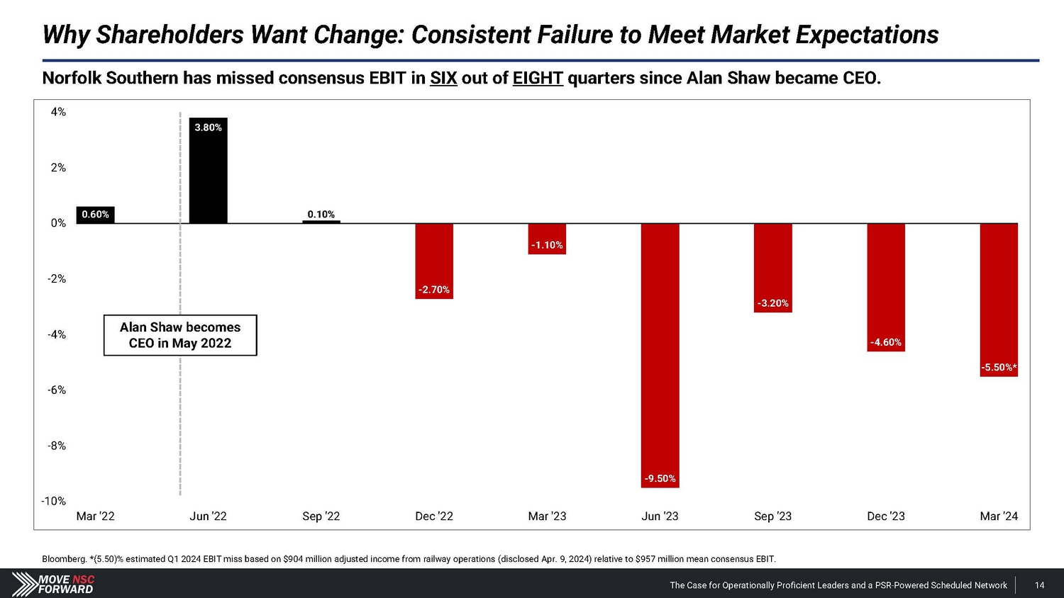 Surface Transportation Board, Company filings. Class I Average includes CSX, UNP, CP and CNI. Weak Revenue / EBIT / EPS Industry - Worst Operating Ratio Among Class I Railroads Declining Volumes Lagging Ratio of Carloads to Cars Online CAGR source: Company filings (2019 - 2023), FactSet. *Market cap as of Jan. 31, 2024 unaffected date. Company filings, FactSet. Class I Average includes CSX, UNP, CP and CNI. Note: CSX figures exclude Quality Carriers contribution to OR. Carload Volumes Indexed to 100 100 95 90 85 80 2018 2019 2020 2021 2022 2023 NSC CSX Class I Peer Average NSC - Merchandise NSC - Intermodal Ratio of Carloads to Cars Online (4 - week moving average) 1.2 1.1 1 CSX 0.9 0.8 0.7 NSC 0.6 68% 67.4% 66% 64% 62% 60% 58% 61.1% 59.6% 2023 NSC CSX Class I Average The Case for Operationally Proficient Leaders and a PSR - Powered Scheduled Network 13 Company filings. Why Shareholders Want Change: Inability to Compete With Closest Peer NSC CSX Class I Average Revenue CAGR 1.9% 5.3% 3.7% EBIT CAGR - 0.3% 2.9% 2.8% EPS CAGR 3.2% 7.6% 6.4% Market Cap ($B)* 53.1 70.5 93.5