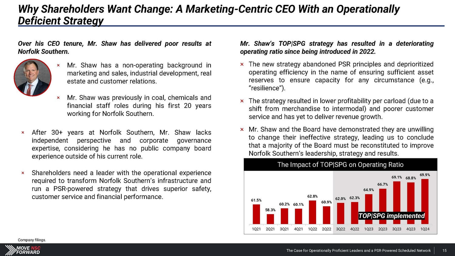 Why Shareholders Want Change: Consistent Failure to Meet Market Expectations Bloomberg. *(5.50)% estimated Q1 2024 EBIT miss based on $904 million adjusted income from railway operations (disclosed Apr. 9, 2024) relative to $957 million mean consensus EBIT. Norfolk Southern has missed consensus EBIT in SIX out of EIGHT quarters since Alan Shaw became CEO. 0.60% 3.80% 0.10% - 2.70% - 1.10% - 9.50% - 3.20% - 4.60% - 5.50% * - 10% - 8% - 6% - 4% - 2% 0% 2% 4% Mar '22 Jun '22 Sep '22 Dec '22 Mar '23 Jun '23 Sep '23 Dec '23 Mar '24 Alan Shaw becomes CEO in May 2022 The Case for Operationally Proficient Leaders and a PSR - Powered Scheduled Network 14
