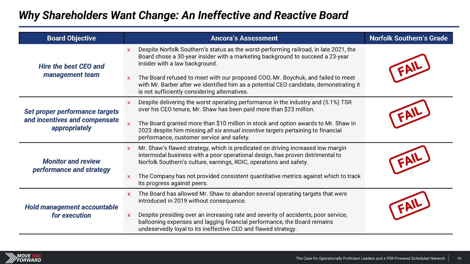 Mr. Shaw’s TOP|SPG strategy has resulted in a deteriorating operating ratio since being introduced in 2022. ð The new strategy abandoned PSR principles and deprioritized operating efficiency in the name of ensuring sufficient asset reserves to ensure capacity for any circumstance (e . g . , “resilience”) . ð The strategy resulted in lower profitability per carload (due to a shift from merchandise to intermodal) and poorer customer service and has yet to deliver revenue growth . ð Mr . Shaw and the Board have demonstrated they are unwilling to change their ineffective strategy, leading us to conclude that a majority of the Board must be reconstituted to improve Norfolk Southern’s leadership, strategy and results . 6 1. 5 % 6 0. 2 % 6 0. 1 % 6 2. 8 % 6 0. 9 % 6 2. 0 % 6 2. 3 % 6 4. 9 % 6 6. 7 % 6 9. 1 % 6 8. 8 % 6 9. 9 % The Impact of TOP|SPG on Operating Ratio 58.3% TOP|SPG implemented 1Q 21 2Q 21 3Q 21 4Q 21 1Q 22 2Q 22 3Q 22 4Q 22 1Q 23 2Q 23 3Q 23 4Q 23 1Q 24 Company filings. Why Shareholders Want Change: A Marketing - Centric CEO With an Operationally Deficient Strategy п Mr . Shaw has a non - operating background in marketing and sales, industrial development, real estate and customer relations . п Mr . Shaw was previously in coal, chemicals and financial staff roles during his first 20 years working for Norfolk Southern . Over his CEO tenure, Mr. Shaw has delivered poor results at Norfolk Southern. п Afte r 3 0 + year s a t Nor f ol k S o u t hern, M r . S h aw la c k s independent perspective and corporate governance expertise, considering he has no public company board experience outside of his current role . п Shareholders need a leader with the operational experience required to transform Norfolk Southern’s infrastructure and run a PSR - powered strategy that drives superior safety, customer service and financial performance . The Case for Operationally Proficient Leaders and a PSR - Powered Scheduled Network 15
