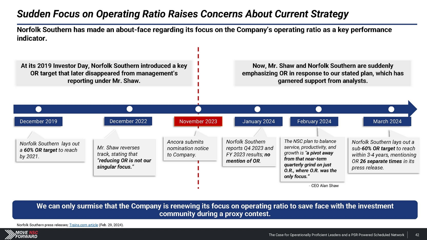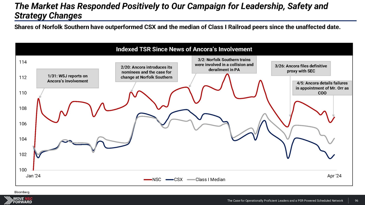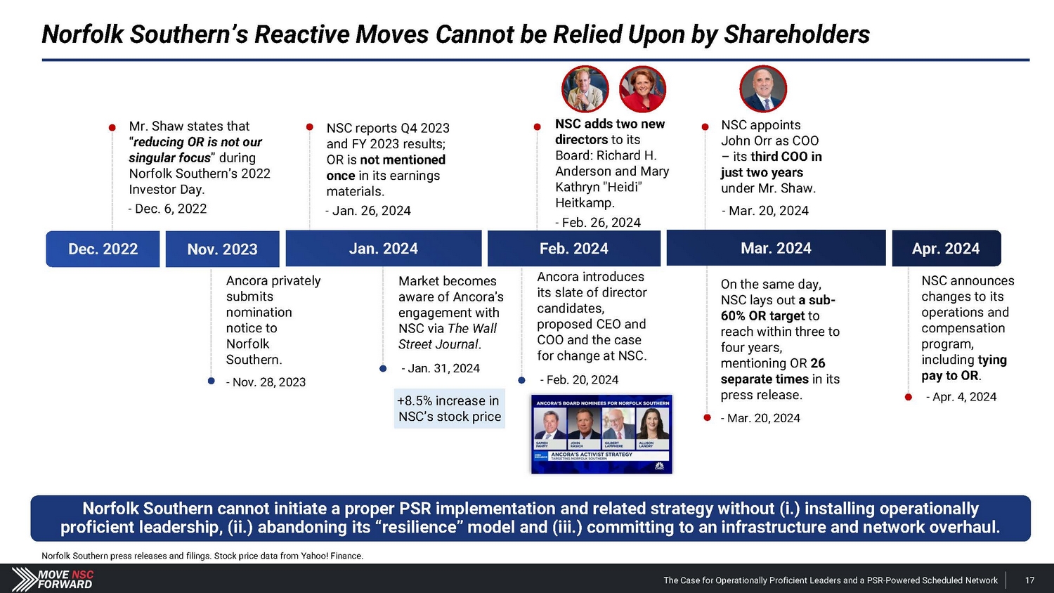 Norfolk Southern’s Reactive Moves Cannot be Relied Upon by Shareholders Norfolk Southern cannot initiate a proper PSR implementation and related strategy without (i.) installing operationally proficient leadership, (ii.) abandoning its “resilience” model and (iii.) committing to an infrastructure and network overhaul. Norfolk Southern press releases and filings. Stock price data from Yahoo! Finance. NSC adds two new directors to its Board: Richard H. Anderson and Mary Kathryn "Heidi" Heitkamp. - Feb. 26, 2024 NSC reports Q4 2023 and FY 2023 results; OR is not mentioned once in its earnings materials. - Jan. 26, 2024 Ancora privately submits nomination notice to Norfolk Southern. - Nov. 28, 2023 Market becomes aware of Ancora’s engagement with NSC via The Wall Street Journal . - Jan. 31, 2024 NSC appoints John Orr as COO – its third COO in just two years under Mr. Shaw. - Mar. 20, 2024 On the same day, NSC lays out a sub - 60% OR target to reach within three to four years, mentioning OR 26 separate times in its press release. - Mar. 20, 2024 NSC announces changes to its operations and compensation program, including tying pay to OR . - Apr. 4, 2024 +8.5% increase in NSC’s stock price Ancora introduces its slate of director candidates, proposed CEO and COO and the case for change at NSC. - Feb. 20, 2024 Jan. 2024 Feb. 2024 Mar. 2024 Mr. Shaw states that “ reducing OR is not our singular focus ” during Norfolk Southern’s 2022 Investor Day. - Dec. 6, 2022 Dec. 2022 Nov. 2023 Apr. 2024 The Case for Operationally Proficient Leaders and a PSR - Powered Scheduled Network 17
