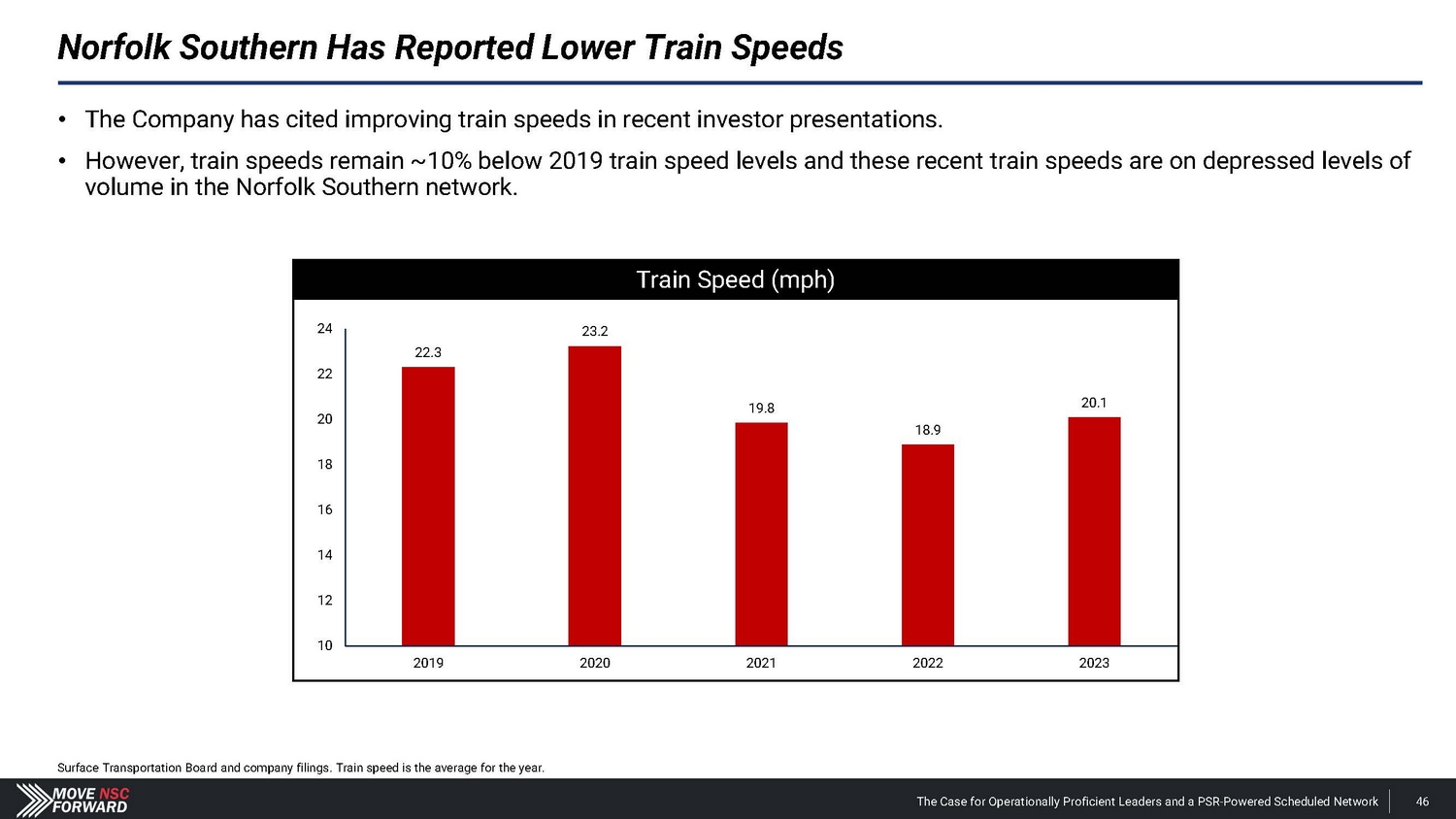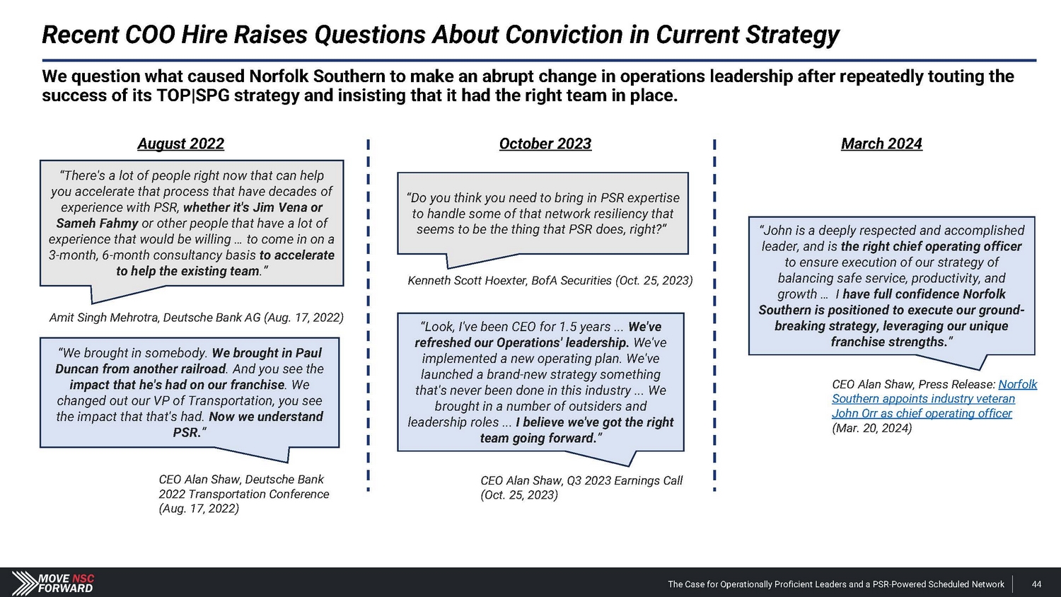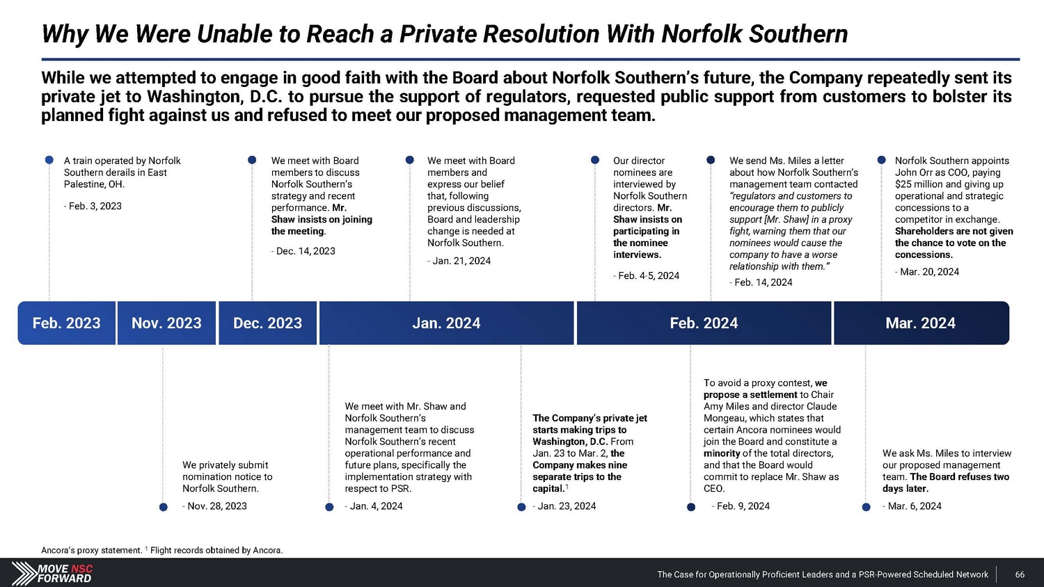 Norfolk Southern’s Reactive Moves Cannot be Relied Upon by Shareholders Norfolk Southern cannot initiate a proper PSR implementation and related strategy without (i.) installing operationally proficient leadership, (ii.) abandoning its “resilience” model and (iii.) committing to an infrastructure and network overhaul. Norfolk Southern press releases and filings. Stock price data from Yahoo! Finance. NSC adds two new directors to its Board: Richard H. Anderson and Mary Kathryn "Heidi" Heitkamp. - Feb. 26, 2024 NSC reports Q4 2023 and FY 2023 results; OR is not mentioned once in its earnings materials. - Jan. 26, 2024 Ancora privately submits nomination notice to Norfolk Southern. - Nov. 28, 2023 Market becomes aware of Ancora’s engagement with NSC via The Wall Street Journal . - Jan. 31, 2024 NSC appoints John Orr as COO – its third COO in just two years under Mr. Shaw. - Mar. 20, 2024 On the same day, NSC lays out a sub - 60% OR target to reach within three to four years, mentioning OR 26 separate times in its press release. - Mar. 20, 2024 NSC announces changes to its operations and compensation program, including tying pay to OR . - Apr. 4, 2024 +8.5% increase in NSC’s stock price Ancora introduces its slate of director candidates, proposed CEO and COO and the case for change at NSC. - Feb. 20, 2024 Jan. 2024 Feb. 2024 Mar. 2024 Mr. Shaw states that “ reducing OR is not our singular focus ” during Norfolk Southern’s 2022 Investor Day. - Dec. 6, 2022 Dec. 2022 Nov. 2023 Apr. 2024 The Case for Operationally Proficient Leaders and a PSR - Powered Scheduled Network 17
