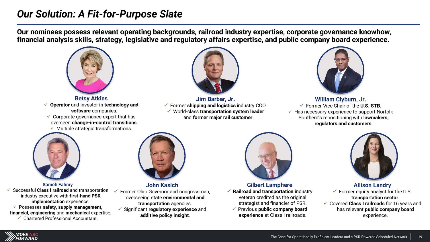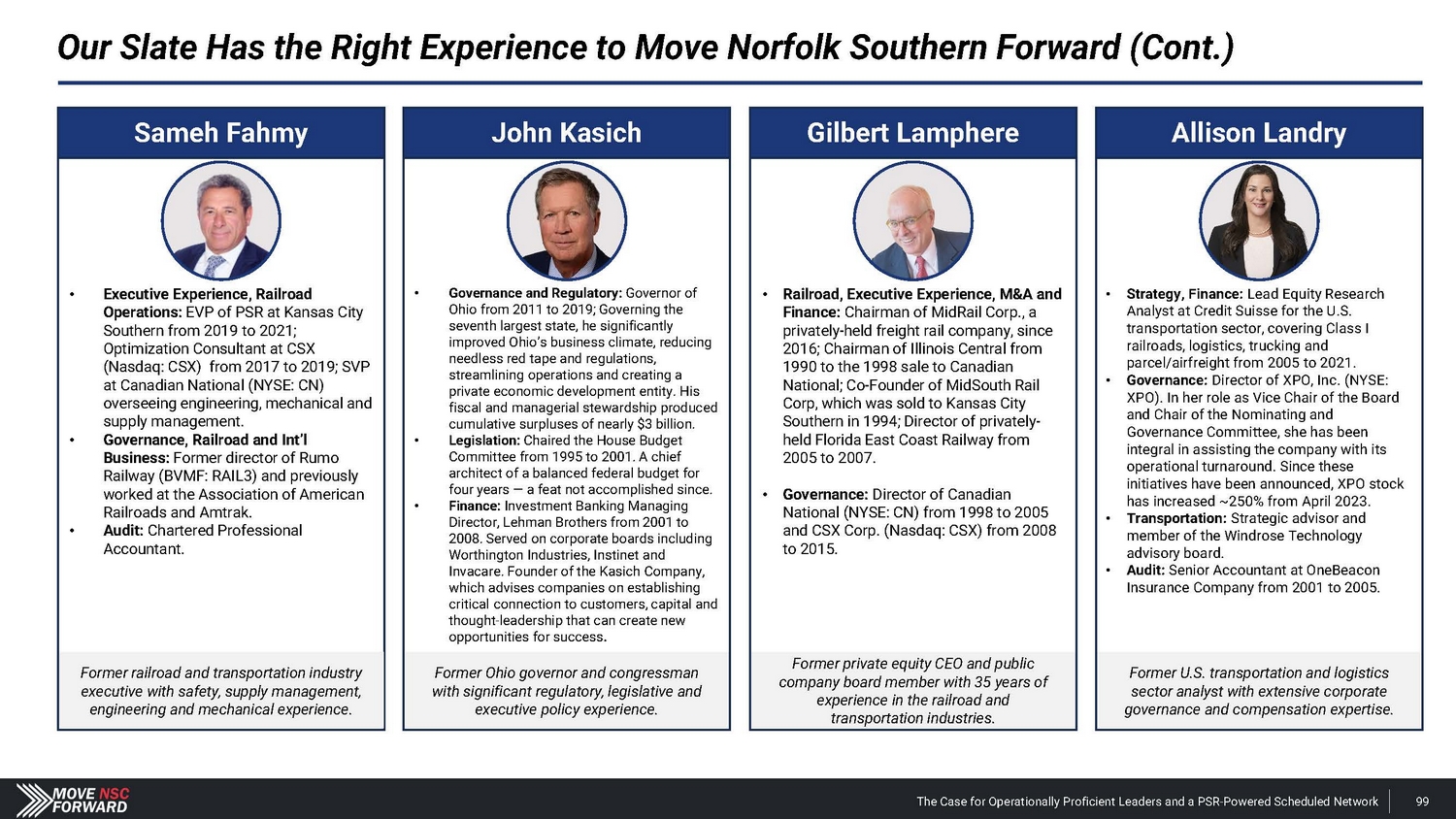 Our Slate Has the Right Experience to Move Norfolk Southern Forward (Cont.) Sameh Fahmy • Executive Experience, Railroad Operations: EVP of PSR at Kansas City Southern from 2019 to 2021; Optimization Consultant at CSX (Nasdaq: CSX) from 2017 to 2019; SVP at Canadian National (NYSE: CN) overseeing engineering, mechanical and supply management. • Governance, Railroad and Int’l Business: Former director of Rumo Railway (BVMF: RAIL3) and previously worked at the Association of American Railroads and Amtrak. • Audit: Chartered Professional Accountant. Former railroad and transportation industry executive with safety, supply management, engineering and mechanical experience . John Kasich • Governance and Regulatory: Governor of Ohio from 2011 to 2019; Governing the seventh largest state, he significantly improved Ohio’s business climate, reducing needless red tape and regulations, streamlining operations and creating a private economic development entity. His fiscal and managerial stewardship produced cumulative surpluses of nearly $3 billion. • Legislation: Chaired the House Budget Committee from 1995 to 2001. A chief architect of a balanced federal budget for four years — a feat not accomplished since. • Finance: Investment Banking Managing Director, Lehman Brothers from 2001 to 2008. Served on corporate boards including Worthington Industries, Instinet and Invacare. Founder of the Kasich Company, which advises companies on establishing critical connection to customers, capital and thought - leadership that can create new opportunities for success . Former Ohio governor and congressman with significant regulatory, legislative and executive policy experience. Gilbert Lamphere • Railroad, Executive Experience, M&A and Finance: Chairman of MidRail Corp., a privately - held freight rail company, since 2016; Chairman of Illinois Central from 1990 to the 1998 sale to Canadian National; Co - Founder of MidSouth Rail Corp, which was sold to Kansas City Southern in 1994; Director of privately - held Florida East Coast Railway from 2005 to 2007. • Governance: Director of Canadian National (NYSE: CN) from 1998 to 2005 and CSX Corp. (Nasdaq: CSX) from 2008 to 2015. Former private equity CEO and public company board member with 35 years of experience in the railroad and transportation industries. Allison Landry • Strategy, Finance: Lead Equity Research Analyst at Credit Suisse for the U.S. transportation sector, covering Class I railroads, logistics, trucking and parcel/airfreight from 2005 to 2021. • Governance: Director of XPO, Inc. (NYSE: XPO). In her role as Vice Chair of the Board and Chair of the Nominating and Governance Committee, she has been integral in assisting the company with its operational turnaround. Since these initiatives have been announced, XPO stock has increased ~250% from April 2023. • Transportation : Strategic advisor and member of the Windrose Technology advisory board . • Audit: Senior Accountant at OneBeacon Insurance Company from 2001 to 2005. Former U . S . transportation and logistics sector analyst with extensive corporate governance and compensation expertise . The Case for Operationally Proficient Leaders and a PSR - Powered Scheduled Network 99