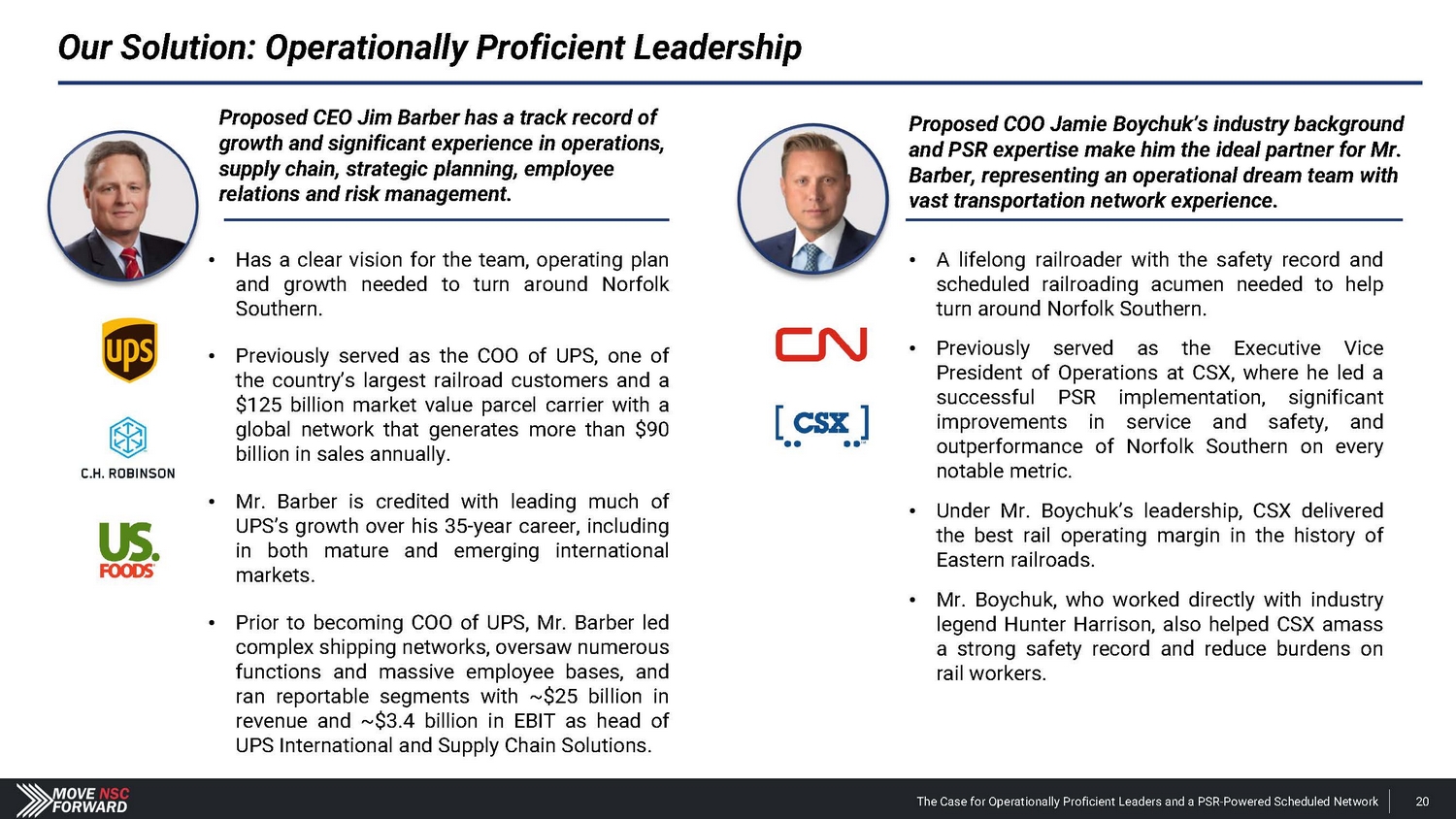 Proposed CEO Jim Barber has a track record of growth and significant experience in operations, supply chain, strategic planning, employee relations and risk management. • Has a clear vision for the team, operating plan and growth needed to turn around Norfolk Southern . • Previously served as the COO of UPS, one of the country’s largest railroad customers and a $ 125 billion market value parcel carrier with a global network that generates more than $ 90 billion in sales annually . • Mr . Barber is credited with leading much of UPS’s growth over his 35 - year career, including in both mature and emerging international markets . • Prior to becoming COO of UPS, Mr . Barber led complex shipping networks, oversaw numerous functions and massive employee bases, and ran reportable segments with ~ $ 25 billion in revenue and ~ $ 3 . 4 billion in EBIT as head of UPS International and Supply Chain Solutions . Proposed COO Jamie Boychuk’s industry background and PSR expertise make him the ideal partner for Mr . Barber, representing an operational dream team with vast transportation network experience . • A lifelong railroader with the safety record and scheduled railroading acumen needed to help turn around Norfolk Southern . • Previously served as the Executive Vice President of Operations at CSX, where he led a successful PSR implementation, significant improvements in service and safety, and outperformance of Norfolk Southern on every notable metric . • Under Mr . Boychuk’s leadership, CSX delivered the best rail operating margin in the history of Eastern railroads . • Mr . Boychuk, who worked directly with industry legend Hunter Harrison, also helped CSX amass a strong safety record and reduce burdens on rail workers . Our Solution: Operationally Proficient Leadership The Case for Operationally Proficient Leaders and a PSR - Powered Scheduled Network 20
