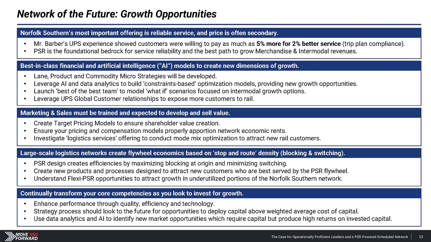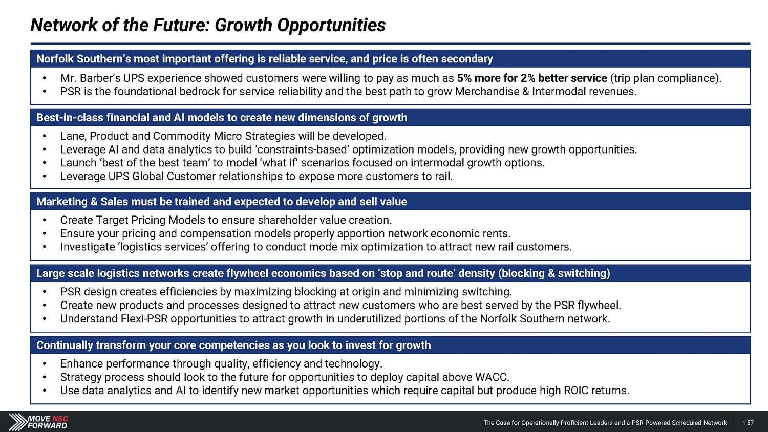Norfolk Southern’s most important offering is reliable service, and price is often secondary • Mr. Barber’s UPS experience showed customers were willing to pay as much as 5% more for 2% better service (trip plan compliance). • PSR is the foundational bedrock for service reliability and the best path to grow Merchandise & Intermodal revenues. Best - in - class financial and AI models to create new dimensions of growth • Lane, Product and Commodity Micro Strategies will be developed. • Leverage AI and data analytics to build ‘constraints - based’ optimization models, providing new growth opportunities. • Launch ‘best of the best team’ to model ‘what if’ scenarios focused on intermodal growth options. • Leverage UPS Global Customer relationships to expose more customers to rail. Marketing & Sales must be trained and expected to develop and sell value • Create Target Pricing Models to ensure shareholder value creation. • Ensure your pricing and compensation models properly apportion network economic rents. • Investigate ‘logistics services’ offering to conduct mode mix optimization to attract new rail customers. Large scale logistics networks create flywheel economics based on ‘stop and route’ density (blocking & switching) • PSR design creates efficiencies by maximizing blocking at origin and minimizing switching. • Create new products and processes designed to attract new customers who are best served by the PSR flywheel. • Understand Flexi - PSR opportunities to attract growth in underutilized portions of the Norfolk Southern network. Continually transform your core competencies as you look to invest for growth • Enhance performance through quality, efficiency and technology. • Strategy process should look to the future for opportunities to deploy capital above WACC. • Use data analytics and AI to identify new market opportunities which require capital but produce high ROIC returns. The Case for Operationally Proficient Leaders and a PSR - Powered Scheduled Network 157 Network of the Future: Growth Opportunities