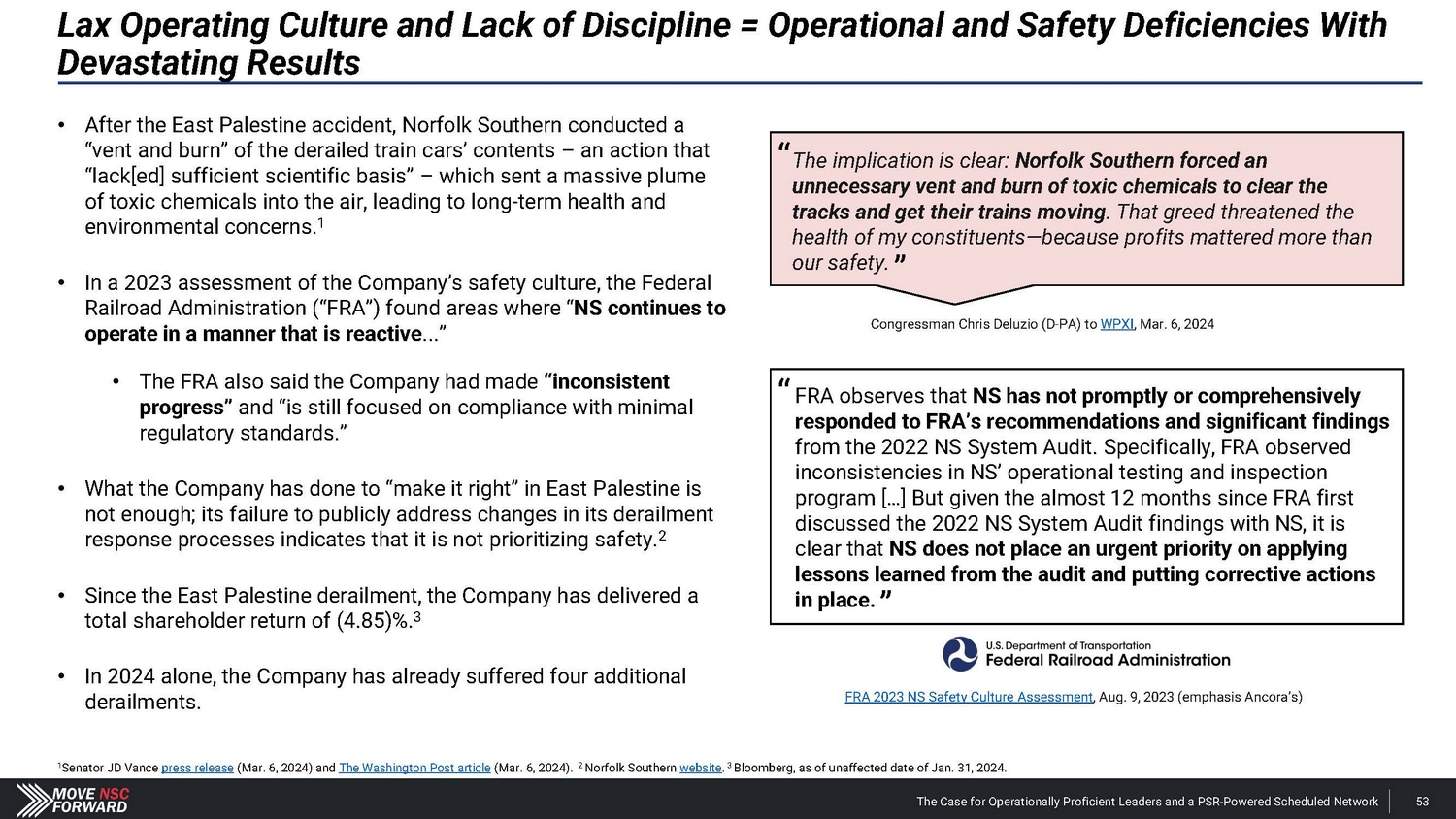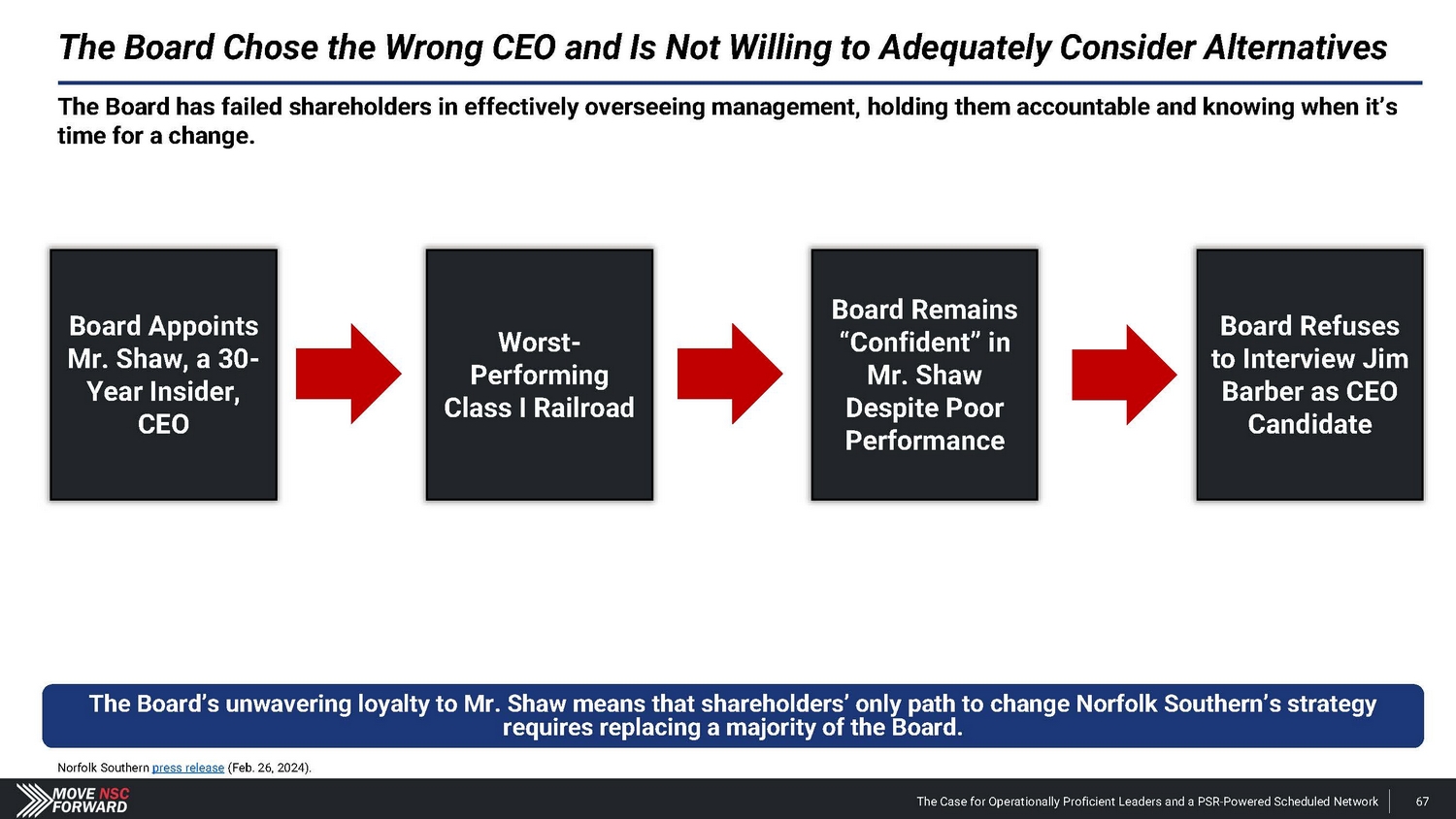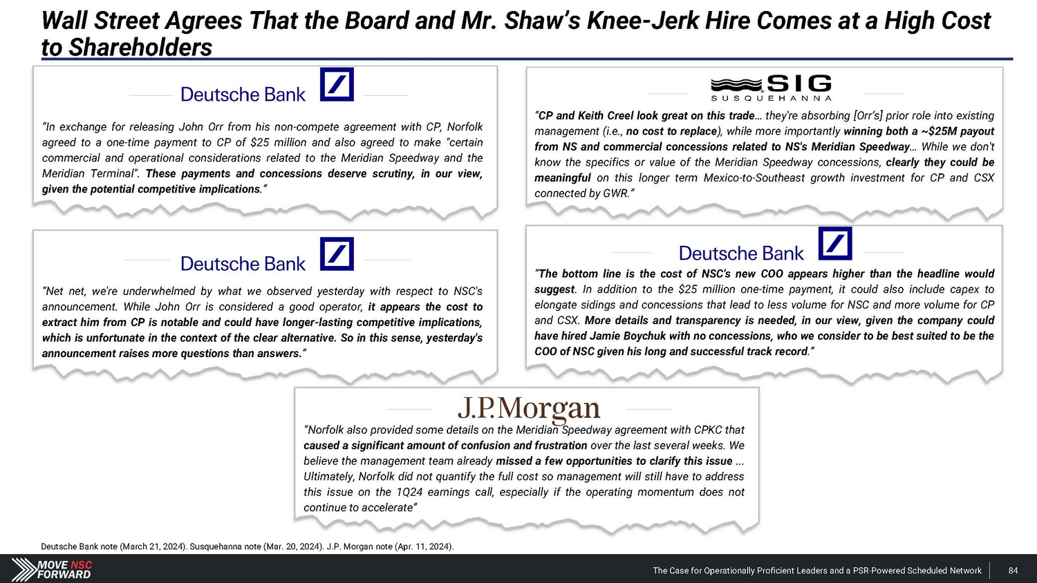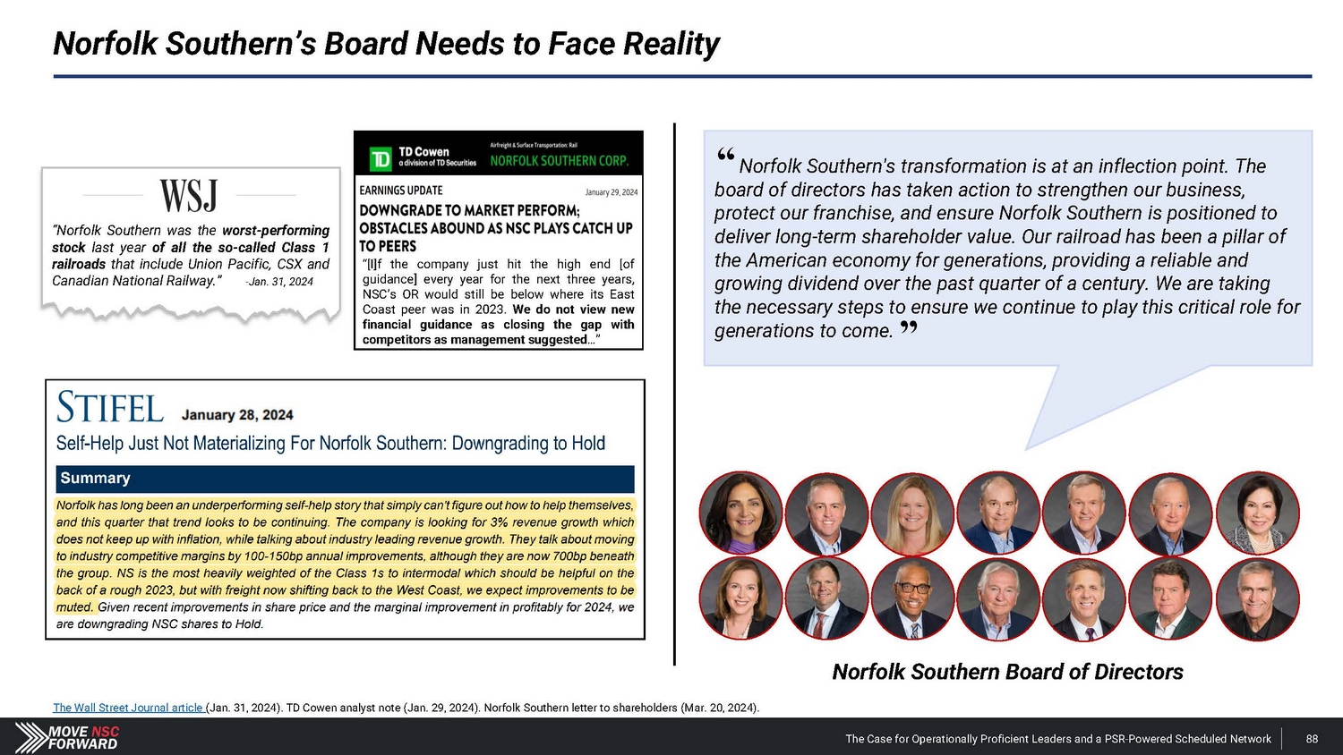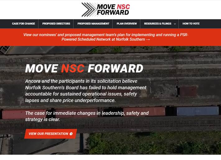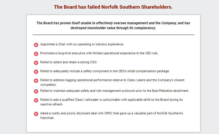 Shareholders and Sell - Side Analysts Support Our Campaign the board at NSC are warranted and could stimulate improved operations and thus equity performance. For these reasons, we intend to support the election of dissident nominees Betsy Atkins, James Barber, Jr., William Clyburn, Jr., Sameh Fahmy, John Kasich, Gilbert Lamphere, and Allison Landry. “ […] we believe a change in management and refreshment of ” “ We see value in potential management change with Jim Barber as CEO and Jamie Boychuk as COO as proposed by the activist investor Ancora … especially given the historical margin underperformance of Norfolk Southern.” ” and management would pose significant risk to service and safety. But in reality, NSC has already endured the most service and safety challenges in recent years , including the unfortunate events of East Palestine last year, and defective chassis across its network that impacted service and posed safety risks in 2021.” “ It appears NSC is making the case that changing the Board “ ” Deutsche Bank Feb. 27, 2024 ” Barclays Mar. 25, 2024 Neuberger Berman, 0.4% shareholder Apr. 5, 2024 We believe the status quo at NSC will lead to continued underperformance of the railroad. We also believe that Board refreshment and Jim Barber's and Jamie Boychuk's leadership are essential for enhancing safety and for ensuring outstanding long - term achievements for the benefit of all NSC's shareholders and other stakeholders. EdgePoint Investment Group, 1.38% shareholder Mar. 4, 2024 The Case for Operationally Proficient Leaders and a PSR - Powered Scheduled Network 97