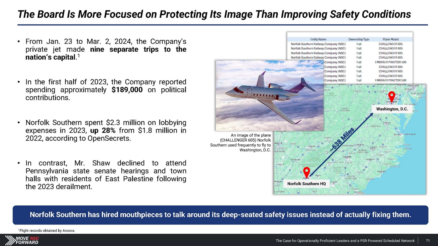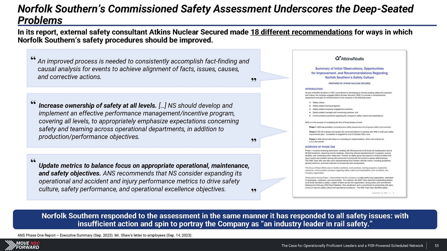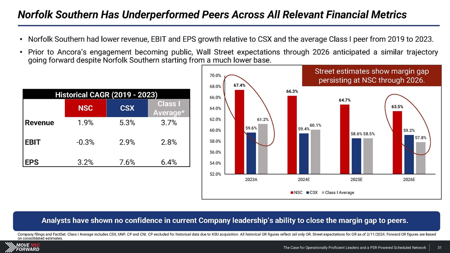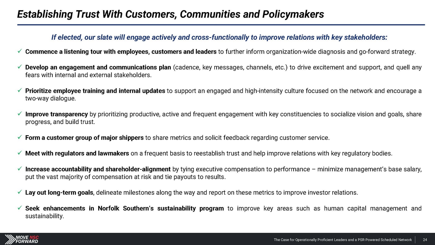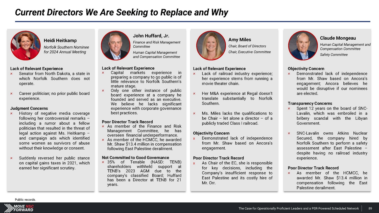 Shareholders and Sell - Side Analysts Support Our Campaign the board at NSC are warranted and could stimulate improved operations and thus equity performance. For these reasons, we intend to support the election of dissident nominees Betsy Atkins, James Barber, Jr., William Clyburn, Jr., Sameh Fahmy, John Kasich, Gilbert Lamphere, and Allison Landry. “ […] we believe a change in management and refreshment of ” “ We see value in potential management change with Jim Barber as CEO and Jamie Boychuk as COO as proposed by the activist investor Ancora … especially given the historical margin underperformance of Norfolk Southern.” ” and management would pose significant risk to service and safety. But in reality, NSC has already endured the most service and safety challenges in recent years , including the unfortunate events of East Palestine last year, and defective chassis across its network that impacted service and posed safety risks in 2021.” “ It appears NSC is making the case that changing the Board “ ” Deutsche Bank Feb. 27, 2024 ” Barclays Mar. 25, 2024 Neuberger Berman, 0.4% shareholder Apr. 5, 2024 We believe the status quo at NSC will lead to continued underperformance of the railroad. We also believe that Board refreshment and Jim Barber's and Jamie Boychuk's leadership are essential for enhancing safety and for ensuring outstanding long - term achievements for the benefit of all NSC's shareholders and other stakeholders. EdgePoint Investment Group, 1.38% shareholder Mar. 4, 2024 The Case for Operationally Proficient Leaders and a PSR - Powered Scheduled Network 97