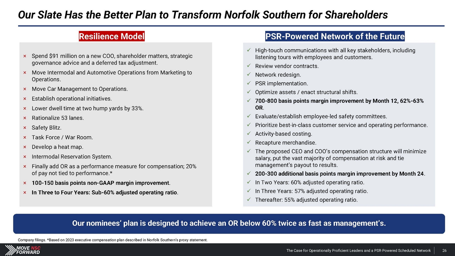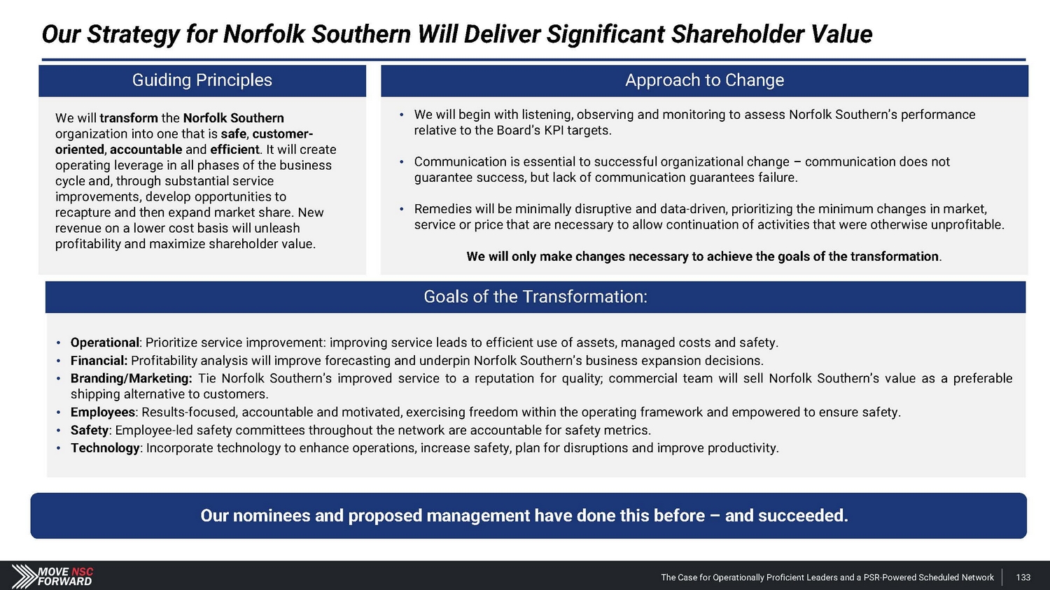 Our Strategy for Norfolk Southern Will Deliver Significant Shareholder Value We will transform the Norfolk Southern organization into one that is safe , customer - oriented , accountable and efficient . It will create operating leverage in all phases of the business cycle and, through substantial service improvements, develop opportunities to recapture and then expand market share. New revenue on a lower cost basis will unleash profitability and maximize shareholder value. Guiding Principles Approach to Change Our nominees and proposed management have done this before – and succeeded. • We will begin with listening, observing and monitoring to assess Norfolk Southern’s performance relative to the Board’s KPI targets. • Communication is essential to successful organizational change – communication does not guarantee success, but lack of communication guarantees failure. • Remedies will be minimally disruptive and data - driven, prioritizing the minimum changes in market, service or price that are necessary to allow continuation of activities that were otherwise unprofitable. We will only make changes necessary to achieve the goals of the transformation . • Operational : Prioritize service improvement: improving service leads to efficient use of assets, managed costs and safety. • Financial: Profitability analysis will improve forecasting and underpin Norfolk Southern’s business expansion decisions. • Branding/Marketing: Tie Norfolk Southern’s improved service to a reputation for quality; commercial team will sell Norfolk Southern’s value as a preferable shipping alternative to customers. • Employees : Results - focused, accountable and motivated, exercising freedom within the operating framework and empowered to ensure safety. • Safety : Employee - led safety committees throughout the network are accountable for safety metrics. • Technology : Incorporate technology to enhance operations, increase safety, plan for disruptions and improve productivity. Goals of the Transformation: The Case for Operationally Proficient Leaders and a PSR - Powered Scheduled Network 133