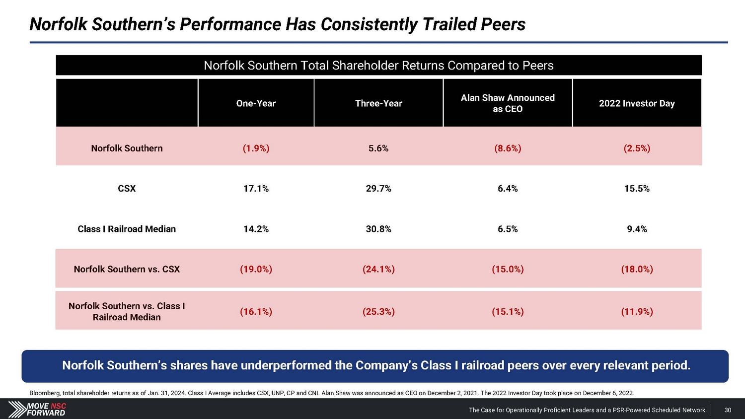 Relative TSR Methodology – Analytical Period • Norfolk Southern's total shareholder return was evaluated over the customary 1 - year and 3 - year periods, as well as since Alan Shaw’s appointment as CEO on Dec . 2 , 2021 , and the 2022 Investor Day on Dec . 6 , 2022 . – Peer Selection • The recommended peer for evaluation of Norfolk Southern's relative total shareholder return is CSX Corp, which is nearly identical to Norfolk Southern in terms of geographic footprint, track miles, and freight mix . Norfolk Southern’s FY 2023 annual report states, “Our primary rail competitor is CSX Corporation (CSX) ; both we and CSX operate throughout much of the same territory . ” – Benchmark Index Selection • The recommended benchmark index for Norfolk Southern is the median of all publicly traded Class I railroads . These railroads are Canadian National Railway , Canadian Pacific Kansas City , CSX Corp , and Union Pacific . The Company’s proxy statement from March 20 , 2024 , states that, “the [Compensation] Committee continues to believe that it is important to focus on a peer group of the other North American Class I railroads or their holding companies … ” Ticker NYSE: CSX NYSE: CNI NYSE: CP NYSE: UNP The Case for Operationally Proficient Leaders and a PSR - Powered Scheduled Network 186