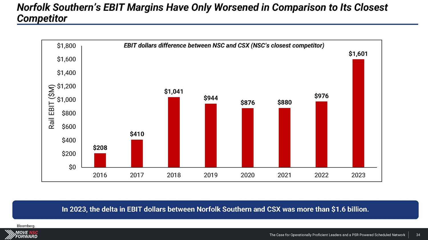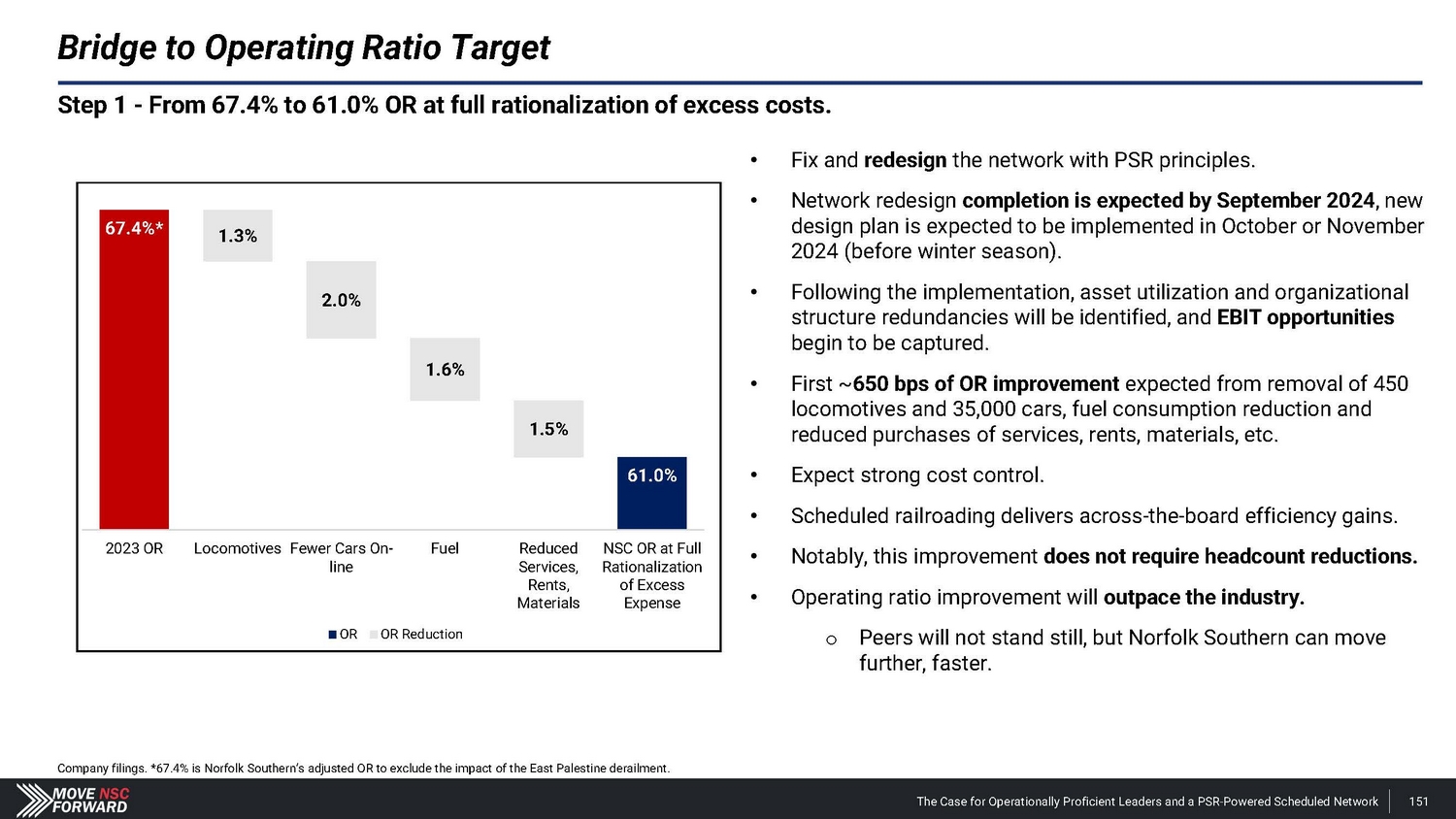 • Fix and redesign the network with PSR principles. • Network redesign completion is expected by September 2024 , new design plan is expected to be implemented in October or November 2024 (before winter season) . • Following the implementation, asset utilization and organizational structure redundancies will be identified, and EBIT opportunities begin to be captured. • First ~ 650 bps of OR improvement expected from removal of 450 locomotives and 35,000 cars, fuel consumption reduction and reduced purchases of services, rents, materials, etc. • Expect strong cost control. • Scheduled railroading delivers across - the - board efficiency gains. • Notably, this improvement does not require headcount reductions. • Operating ratio improvement will outpace the industry. o Peers will not stand still, but Norfolk Southern can move further, faster. Step 1 - From 67.4% to 61.0% OR at full rationalization of excess costs. Bridge to Operating Ratio Target 67.4 % * 61.0% 1.3% 2.0% 1.6% 1.5% 2023 OR Locomotives Fewer Cars On - line Fu e l Reduced NSC OR at Full Se rv i ces , Ra tion al i za ti o n Rents, of Excess M a terial s Ex pe n se OR OR Reduction Company filings. *67.4% is Norfolk Southern’s adjusted OR to exclude the impact of the East Palestine derailment. The Case for Operationally Proficient Leaders and a PSR - Powered Scheduled Network 151