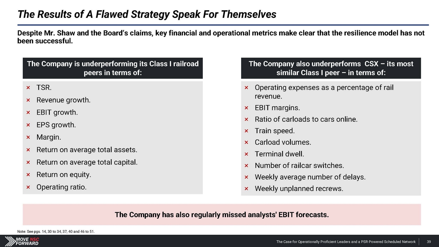 Our Solution: Take the Steps to Enable PSR Implementation at Norfolk Southern First : Leadership (CEO and Board) must acknowledge the need for a change in the strategy: • Management has rejected our case for change (though recent actions appear to acknowledge that change is needed). • The Board refuses to hold management to account for its underperformance. • To change Norfolk Southern’s strategy, a majority of the Board must be reconstituted, so that the new Board can get the right management team in place to implement PSR. Second : Norfolk Southern’s team must embrace the most important ingredients of PSR implementation: • Culture that prioritizes the network • Intensity • Engagement • Passion • Experience and teamwork • A sense of urgency • Attention to the details: daily metrics and failures, focus on employees and assets and ensuring quality service for customers Retraining Norfolk Southern’s employees to prioritize these ingredients requires a new management team, which can only be accomplished with a majority of the Board. The Case for Operationally Proficient Leaders and a PSR - Powered Scheduled Network 138