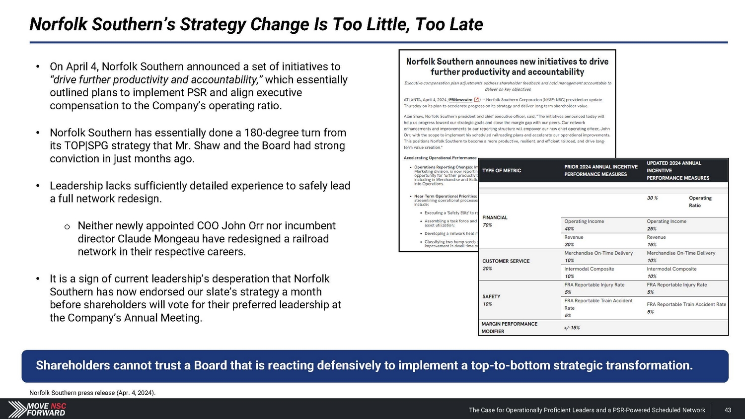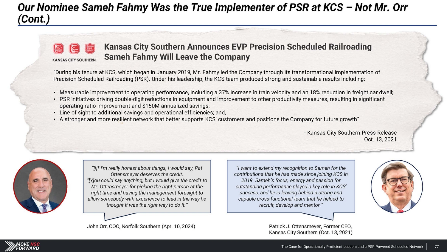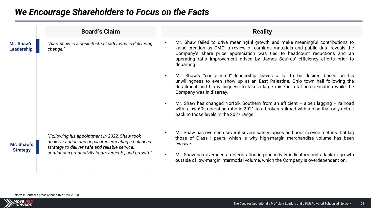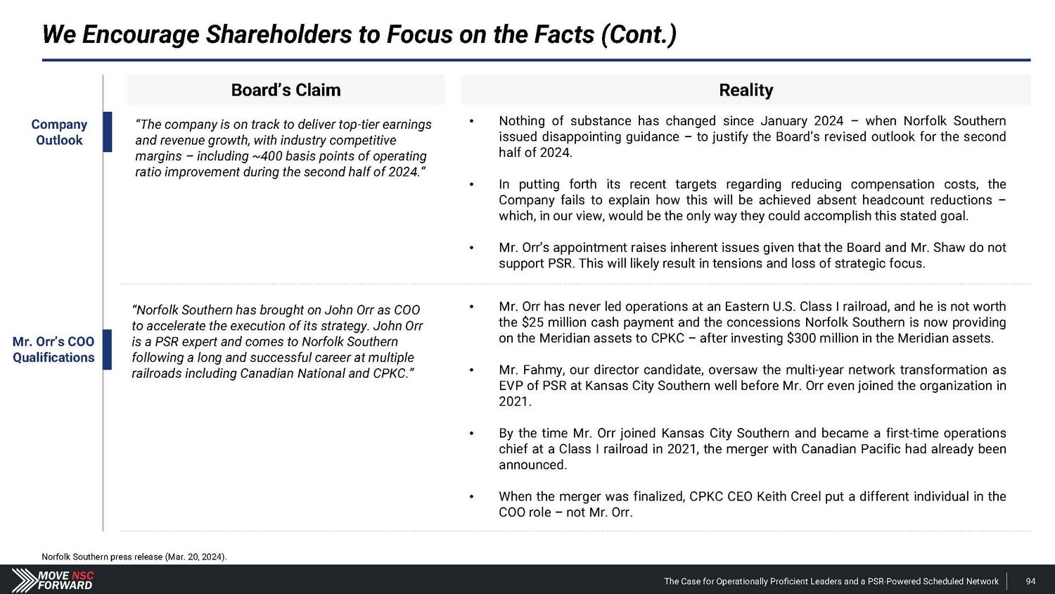 We Encourage Shareholders to Focus on the Facts (Cont.) Board’s Claim Reality “The company is on track to deliver top - tier earnings and revenue growth, with industry competitive margins – including ~400 basis points of operating ratio improvement during the second half of 2024.” • Nothing of substance has changed since January 2024 – when Norfolk Southern issued disappointing guidance – to justify the Board’s revised outlook for the second half of 2024 . • In putting forth its recent targets regarding reducing compensation costs, the Company fails to explain how this will be achieved absent headcount reductions – which, in our view, would be the only way they could accomplish this stated goal . • Mr . Orr’s appointment raises inherent issues given that the Board and Mr . Shaw do not support PSR . This will likely result in tensions and loss of strategic focus . Com p any Outlook Mr. Orr’s COO Quali f i c a t i o ns “Norfolk Southern has brought on John Orr as COO to accelerate the execution of its strategy. John Orr is a PSR expert and comes to Norfolk Southern following a long and successful career at multiple railroads including Canadian National and CPKC.” Norfolk Southern press release (Mar. 20, 2024). The Case for Operationally Proficient Leaders and a PSR - Powered Scheduled Network 94 • Mr . Orr has never led operations at an Eastern U . S . Class I railroad, and he is not worth the $ 25 million cash payment and the concessions Norfolk Southern is now providing on the Meridian assets to CPKC – after investing $ 300 million in the Meridian assets . • Mr . Fahmy, our director candidate, oversaw the multi - year network transformation as EVP of PSR at Kansas City Southern well before Mr . Orr even joined the organization in 2021 . • By the time Mr . Orr joined Kansas City Southern and became a first - time operations chief at a Class I railroad in 2021 , the merger with Canadian Pacific had already been announced . • When the merger was finalized, CPKC CEO Keith Creel put a different individual in the COO role – not Mr . Orr .