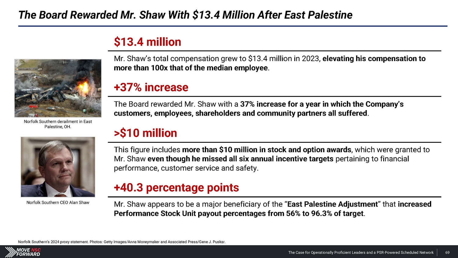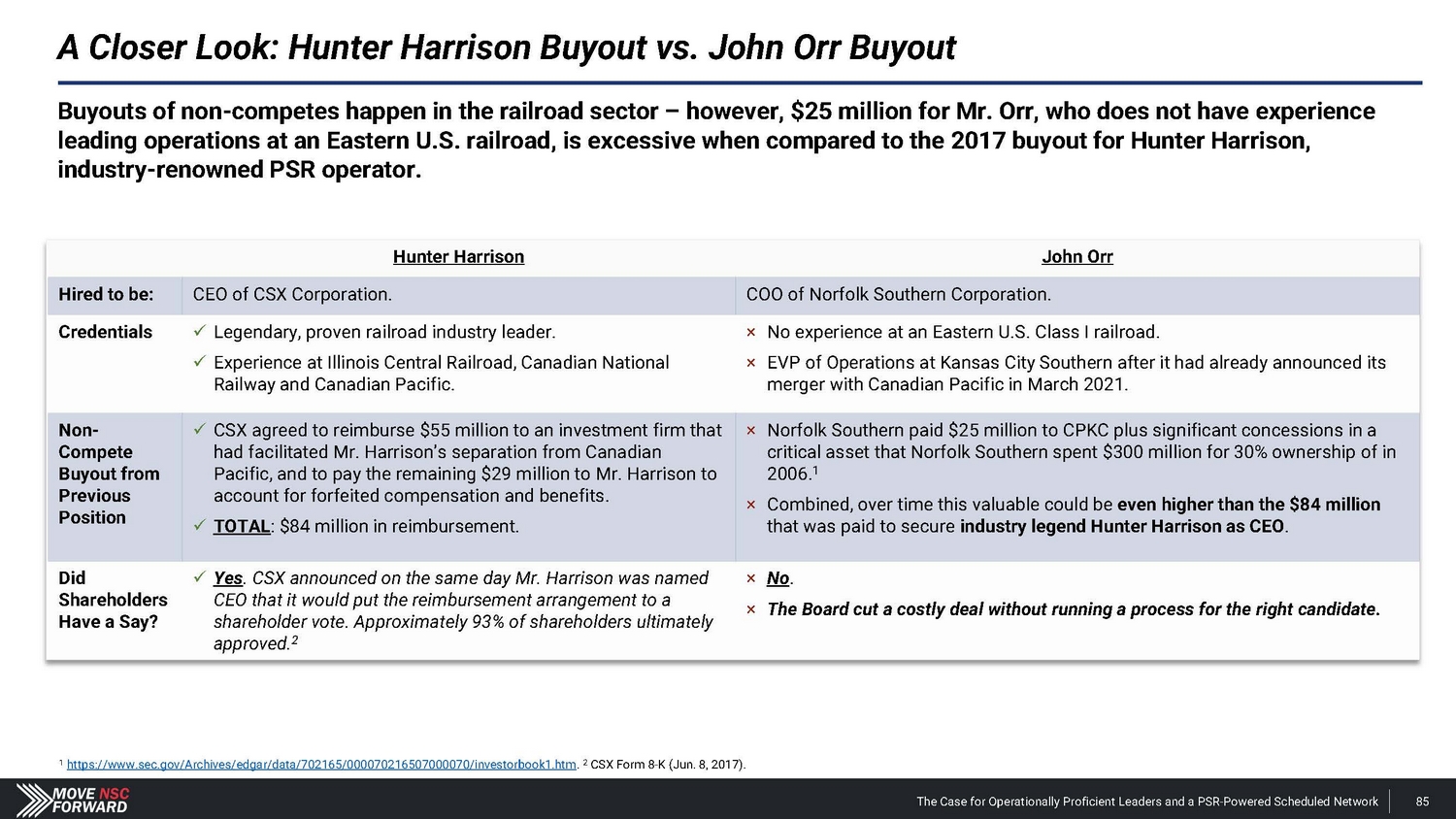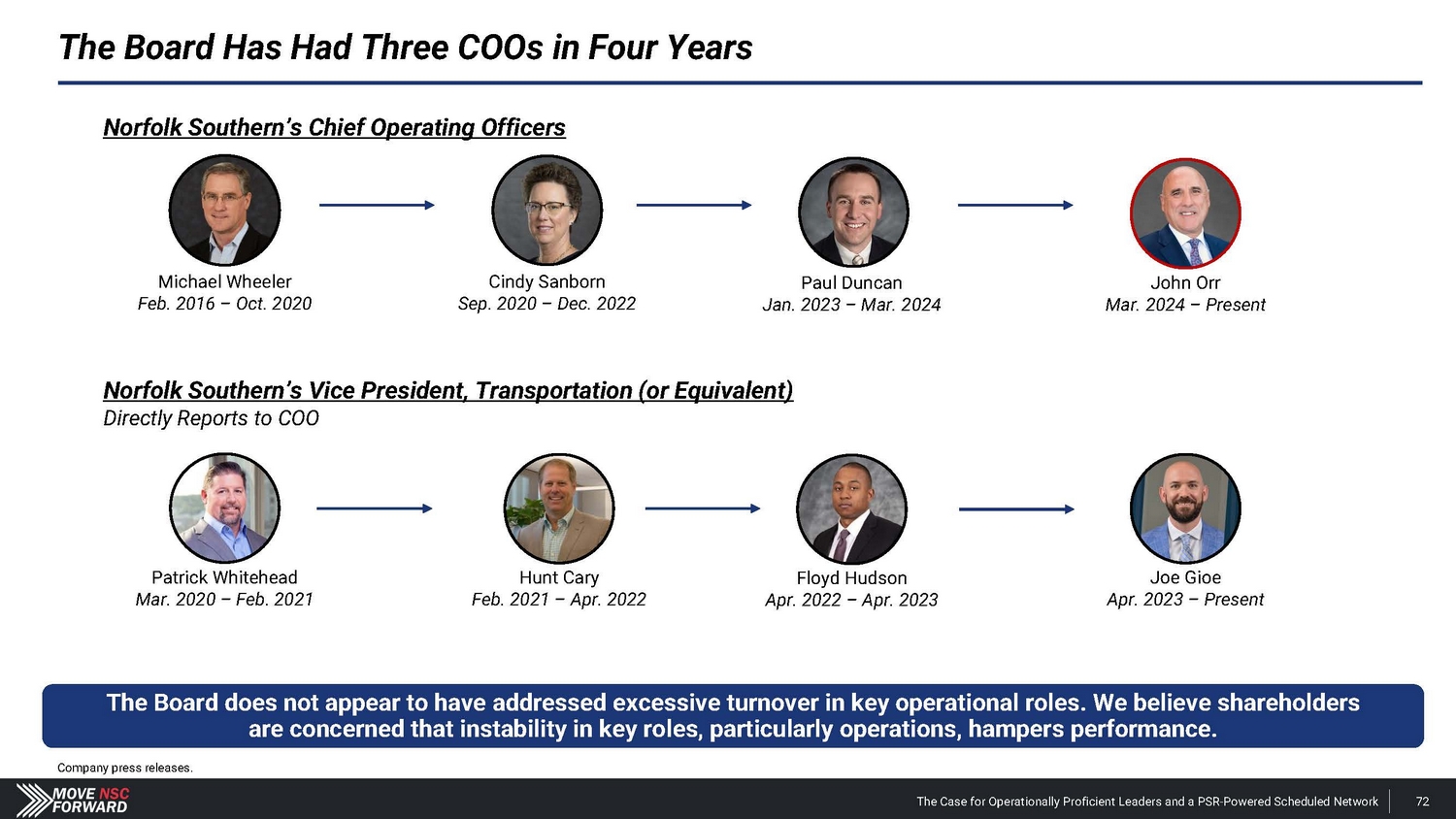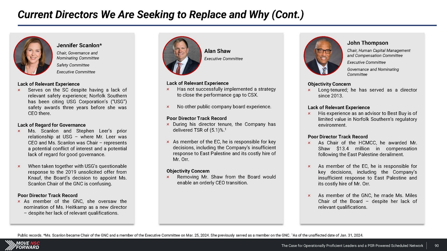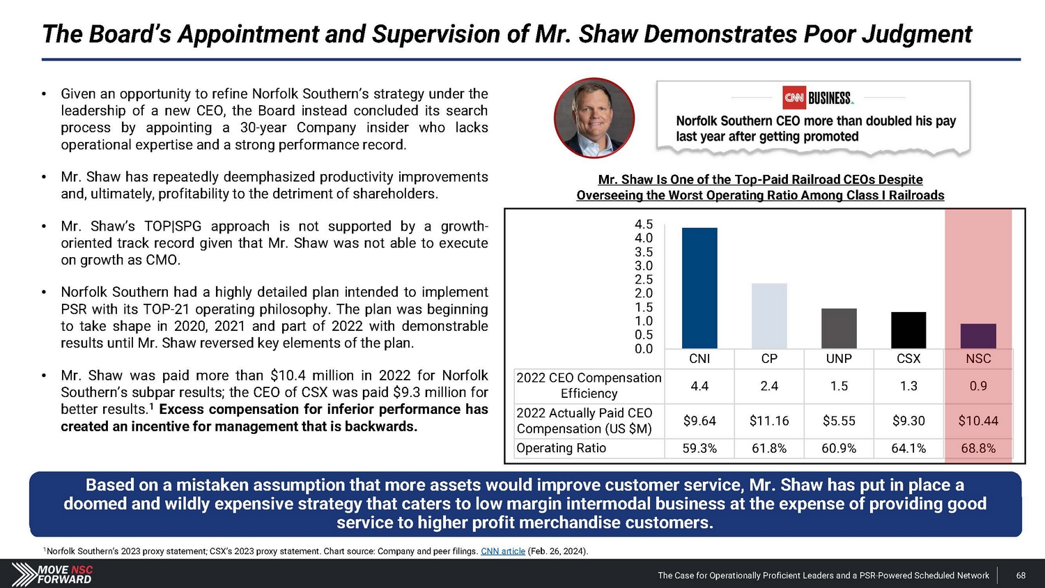 We Encourage Shareholders to Focus on the Facts (Cont.) Board’s Claim Reality “The company is on track to deliver top - tier earnings and revenue growth, with industry competitive margins – including ~400 basis points of operating ratio improvement during the second half of 2024.” • Nothing of substance has changed since January 2024 – when Norfolk Southern issued disappointing guidance – to justify the Board’s revised outlook for the second half of 2024 . • In putting forth its recent targets regarding reducing compensation costs, the Company fails to explain how this will be achieved absent headcount reductions – which, in our view, would be the only way they could accomplish this stated goal . • Mr . Orr’s appointment raises inherent issues given that the Board and Mr . Shaw do not support PSR . This will likely result in tensions and loss of strategic focus . Com p any Outlook Mr. Orr’s COO Quali f i c a t i o ns “Norfolk Southern has brought on John Orr as COO to accelerate the execution of its strategy. John Orr is a PSR expert and comes to Norfolk Southern following a long and successful career at multiple railroads including Canadian National and CPKC.” Norfolk Southern press release (Mar. 20, 2024). The Case for Operationally Proficient Leaders and a PSR - Powered Scheduled Network 94 • Mr . Orr has never led operations at an Eastern U . S . Class I railroad, and he is not worth the $ 25 million cash payment and the concessions Norfolk Southern is now providing on the Meridian assets to CPKC – after investing $ 300 million in the Meridian assets . • Mr . Fahmy, our director candidate, oversaw the multi - year network transformation as EVP of PSR at Kansas City Southern well before Mr . Orr even joined the organization in 2021 . • By the time Mr . Orr joined Kansas City Southern and became a first - time operations chief at a Class I railroad in 2021 , the merger with Canadian Pacific had already been announced . • When the merger was finalized, CPKC CEO Keith Creel put a different individual in the COO role – not Mr . Orr .