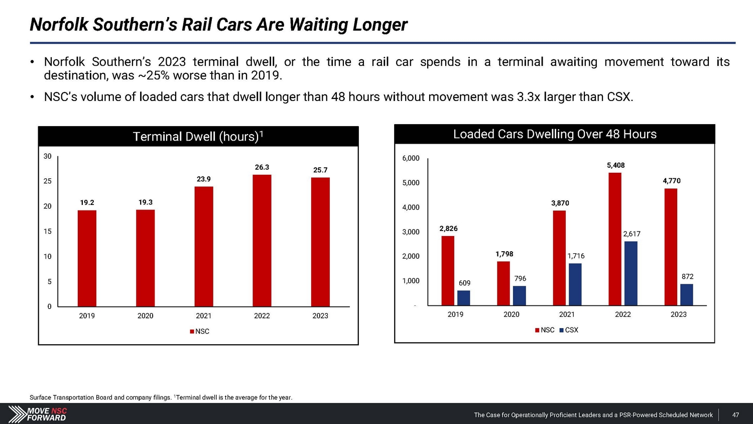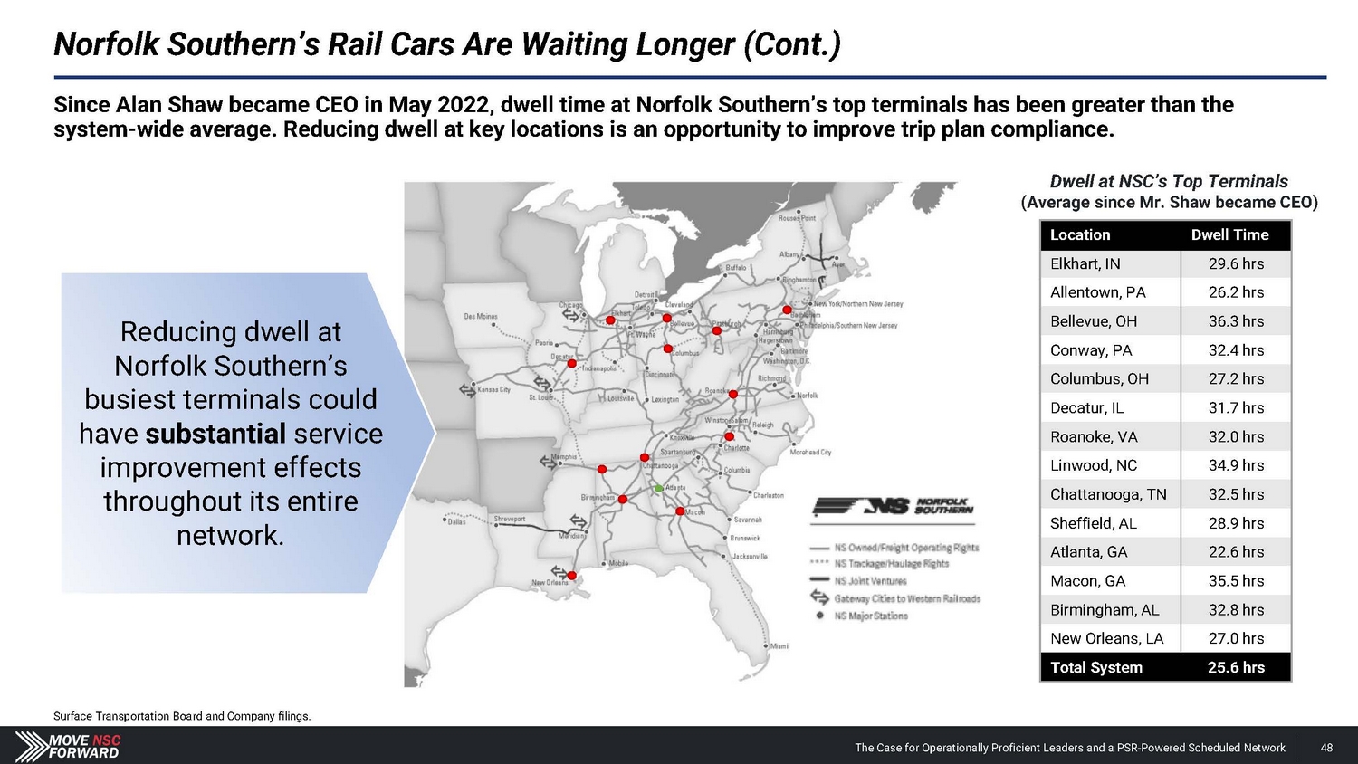 Projected Change in Cars On - line 175,000 170,239 165,000 155,000 145,000 135,239 135,000 125,612 125,000 115,000 NSC 2023 Avg. CSX 2023 Avg. NSC Projected Faster turn times reduce active cars online. Steps to a 62% to 63% OR at Norfolk Southern in 12 Months: Cars On - line 170,239 Cars on - line Remove 35,000 Cars ~$250M Opportunity* Action • Efficiently match carload demand to cars online • Reduce dwell • Increase velocity • Reduce car cycle • Reduce cars on - line by 35,000 cars (20% reduction) Output and Measure/Monitor • Car miles / day • Reduced car rents / reduced car hire • Reduced car maintenance expense *Conservative assumption of $20 per day per car, 365 days per year, assumes 35,000 cars removed. The Case for Operationally Proficient Leaders and a PSR - Powered Scheduled Network 153