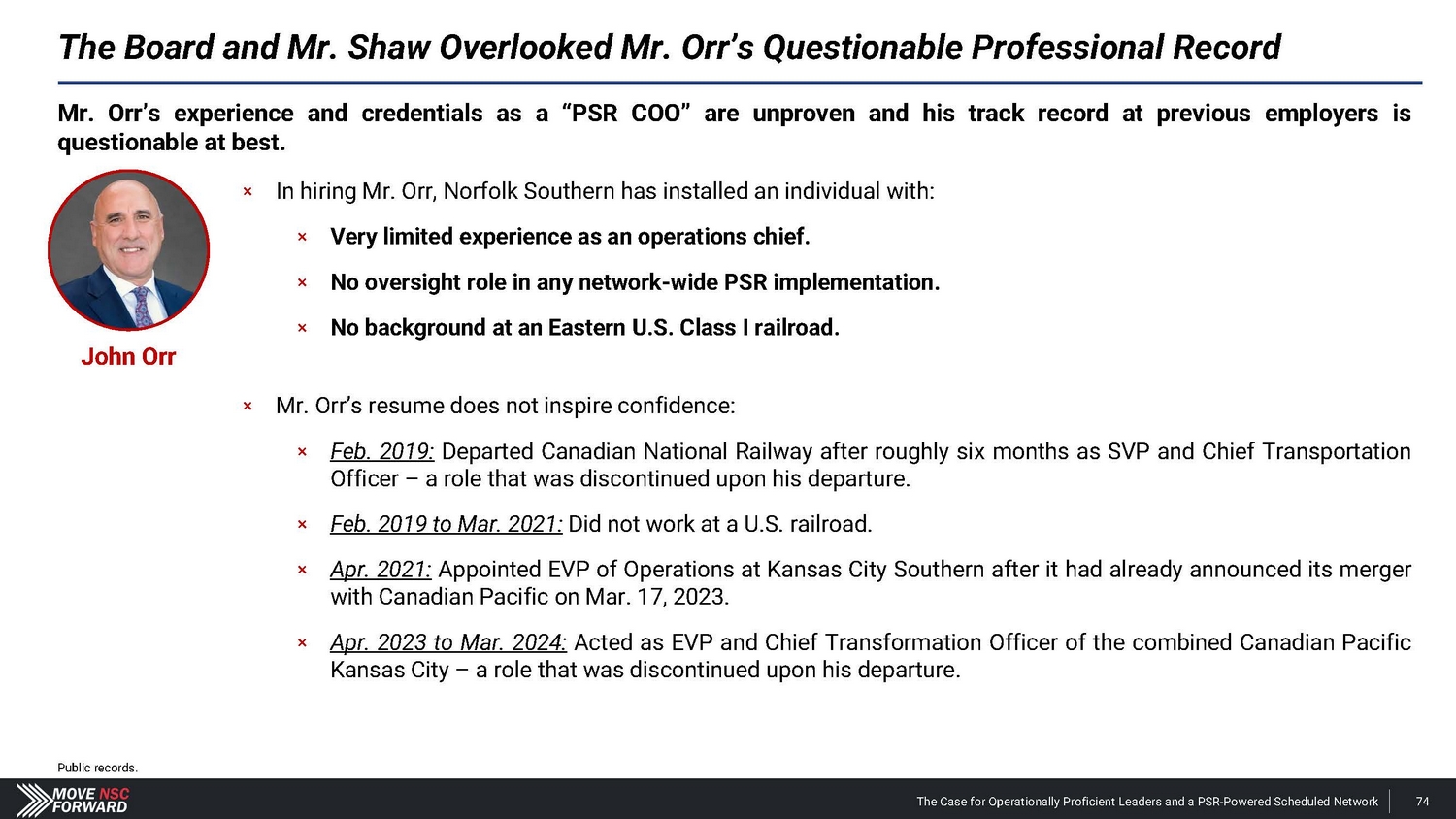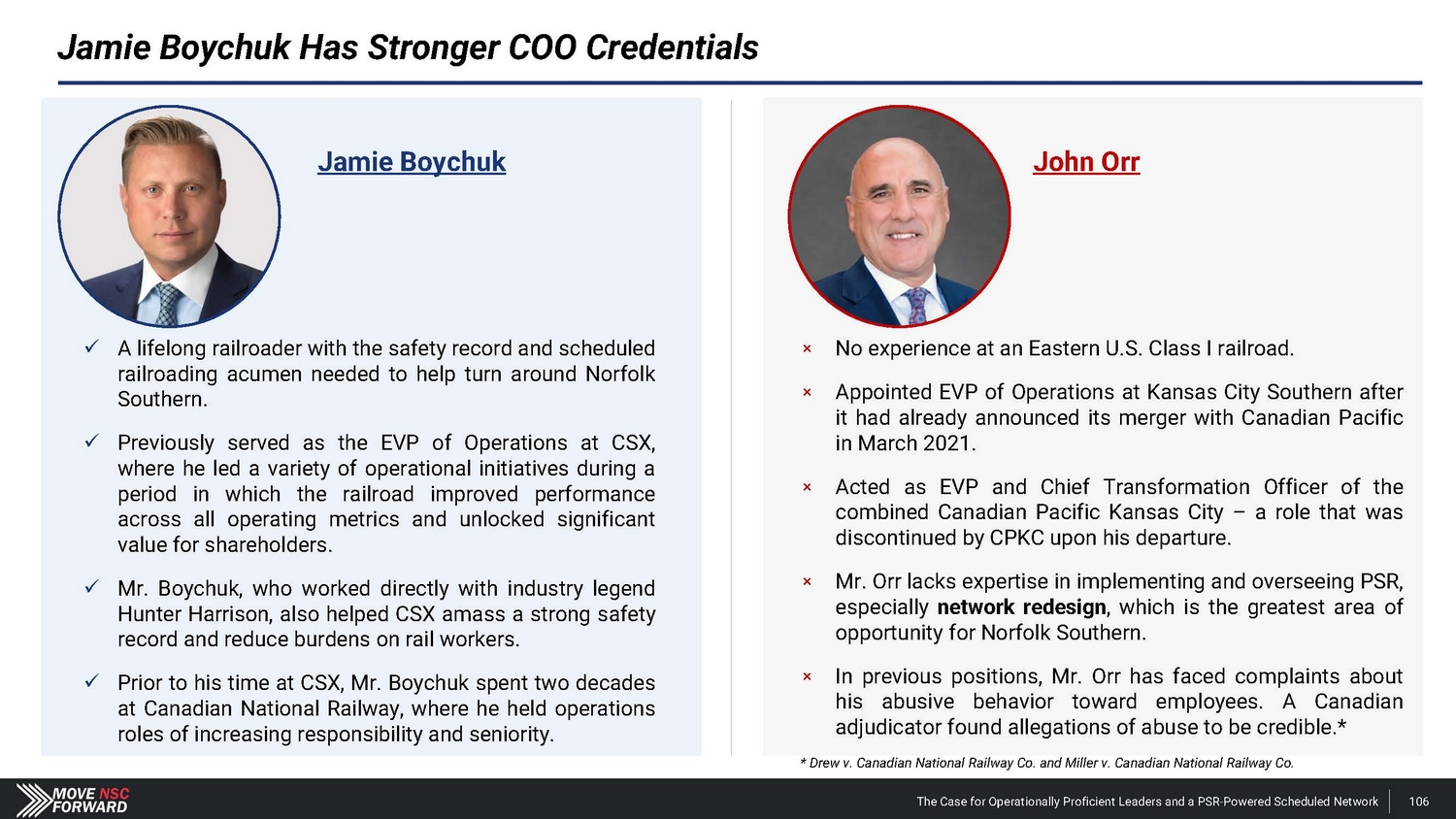 Jamie Boychuk Has Stronger COO Credentials Jamie Boychuk John Orr п No experience at an Eastern U.S. Class I railroad. п Appointed EVP of Operations at Kansas City Southern after it had already announced its merger with Canadian Pacific in March 2021 . п Acted as EVP and Chief Transformation Officer of the combined Canadian Pacific Kansas City – a role that was discontinued by CPKC upon his departure . п Mr . Orr lacks expertise in implementing and overseeing PSR, especially network redesign , which is the greatest area of opportunity for Norfolk Southern . п In previous positions, Mr . Orr has faced complaints about his abusive behavior toward employees . A Canadian adjudicator found allegations of abuse to be credible . * x A lifelong railroader with the safety record and scheduled railroading acumen needed to help turn around Norfolk Southern . x Previously served as the EVP of Operations at CSX, where he led a variety of operational initiatives during a period in which the railroad improved performance across all operating metrics and unlocked significant value for shareholders . x Mr . Boychuk, who worked directly with industry legend Hunter Harrison, also helped CSX amass a strong safety record and reduce burdens on rail workers . x Prior to his time at CSX, Mr . Boychuk spent two decades at Canadian National Railway, where he held operations roles of increasing responsibility and seniority . * Drew v. Canadian National Railway Co. and Miller v. Canadian National Railway Co. The Case for Operationally Proficient Leaders and a PSR - Powered Scheduled Network 106