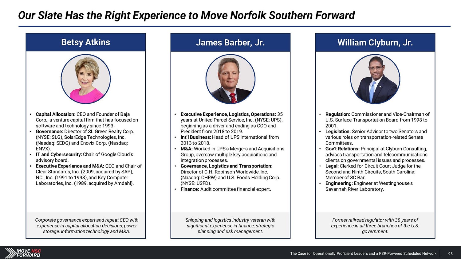 Our Slate Has the Right Experience to Move Norfolk Southern Forward Betsy Atkins • Capital Allocation: CEO and Founder of Baja Corp., a venture capital firm that has focused on software and technology since 1993. • Governance: Director of SL Green Realty Corp. (NYSE: SLG), SolarEdge Technologies, Inc. (Nasdaq: SEDG) and Enovix Corp. (Nasdaq: ENVX). • IT and Cybersecurity: Chair of Google Cloud’s advisory board and advisor to Jamf Holding Corp. (Nasdaq: JAMF). • Executive Experience and M&A: CEO and Chair of Clear Standards, Inc. (2009, acquired by SAP), NCI, Inc. (1991 to 1993), and Key Computer Laboratories, Inc. (1989, acquired by Amdahl). Corporate governance expert and repeat CEO with experience in capital allocation decisions, power storage, information technology and M&A. James Barber, Jr. • Executive Experience, Logistics, Operations: 35 years at United Parcel Service, Inc. (NYSE: UPS), beginning as a driver and ending as COO and President from 2018 to 2019. • Int’l Business: Head of UPS International from 2013 to 2018. • M&A: Worked in UPS's Mergers and Acquisitions Group, oversaw multiple key acquisitions and integration processes. • Governance, Logistics and Transportation: Director of C.H. Robinson Worldwide, Inc. (Nasdaq: CHRW) and U.S. Foods Holding Corp. (NYSE: USFD). • Finance: Audit committee financial expert. Shipping and logistics industry veteran with significant experience in finance, strategic planning and risk management. William Clyburn, Jr. • Regulation: Commissioner and Vice - Chairman of U.S. Surface Transportation Board from 1998 to 2001. • Legislation: Senior Advisor to two Senators and various roles on transportation - related Senate Committees. • Gov’t Relations : Principal at Clyburn Consulting, advises transportation and telecommunications clients on governmental issues and processes . • Legal: Clerked for Circuit Court Judge for the Second and Ninth Circuits, South Carolina; Member of SC Bar. • Engineering: Engineer at Westinghouse's Savannah River Laboratory. Former railroad regulator with 30 years of experience in all three branches of the U.S. government. The Case for Operationally Proficient Leaders and a PSR - Powered Scheduled Network 98