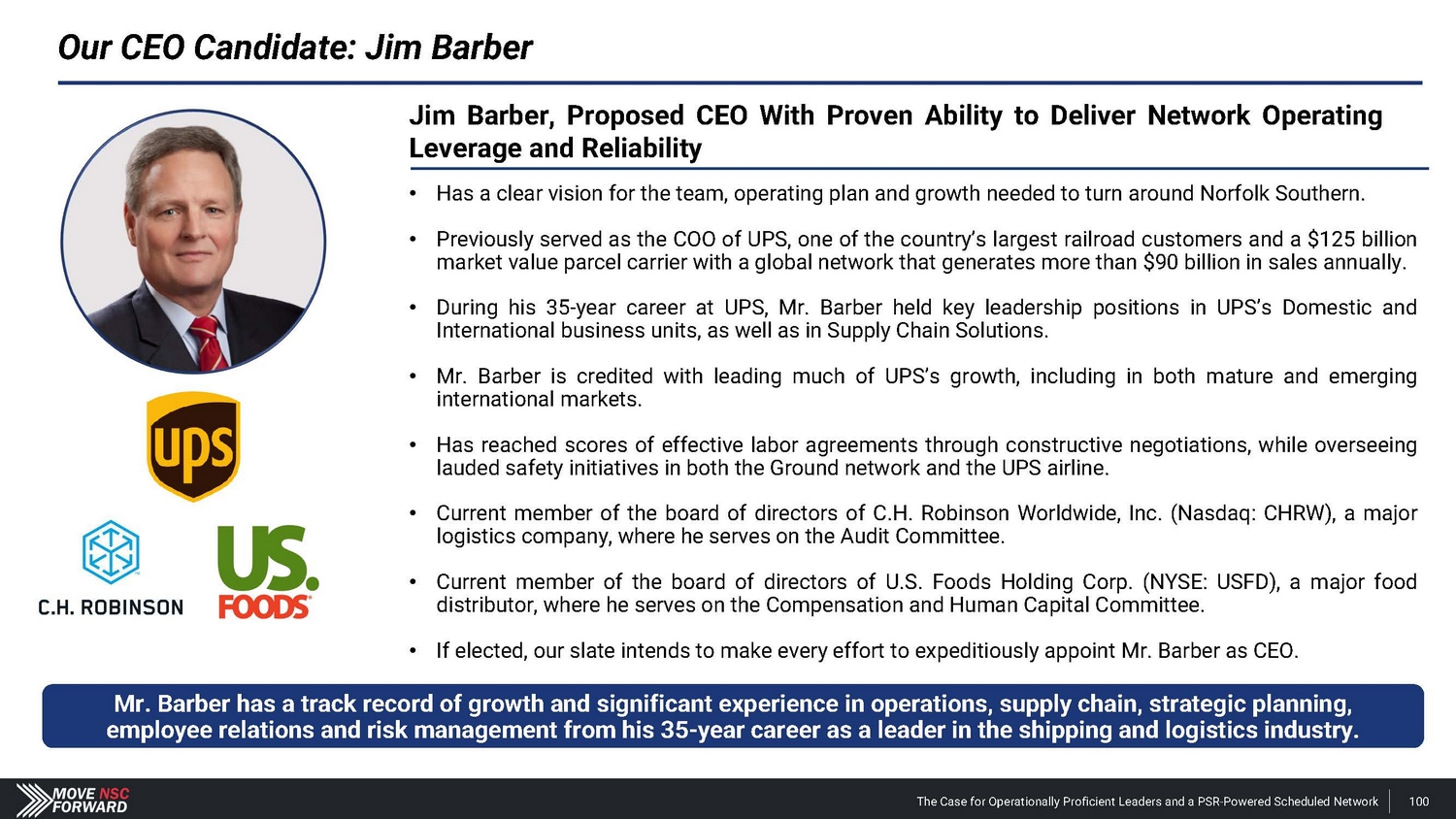 Our CEO Candidate: Jim Barber Jim Barber, Proposed CEO With Proven Ability to Deliver Network Operating Leverage and Reliability • Has a clear vision for the team, operating plan and growth needed to turn around Norfolk Southern. • Previously served as the COO of UPS, one of the country’s largest railroad customers and a $125 billion market value parcel carrier with a global network that generates more than $90 billion in sales annually. • During his 35 - year career at UPS, Mr. Barber held key leadership positions in UPS’s Domestic and International business units, as well as in Supply Chain Solutions. • Mr. Barber is credited with leading much of UPS’s growth, including in both mature and emerging international markets. • Has reached scores of effective labor agreements through constructive negotiations, while overseeing lauded safety initiatives in both the Ground network and the UPS airline. • Current member of the board of directors of C.H. Robinson Worldwide, Inc. (Nasdaq: CHRW), a major logistics company, where he serves on the Audit Committee. • Current member of the board of directors of U.S. Foods Holding Corp. (NYSE: USFD), a major food distributor, where he serves on the Compensation and Human Capital Committee. • If elected, our slate intends to make every effort to expeditiously appoint Mr. Barber as CEO. Mr. Barber has a track record of growth and significant experience in operations, supply chain, strategic planning, employee relations and risk management from his 35 - year career as a leader in the shipping and logistics industry. The Case for Operationally Proficient Leaders and a PSR - Powered Scheduled Network 100