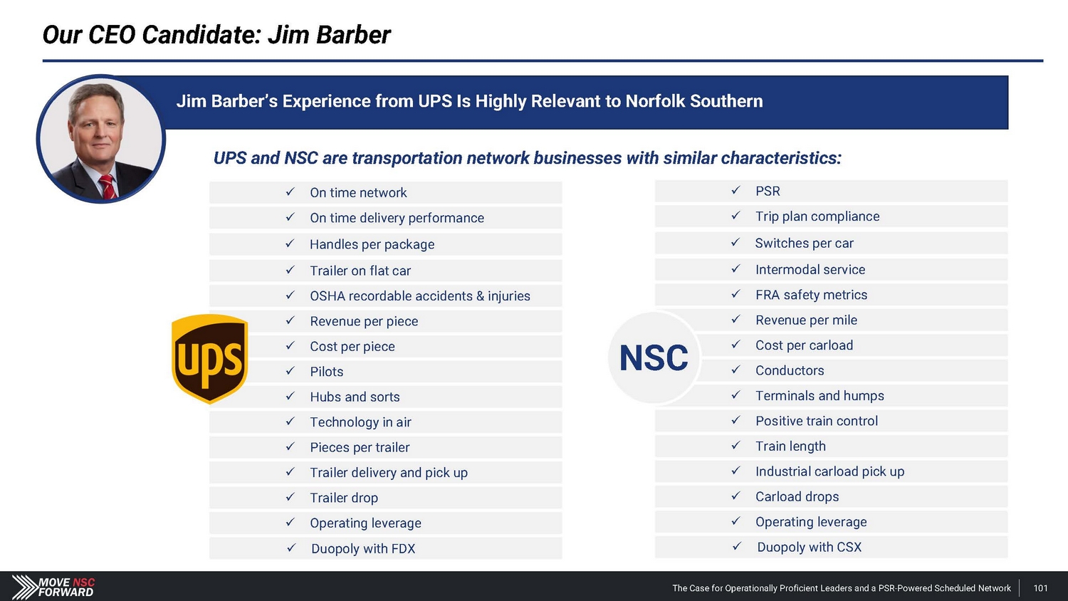 x On time network x On time delivery performance x Handles per package x Trailer on flat car x OSHA recordable accidents & injuries x Revenue per piece x Cost per piece x Pilots x Hubs and sorts x Technology in air x Pieces per trailer x Trailer delivery and pick up x Trailer drop x Operating leverage x Duopoly with FDX x PSR x Trip plan compliance x Intermodal service x FRA safety metrics x Conductors x Terminals and humps x Positive train control x Train length x Industrial carload pick up x Carload drops x Duopoly with CSX x Operating leverage x Revenue per mile x Cost per carload x Switches per car Our CEO Candidate: Jim Barber Jim Barber’s Experience from UPS Is Highly Relevant to Norfolk Southern UPS and NSC are transportation network businesses with similar characteristics: NSC The Case for Operationally Proficient Leaders and a PSR - Powered Scheduled Network 101