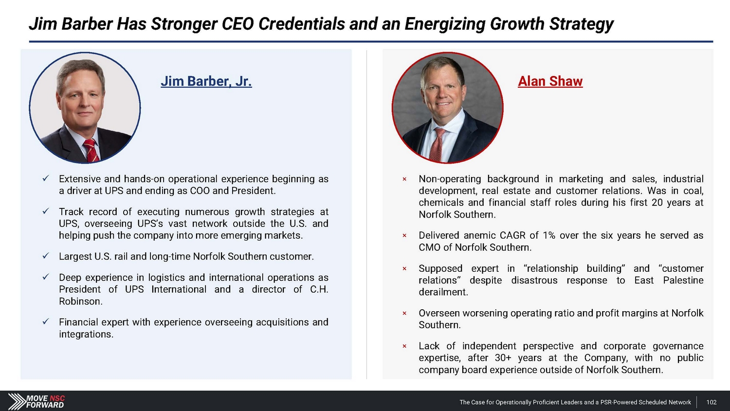 Jim Barber Has Stronger CEO Credentials and an Energizing Growth Strategy Jim Barber, Jr. x Extensive and hands - on operational experience beginning as a driver at UPS and ending as COO and President . x Track record of executing numerous growth strategies at UPS, overseeing UPS’s vast network outside the U . S . and helping push the company into more emerging markets . x Largest U.S. rail and long - time Norfolk Southern customer. x Deep experience in logistics and international operations as President of UPS International and a director of C . H . Robinson . x Financial expert with experience overseeing acquisitions and integrations . Alan Shaw п Non - operating background in marketing and sales, industrial development, real estate and customer relations . Was in coal, chemicals and financial staff roles during his first 20 years at Norfolk Southern . п Delivered anemic CAGR of 1 % over the six years he served as CMO of Norfolk Southern . п Supposed expert in “relationship building” and “customer relations” despite disastrous response to East Palestine derailment . п Overseen worsening operating ratio and profit margins at Norfolk Southern . п Lack of independent perspective and corporate governance expertise, after 30 + years at the Company, with no public company board experience outside of Norfolk Southern . The Case for Operationally Proficient Leaders and a PSR - Powered Scheduled Network 102
