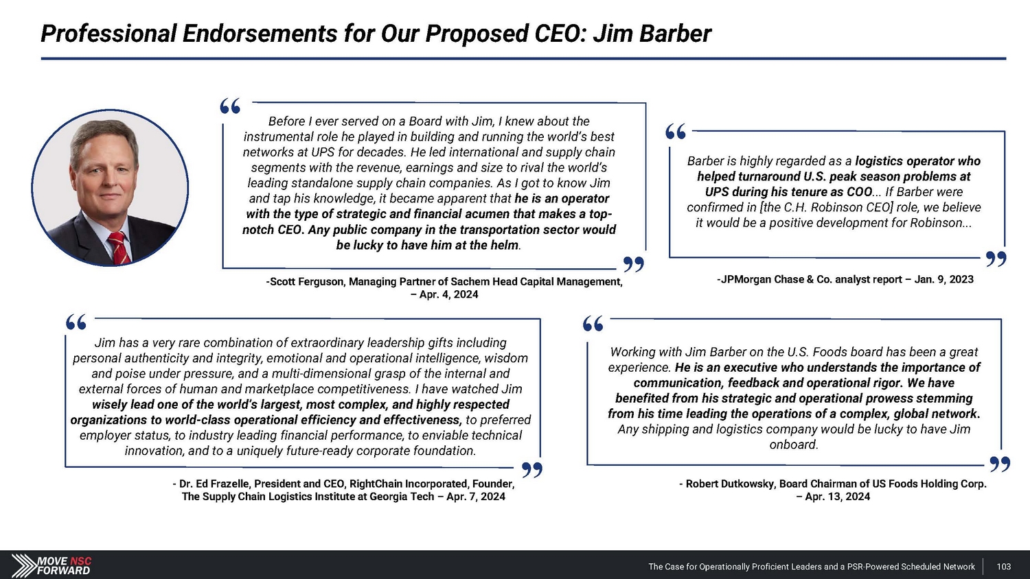 Professional Endorsements for Our Proposed CEO: Jim Barber - Scott Ferguson, Managing Partner of Sachem Head Capital Management, – Apr. 4, 2024 - Dr. Ed Frazelle, President and CEO, RightChain Incorporated, Founder, The Supply Chain Logistics Institute at Georgia Tech – Apr. 7, 2024 “ “ Jim has a very rare combination of extraordinary leadership gifts including personal authenticity and integrity, emotional and operational intelligence, wisdom and poise under pressure, and a multi - dimensional grasp of the internal and external forces of human and marketplace competitiveness. I have watched Jim wisely lead one of the world’s largest, most complex, and highly respected organizations to world - class operational efficiency and effectiveness, to preferred employer status, to industry leading financial performance, to enviable technical innovation, and to a uniquely future - ready corporate foundation. Before I ever served on a Board with Jim, I knew about the instrumental role he played in building and running the world’s best experience. He is an executive who understands the importance of communication, feedback and operational rigor. We have benefited from his strategic and operational prowess stemming from his time leading the operations of a complex, global network. Any shipping and logistics company would be lucky to have Jim onboard. “ Working with Jim Barber on the U.S. Foods board has been a great - Robert Dutkowsky, Board Chairman of US Foods Holding Corp. – Apr. 13, 2024 networks at UPS fo r decades. He l e d in t ern ationa l and supply cha in “ segments with the revenue, earnings and size to rival the world’s leading standalone supply chain companies. As I got to know Jim and tap his knowledge, it became apparent that he is an operator with the type of strategic and financial acumen that makes a top - notch CEO. Any public company in the transportation sector would be lucky to have him at the helm . The Case for Operationally Proficient Leaders and a PSR - Powered Scheduled Network 103 Barber is highly regarded as a logistics operator who helped turnaround U.S. peak season problems at UPS during his tenure as COO ... If Barber were confirmed in [the C.H. Robinson CEO] role, we believe it would be a positive development for Robinson... - JPMorgan Chase & Co. analyst report – Jan. 9, 2023