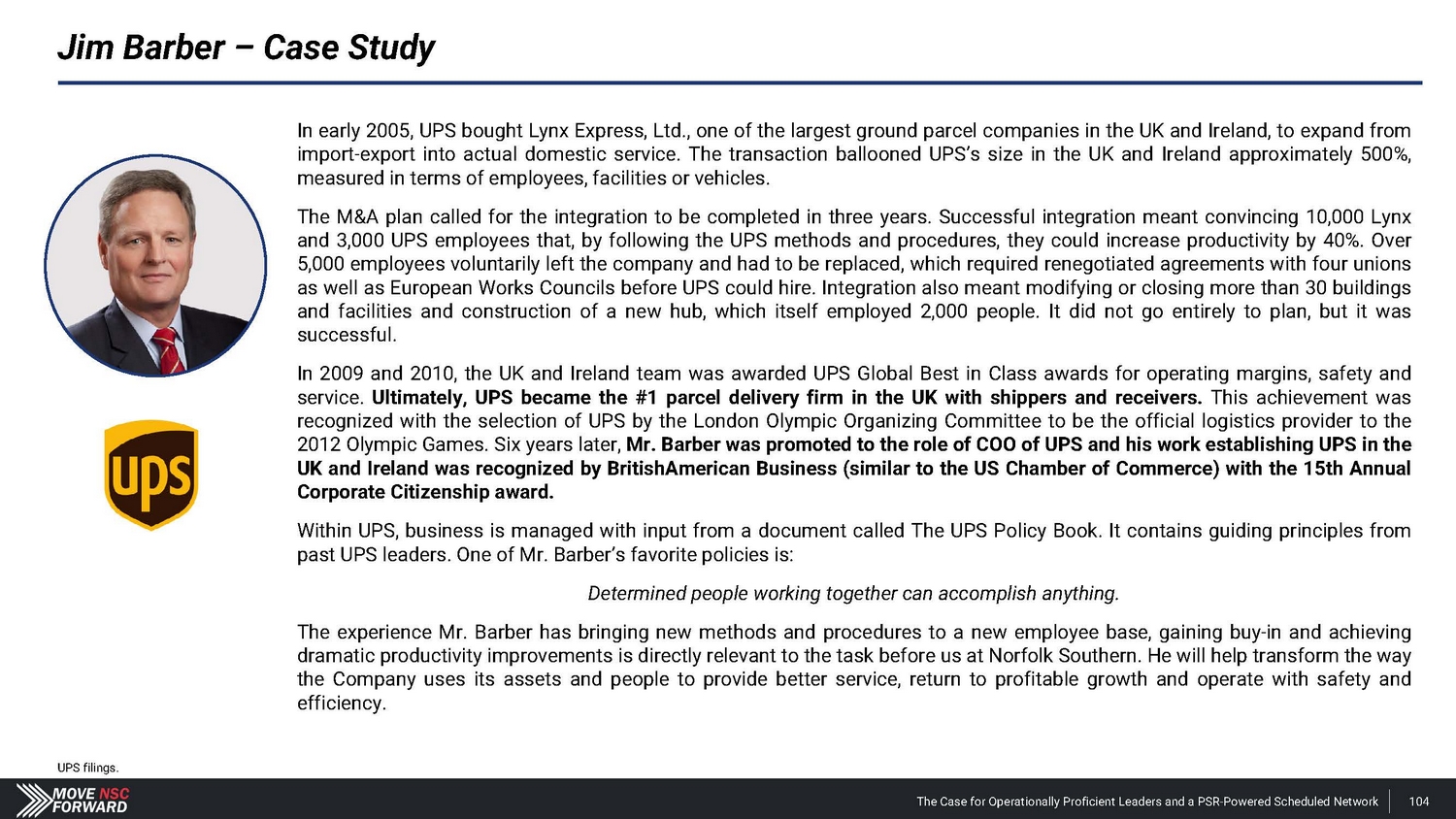 Jim Barber – Case Study In early 2005 , UPS bought Lynx Express, Ltd . , one of the largest ground parcel companies in the UK and Ireland, to expand from import - export into actual domestic service . The transaction ballooned UPS’s size in the UK and Ireland approximately 500 % , measured in terms of employees, facilities or vehicles . The M&A plan called for the integration to be completed in three years . Successful integration meant convincing 10 , 000 Lynx and 3 , 000 UPS employees that, by following the UPS methods and procedures, they could increase productivity by 40 % . Over 5 , 000 employees voluntarily left the company and had to be replaced, which required renegotiated agreements with four unions as well as European Works Councils before UPS could hire . Integration also meant modifying or closing more than 30 buildings and facilities and construction of a new hub, which itself employed 2 , 000 people . It did not go entirely to plan, but it was successful . In 2009 and 2010 , the UK and Ireland team was awarded UPS Global Best in Class awards for operating margins, safety and service . Ultimately, UPS became the # 1 parcel delivery firm in the UK with shippers and receivers . This achievement was recognized with the selection of UPS by the London Olympic Organizing Committee to be the official logistics provider to the 2012 Olympic Games . Six years later, Mr . Barber was promoted to the role of COO of UPS and his work establishing UPS in the UK and Ireland was recognized by BritishAmerican Business (similar to the US Chamber of Commerce) with the 15 th Annual Corporate Citizenship award . Within UPS, business is managed with input from a document called The UPS Policy Book . It contains guiding principles from past UPS leaders . One of Mr . Barber’s favorite policies is : Determined people working together can accomplish anything. The experience Mr . Barber has bringing new methods and procedures to a new employee base, gaining buy - in and achieving dramatic productivity improvements is directly relevant to the task before us at Norfolk Southern . He will help transform the way the Company uses its assets and people to provide better service, return to profitable growth and operate with safety and efficiency . UPS filings. The Case for Operationally Proficient Leaders and a PSR - Powered Scheduled Network 104