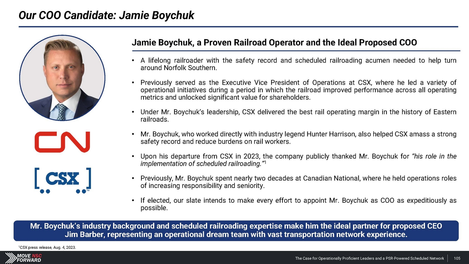 Our COO Candidate: Jamie Boychuk Jamie Boychuk, a Proven Railroad Operator and the Ideal Proposed COO • A lifelong railroader with the safety record and scheduled railroading acumen needed to help turn around Norfolk Southern . • Previously served as the Executive Vice President of Operations at CSX, where he led a variety of operational initiatives during a period in which the railroad improved performance across all operating metrics and unlocked significant value for shareholders . • Under Mr . Boychuk’s leadership, CSX delivered the best rail operating margin in the history of Eastern railroads . • Mr . Boychuk, who worked directly with industry legend Hunter Harrison, also helped CSX amass a strong safety record and reduce burdens on rail workers . • Upon his departure from CSX in 2023 , the company publicly thanked Mr . Boychuk for “his role in the implementation of scheduled railroading . ” 1 • Previously, Mr . Boychuk spent nearly two decades at Canadian National, where he held operations roles of increasing responsibility and seniority . • If elected, our slate intends to make every effort to appoint Mr . Boychuk as COO as expeditiously as possible . Mr. Boychuk’s industry background and scheduled railroading expertise make him the ideal partner for proposed CEO Jim Barber, representing an operational dream team with vast transportation network experience. 1 CSX press release, Aug. 4, 2023. The Case for Operationally Proficient Leaders and a PSR - Powered Scheduled Network 105