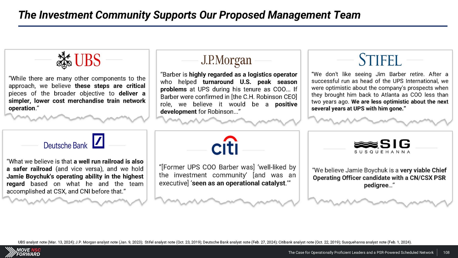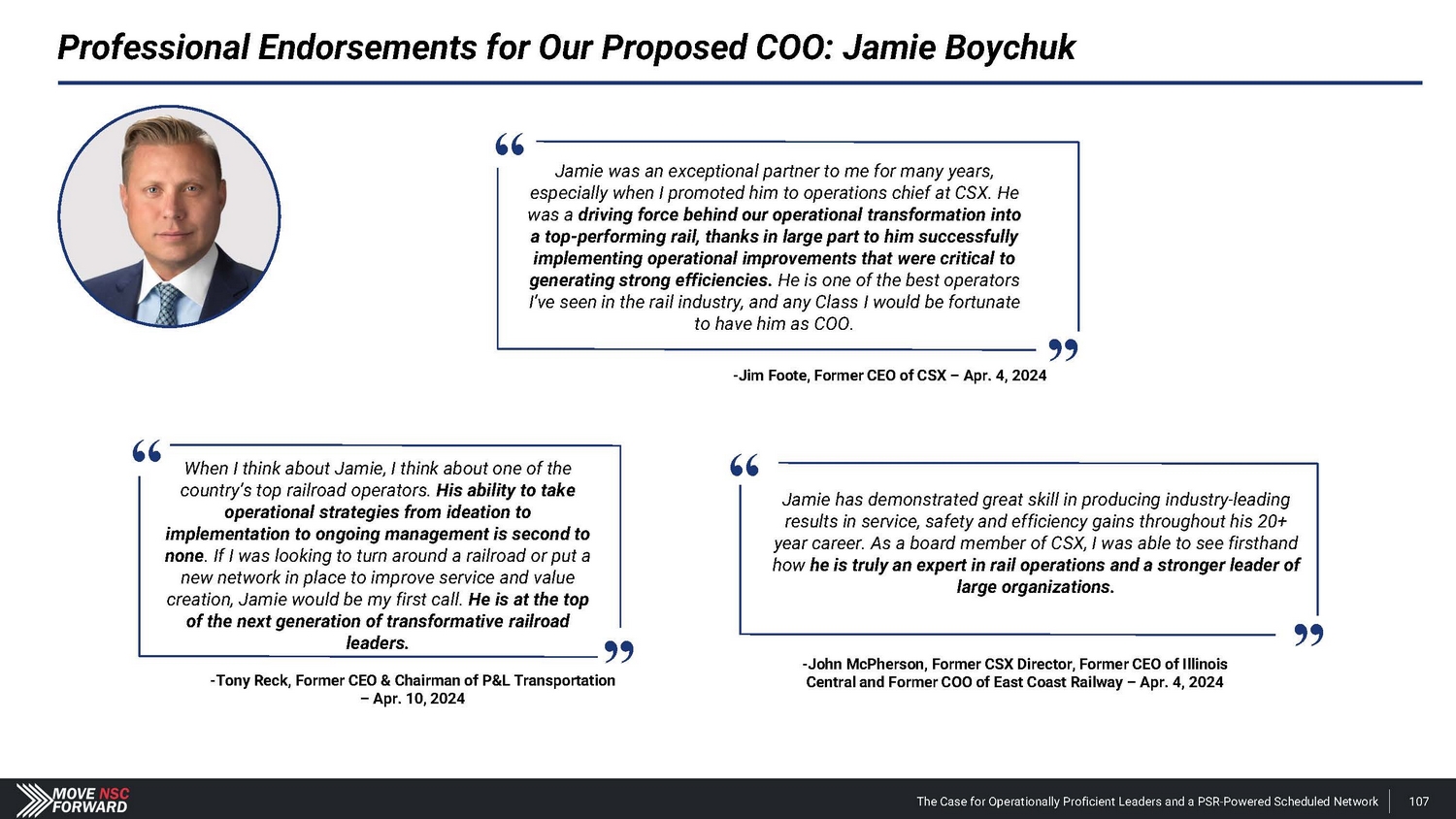 Professional Endorsements for Our Proposed COO: Jamie Boychuk Jamie was an exceptional partner to me for many years, especially when I promoted him to operations chief at CSX. He “ was a driving force behind our operational transformation into a top - performing rail, thanks in large part to him successfully implementing operational improvements that were critical to generating strong efficiencies. He is one of the best operators I’ve seen in the rail industry, and any Class I would be fortunate to have him as COO. - Jim Foote, Former CEO of CSX – Apr. 4, 2024 Jamie has demonstrated great skill in producing industry - leading results in service, safety and efficiency gains throughout his 20+ year career. As a board member of CSX, I was able to see firsthand how he is truly an expert in rail operations and a stronger leader of large organizations. “ When I think about Jamie, I think about one of the country’s top railroad operators. His ability to take operational strategies from ideation to implementation to ongoing management is second to none . If I was looking to turn around a railroad or put a new network in place to improve service and value creation, Jamie would be my first call. He is at the top of the next generation of transformative railroad leaders. “ The Case for Operationally Proficient Leaders and a PSR - Powered Scheduled Network 107 - Tony Reck, Former CEO & Chairman of P&L Transportation – Apr. 10, 2024 - John McPherson, Former CSX Director, Former CEO of Illinois Central and Former COO of East Coast Railway – Apr. 4, 2024