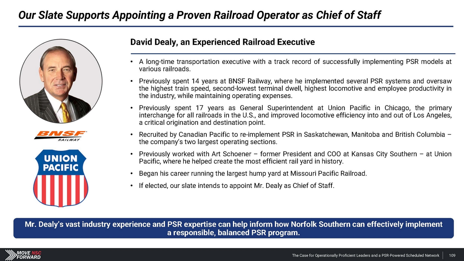 Our Slate Supports Appointing a Proven Railroad Operator as Chief of Staff Mr. Dealy’s vast industry experience and PSR expertise can help inform how Norfolk Southern can effectively implement a responsible, balanced PSR program. David Dealy, an Experienced Railroad Executive • A long - time transportation executive with a track record of successfully implementing PSR models at various railroads . • Previously spent 14 years at BNSF Railway, where he implemented several PSR systems and oversaw the highest train speed, second - lowest terminal dwell, highest locomotive and employee productivity in the industry, while maintaining operating expenses . • Previously spent 17 years as General Superintendent at Union Pacific in Chicago, the primary interchange for all railroads in the U . S . , and improved locomotive efficiency into and out of Los Angeles, a critical origination and destination point . • Recruited by Canadian Pacific to re - implement PSR in Saskatchewan, Manitoba and British Columbia – the company’s two largest operating sections. • Previously worked with Art Schoener – former President and COO at Kansas City Southern – at Union Pacific, where he helped create the most efficient rail yard in history. • Began his career running the largest hump yard at Missouri Pacific Railroad. • If elected, our slate intends to appoint Mr. Dealy as Chief of Staff. The Case for Operationally Proficient Leaders and a PSR - Powered Scheduled Network 109
